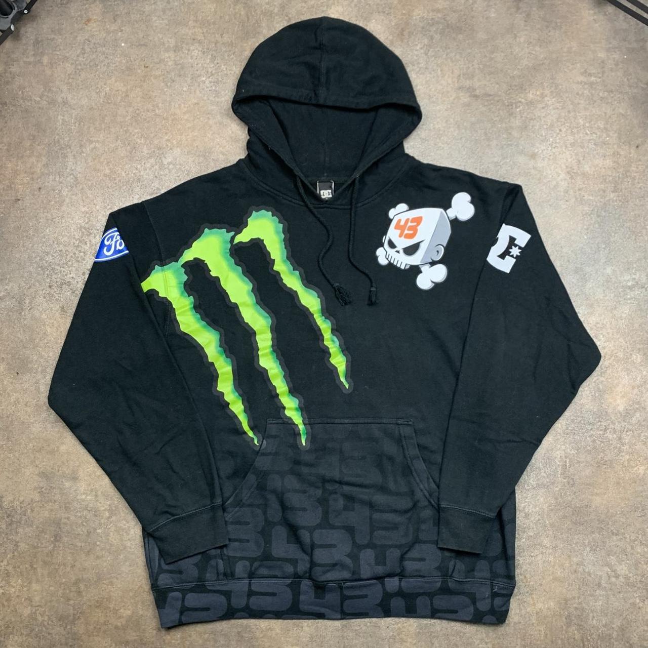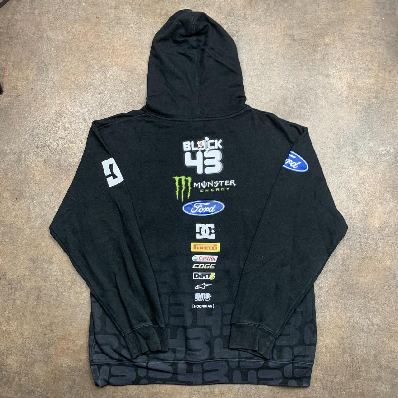 Crazy DC Shoes hoodie in collaboration with Monster & Ken Block featuring graphics all over with other brands featured including ford, firelli, alpinestars and more, faded grey 43 repeated graphic towards the bottom, coloured black all over & in excellent second hand condition with minimal wear.
