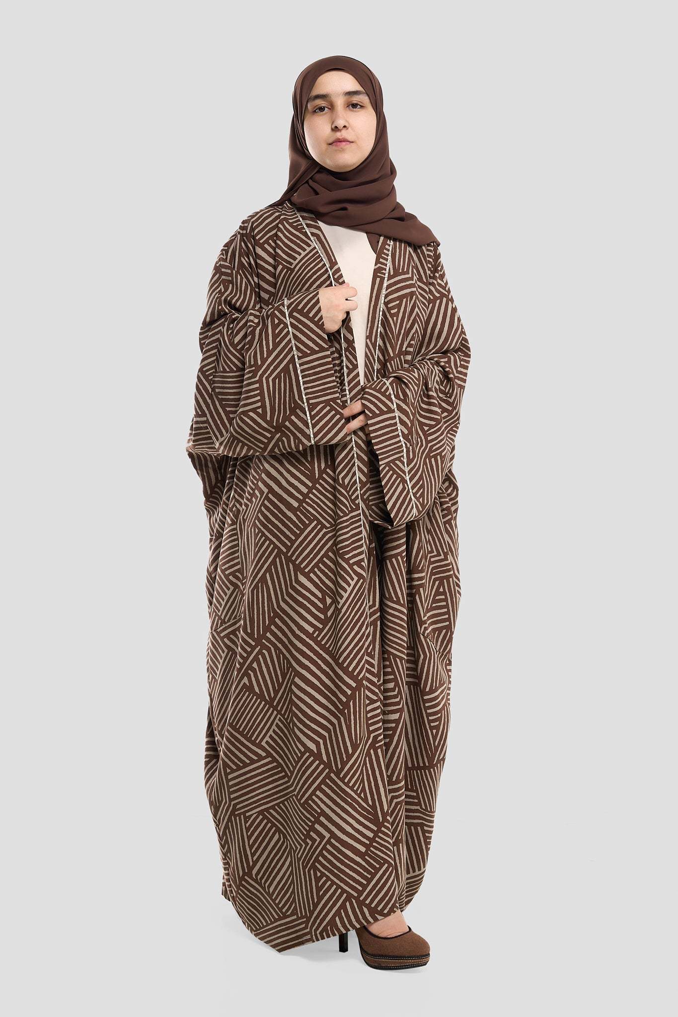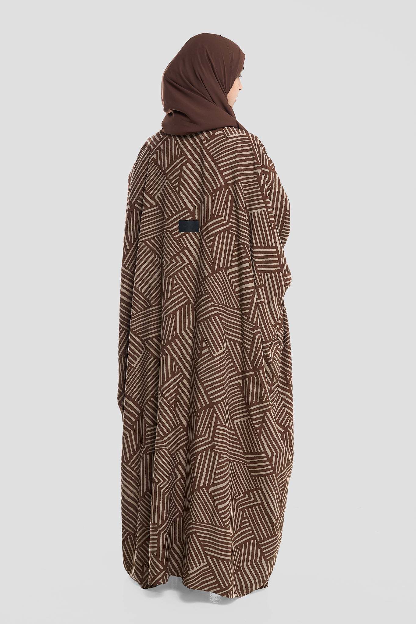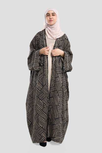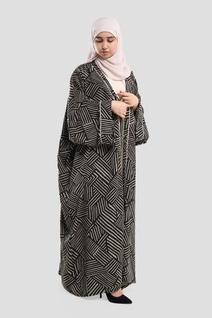 Geometric Pattern Abaya – Premium Modest Wear Elevate your style with this black geometric pattern abaya, designed for women who appreciate modern elegance. Crafted from high-quality, breathable fabric, this abaya features a bold maze-inspired print in neutral tones, wide sleeves, and a loose, flowy fit for all-day comfort. Perfect as a stylish abaya for casual outings or special occasions, it pairs beautifully with neutral or contrasting hijabs for a complete look.