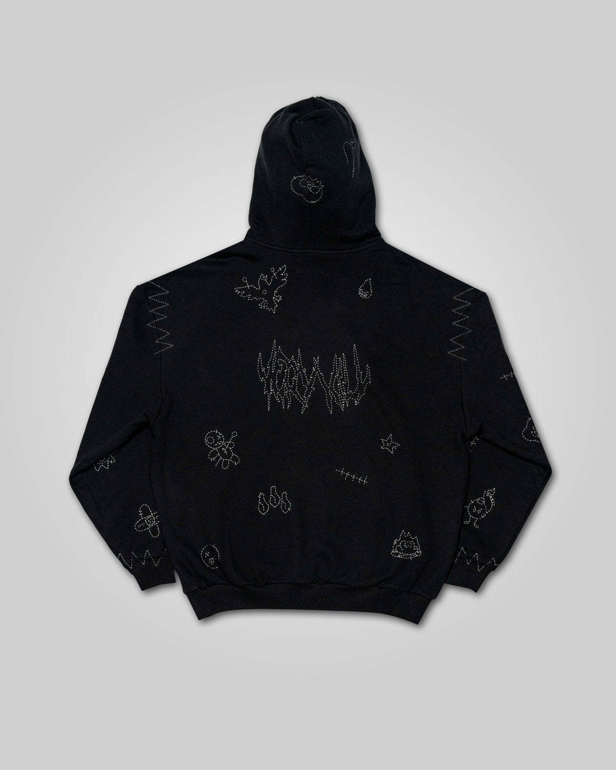 - Overlay hood with custom evil sun snap button closure