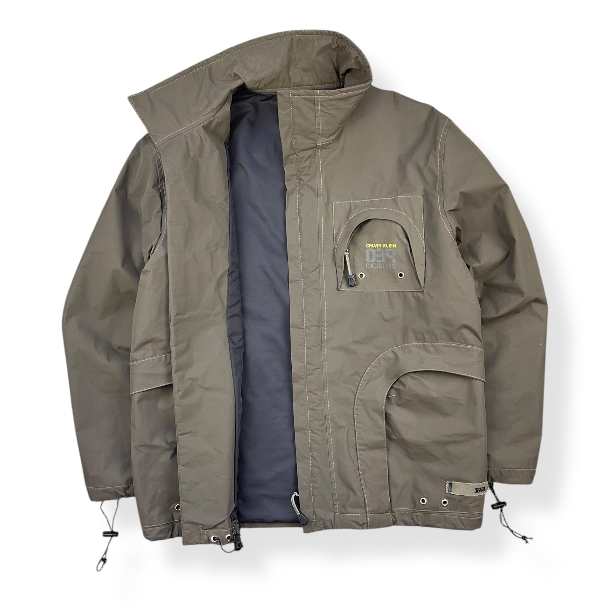 Early 2000's CK Jeans. Two large zipped pockets & stash zipped pocket on the chest, elasticated waist hem & cuffs, padded interior, waxy feel exterior fabric.
