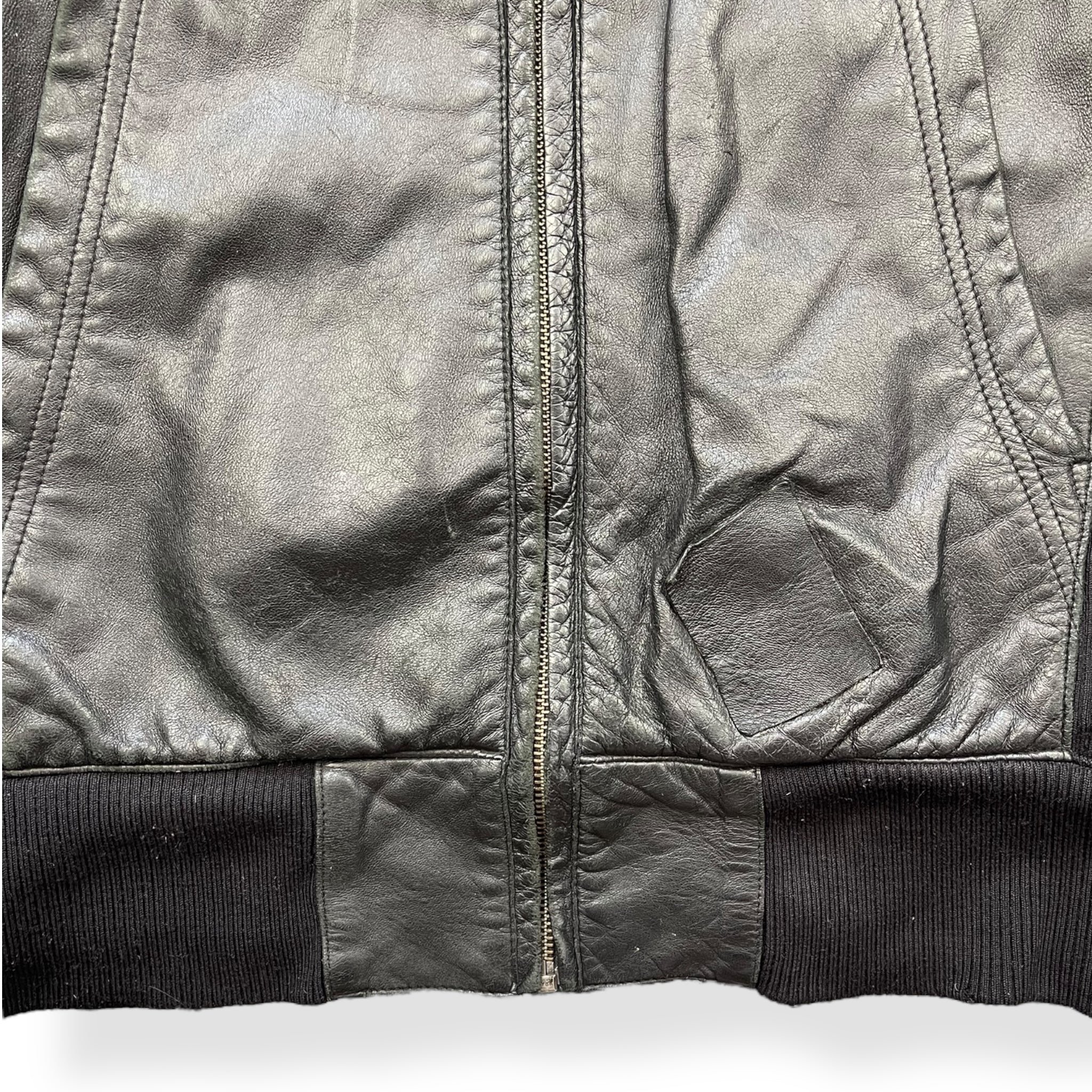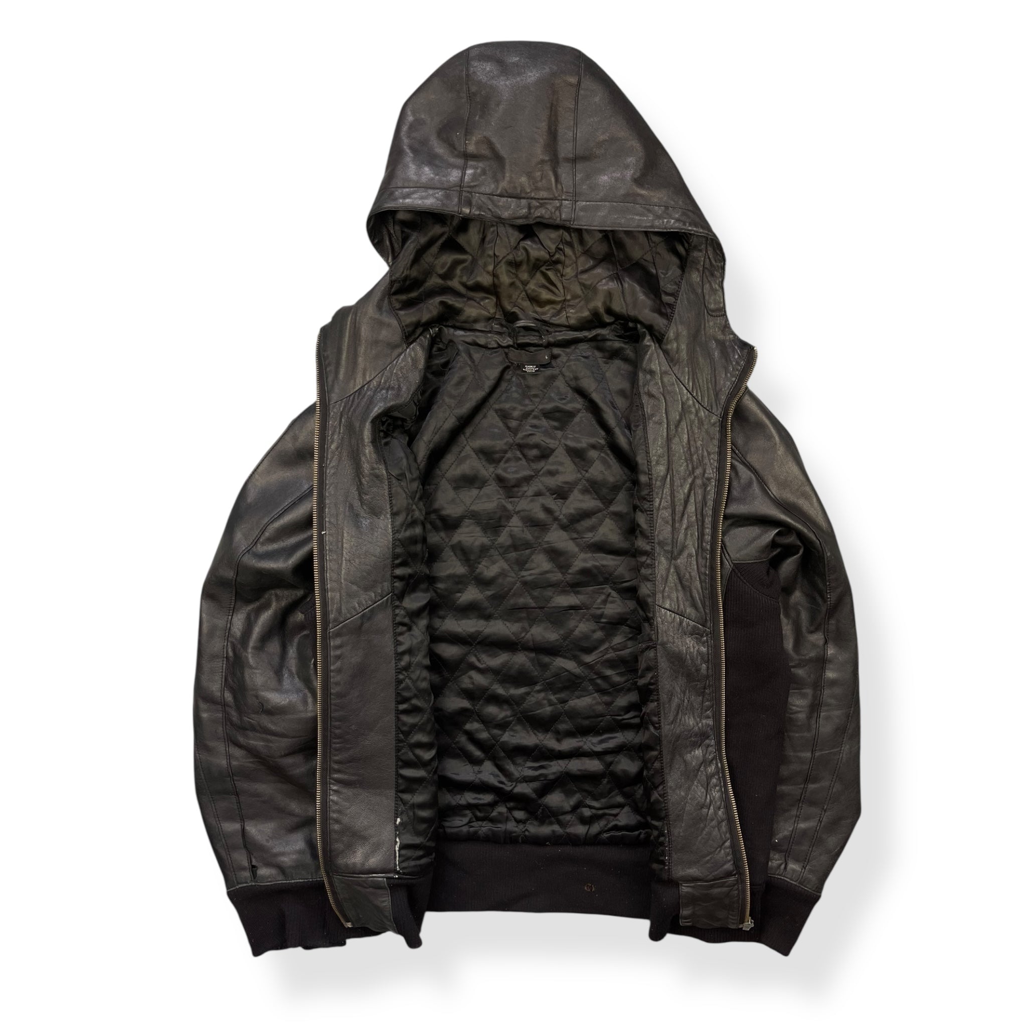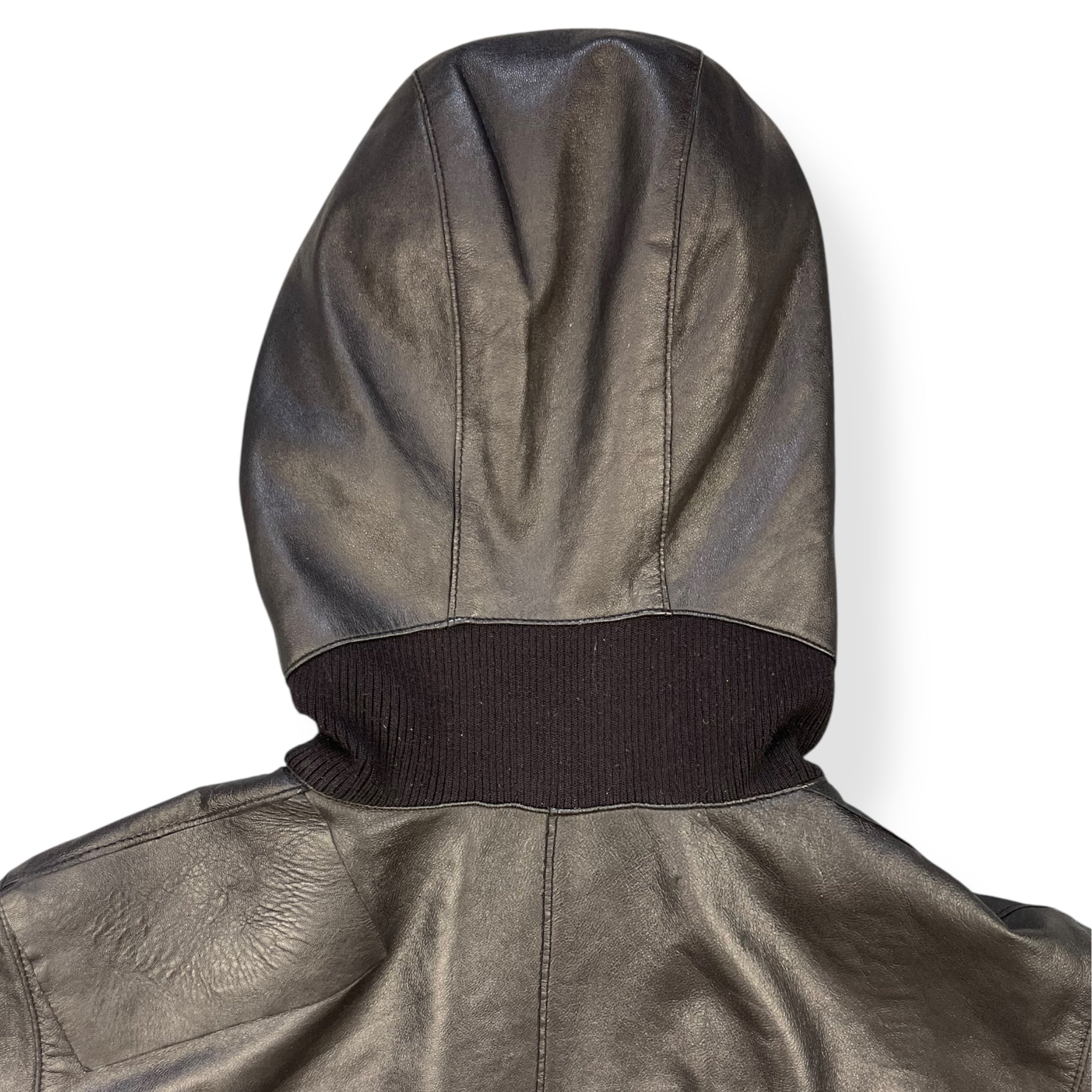 Lambskin leather with wool panelling connecting the hood to the body, at the sides of body & waist hem/cuffs. Subtle embossed logo on the chest, quilted lining, & black Puma neck label which was used around 2004.