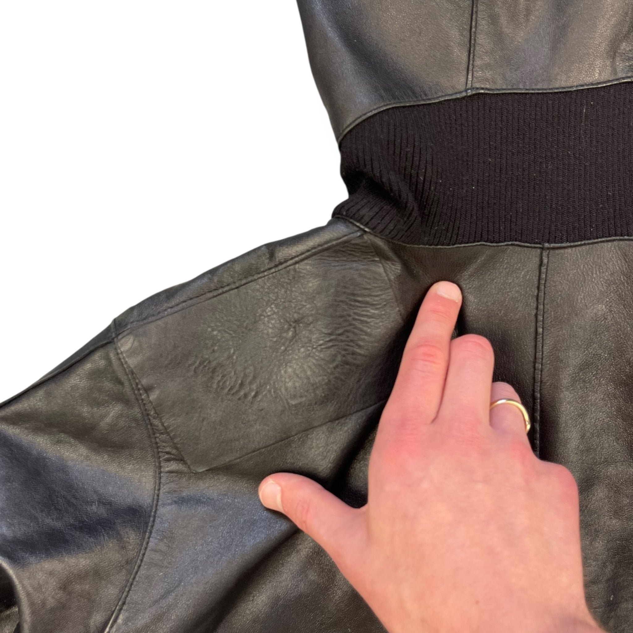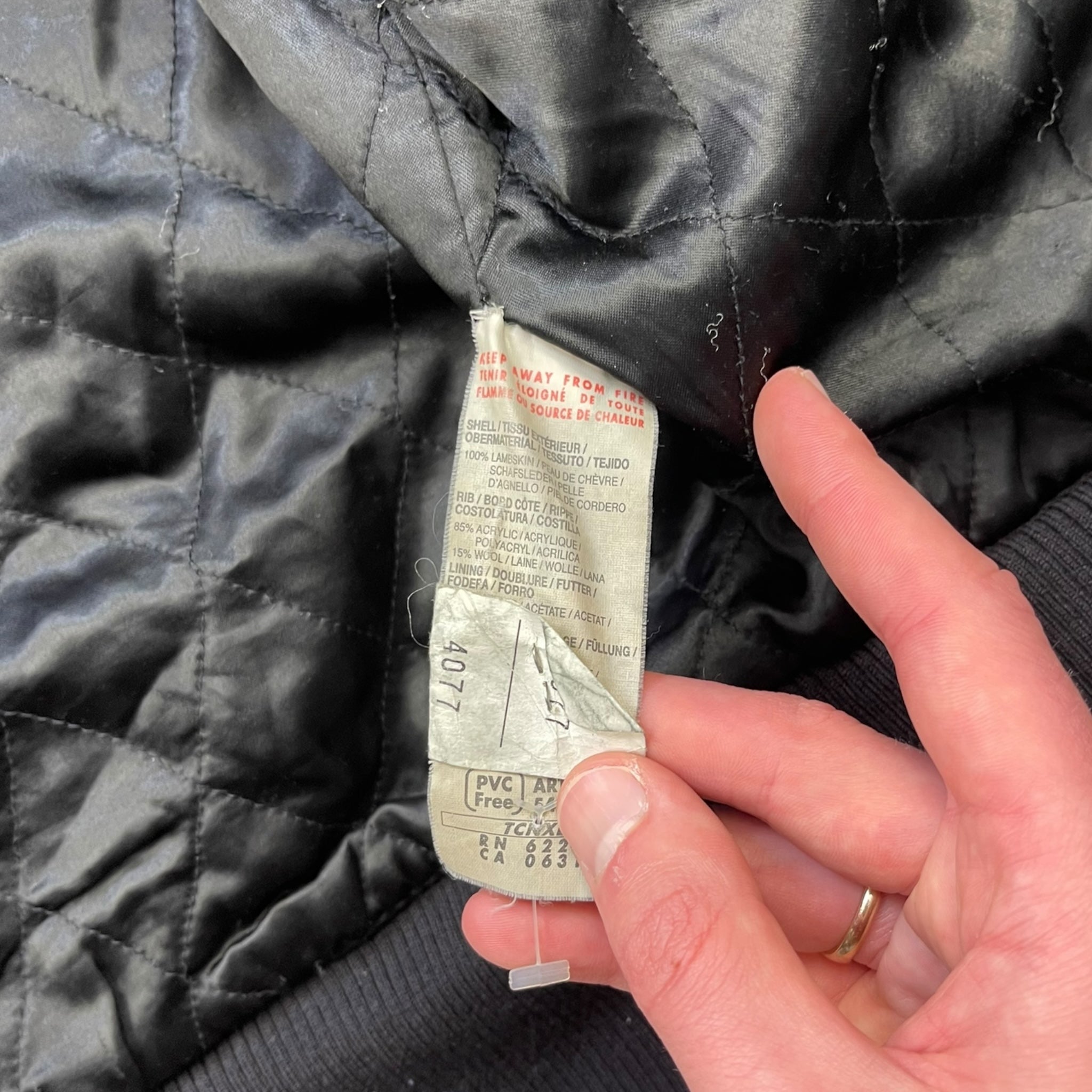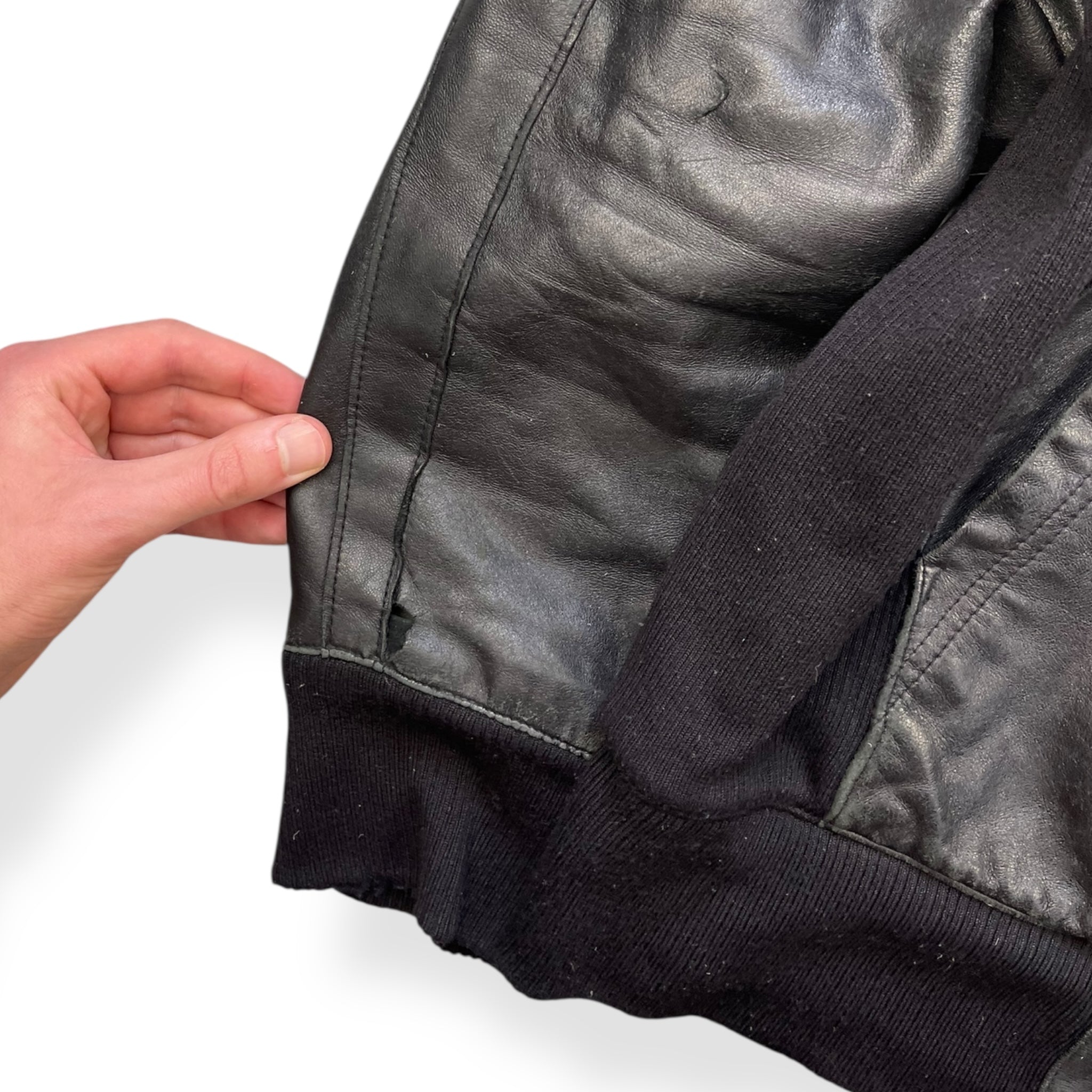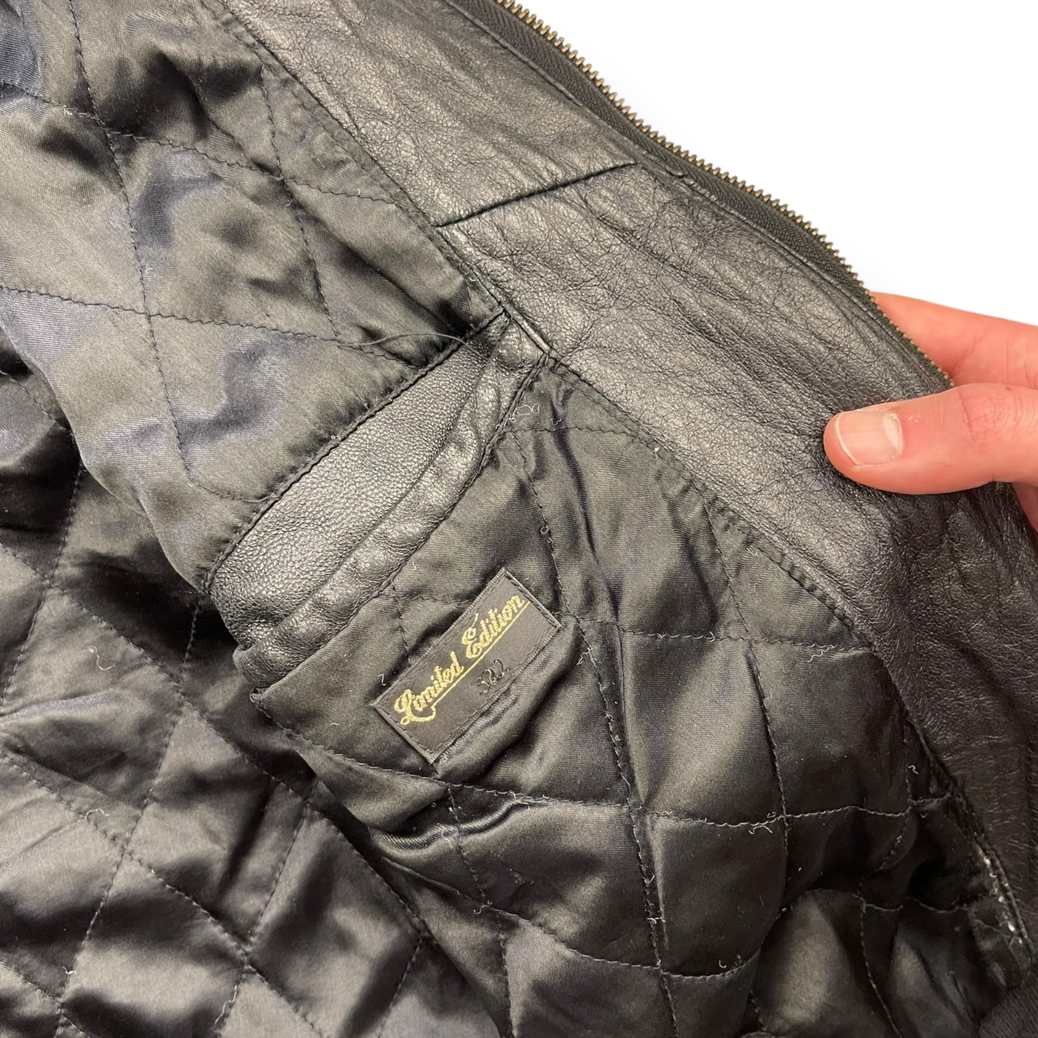 Lambskin leather with wool panelling connecting the hood to the body, at the sides of body & waist hem/cuffs. Subtle embossed logo on the chest, quilted lining, & black Puma neck label which was used around 2004.