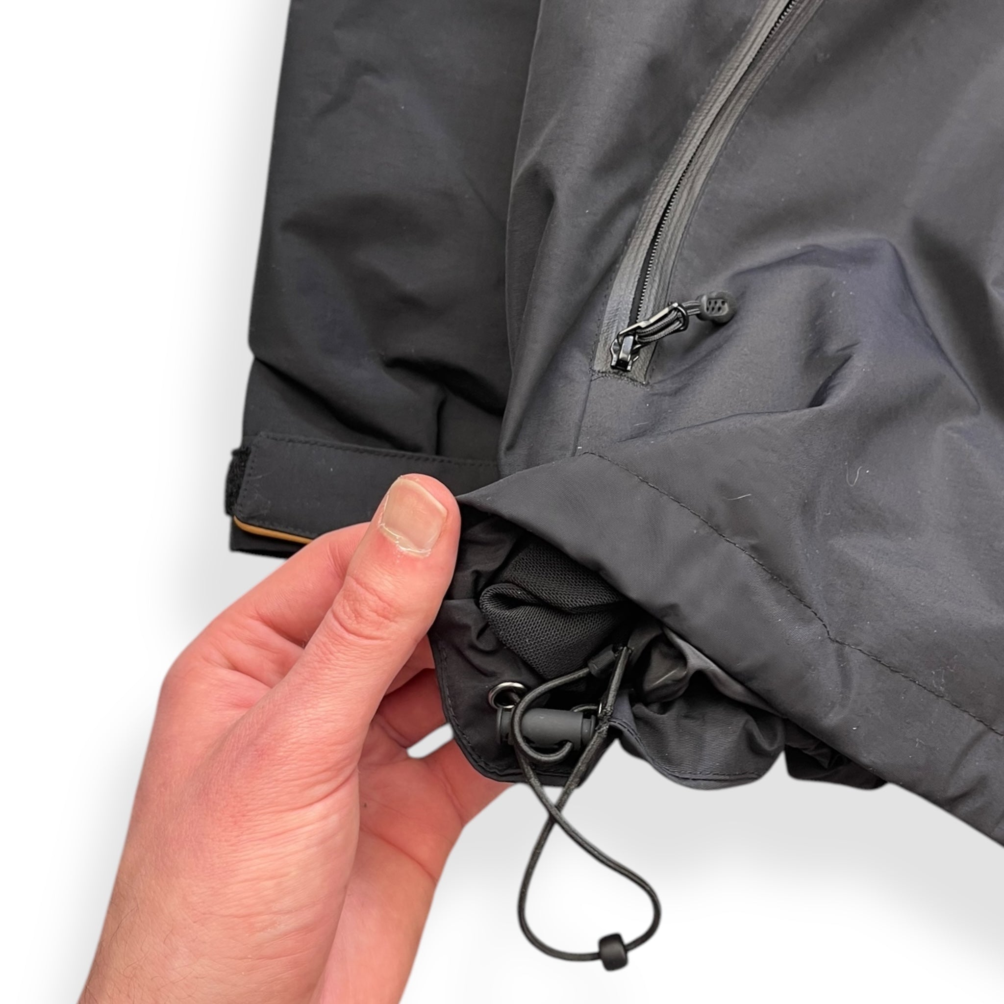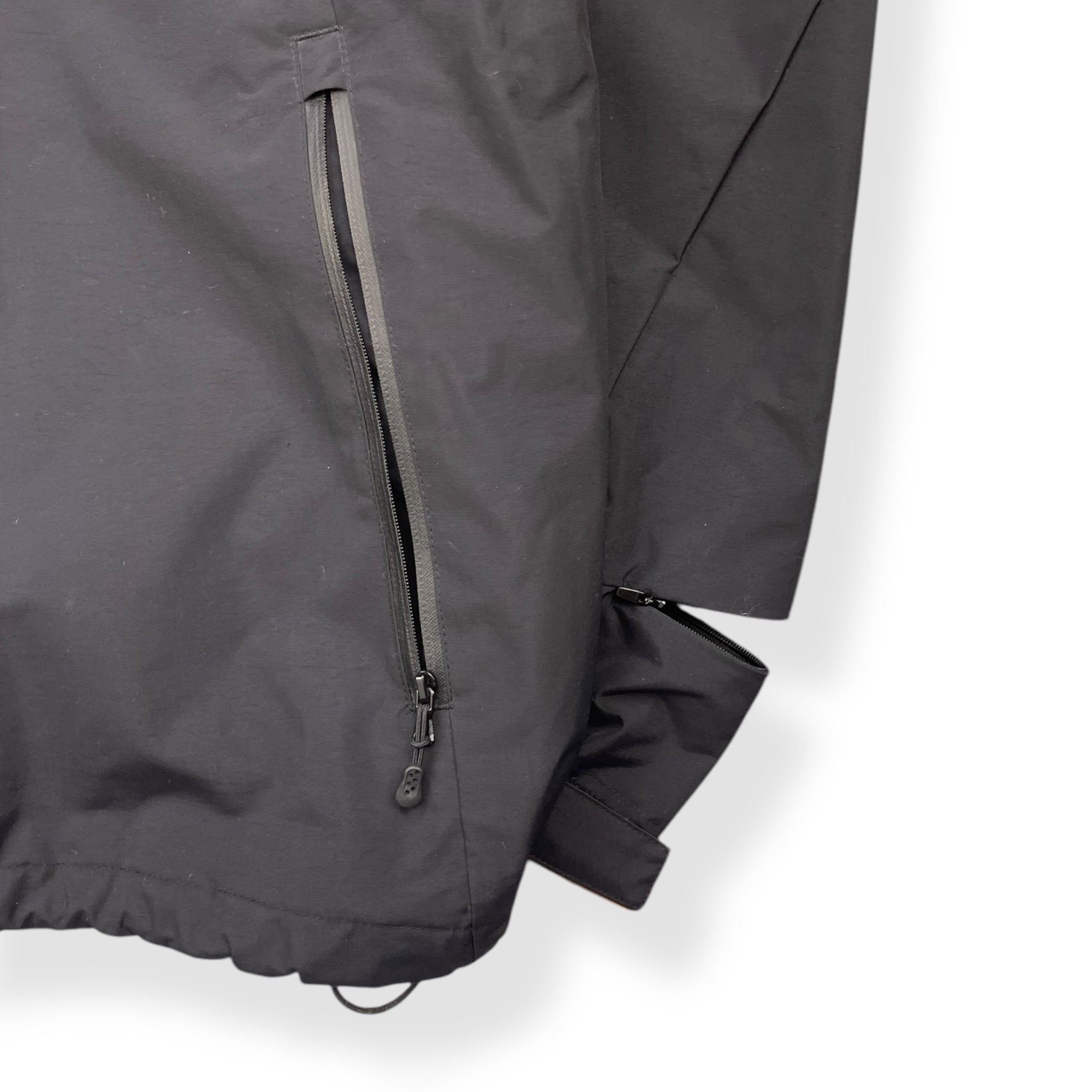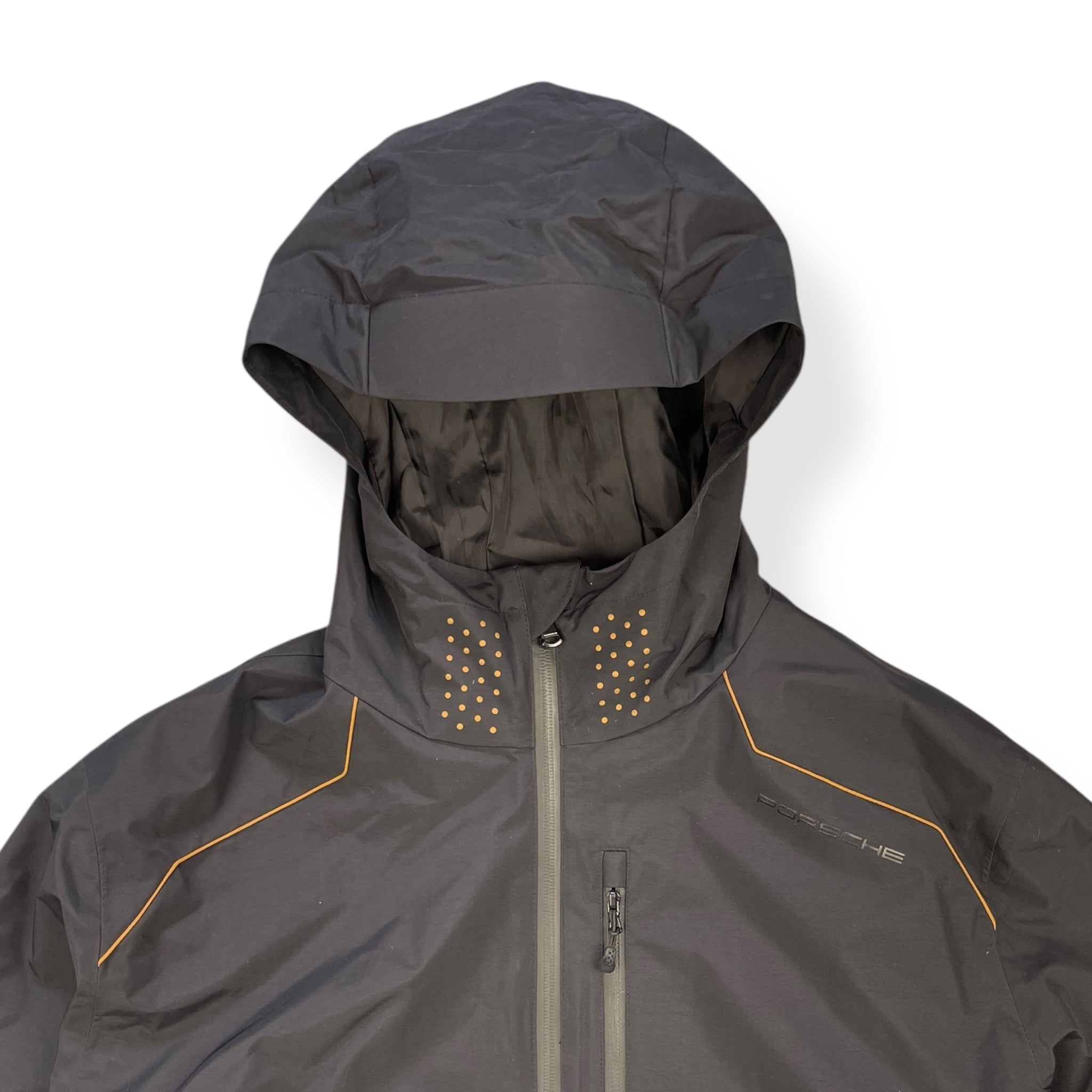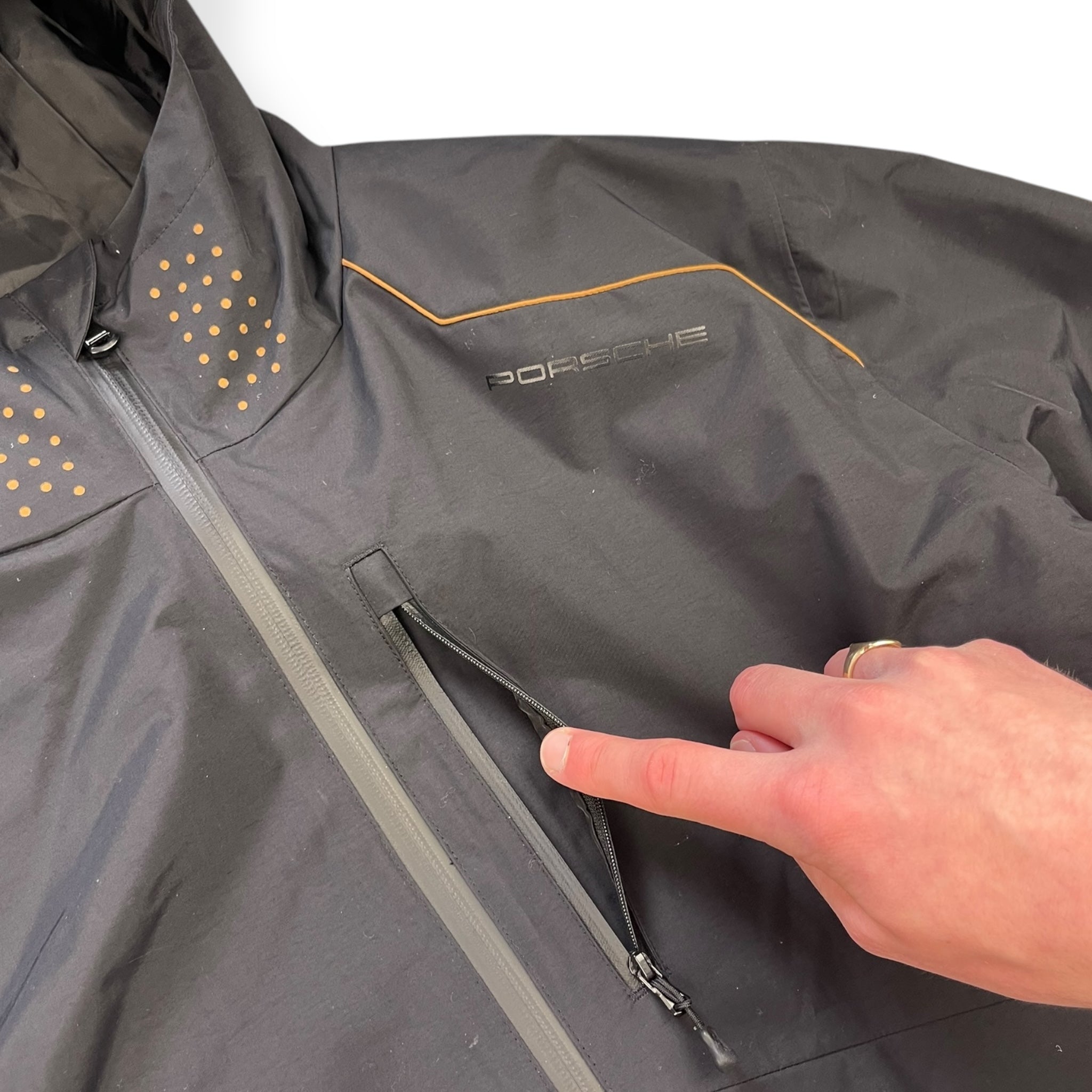 Part of the exclusive Turbo S Series. Waterproof, windproof & breathable. Black colourway with gold detailing throughout. Stash chest pocket, elasticated hood & waist hem & sleek watchviewer zip on the left cuff.