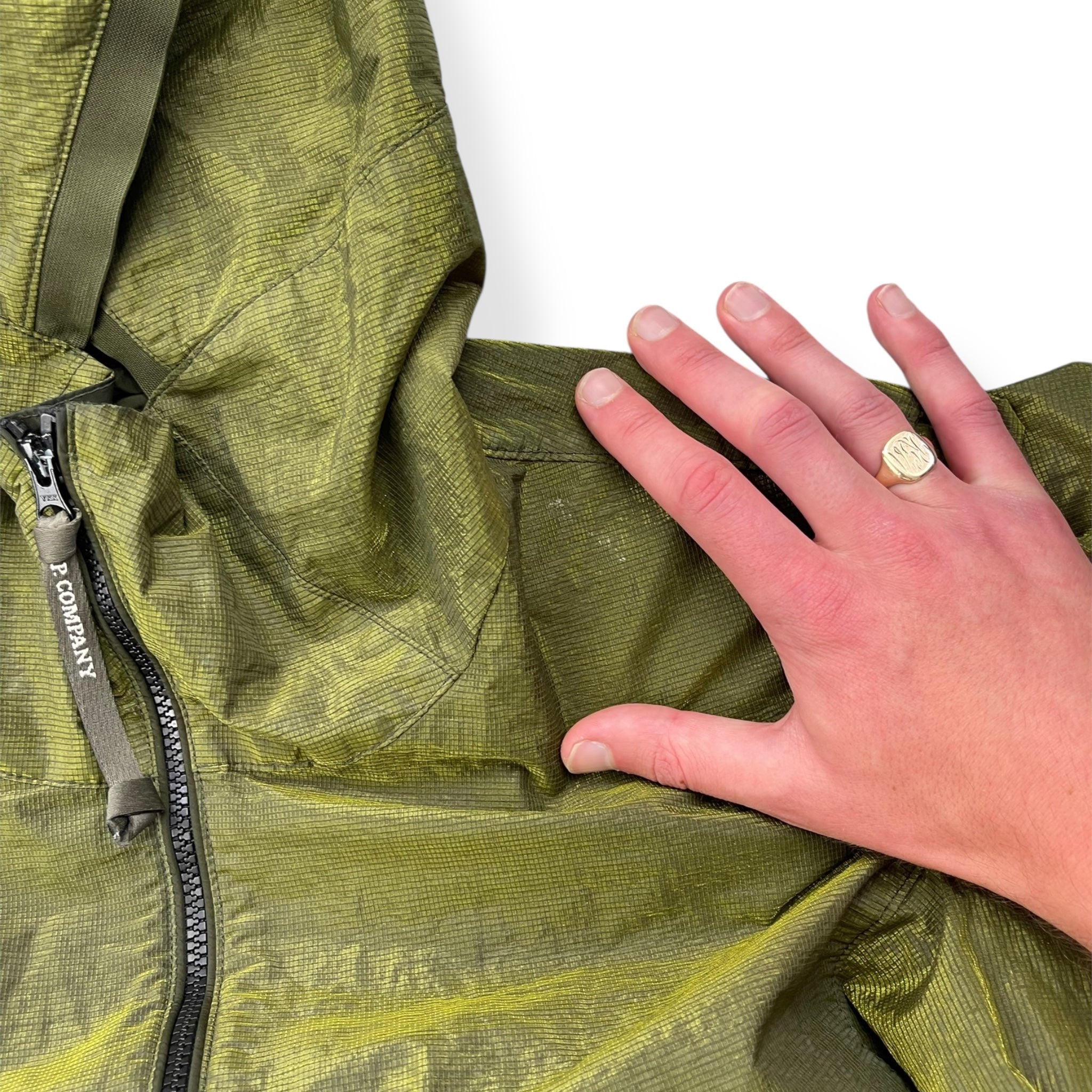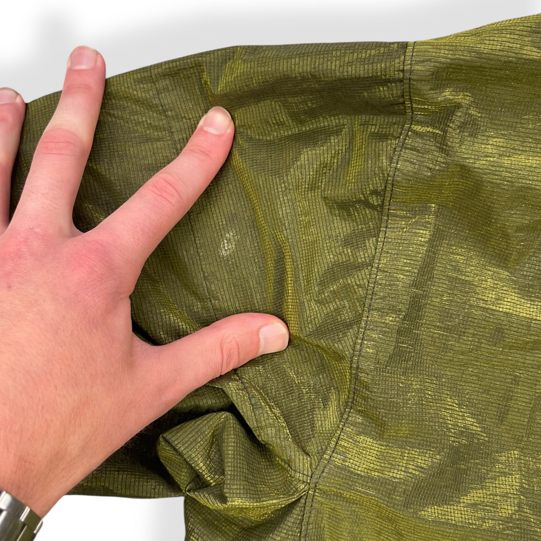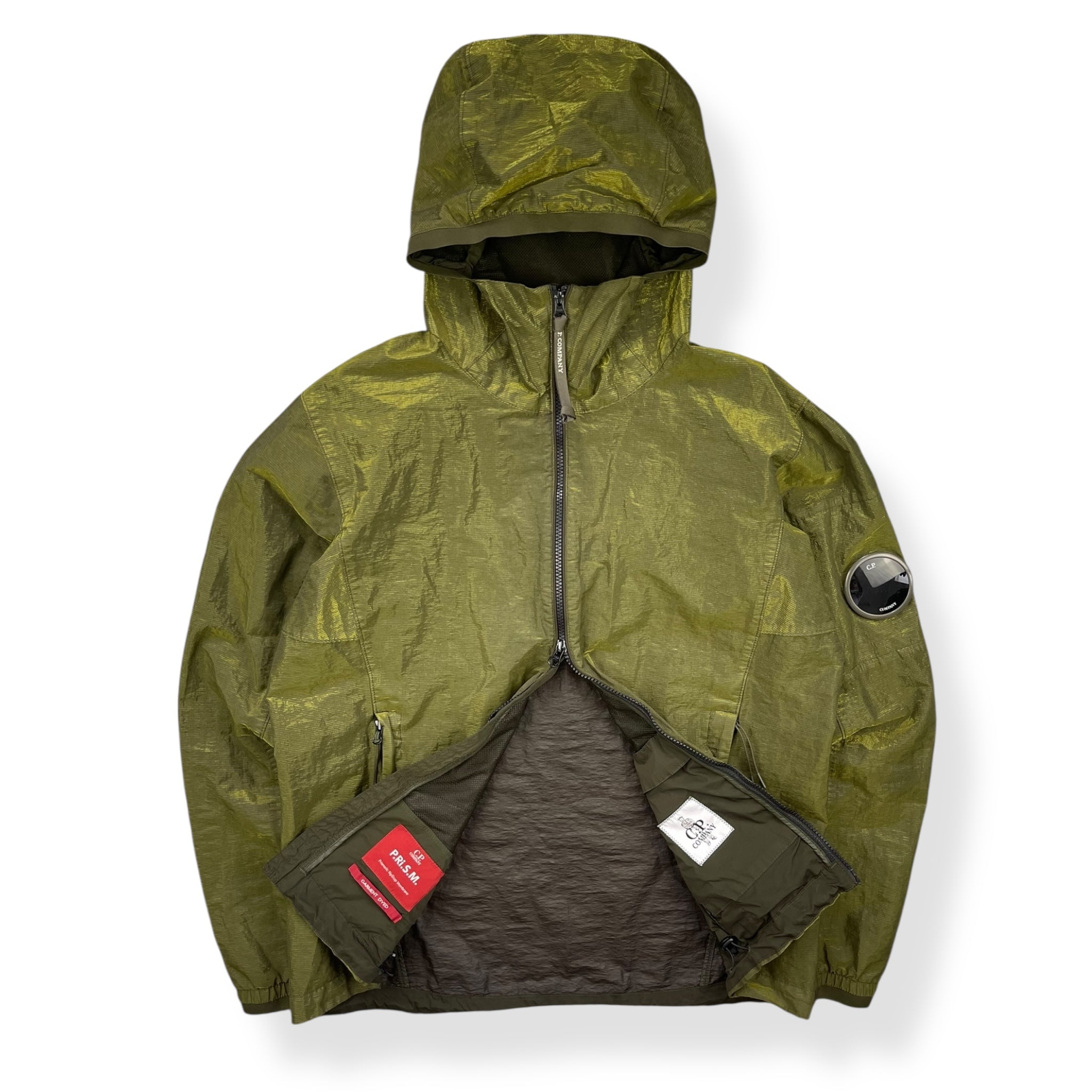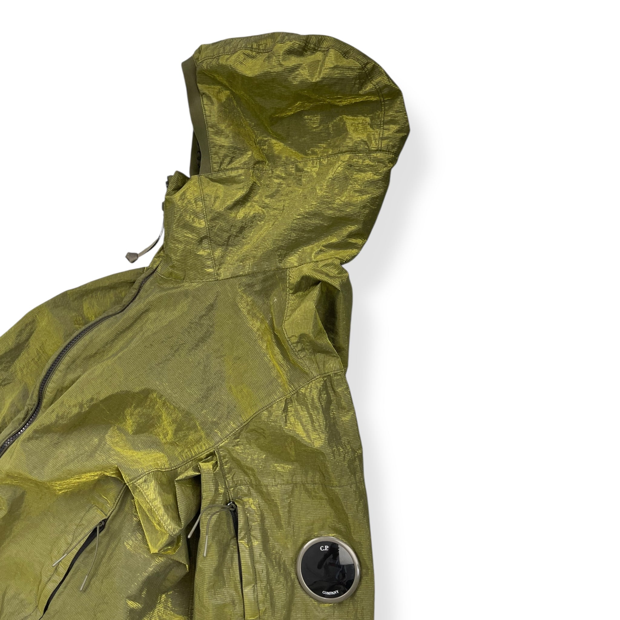 Unique shimmer style fabric. Water resistant, garment dyed, elasticated waist hem & lens viewer on the sleeve.
