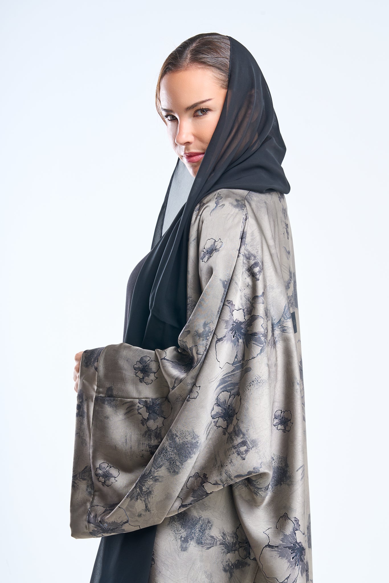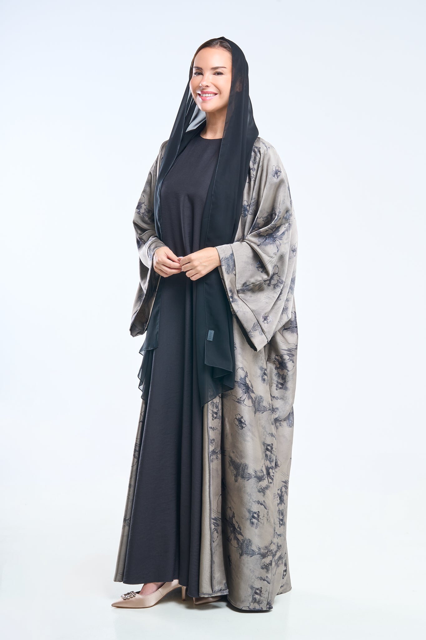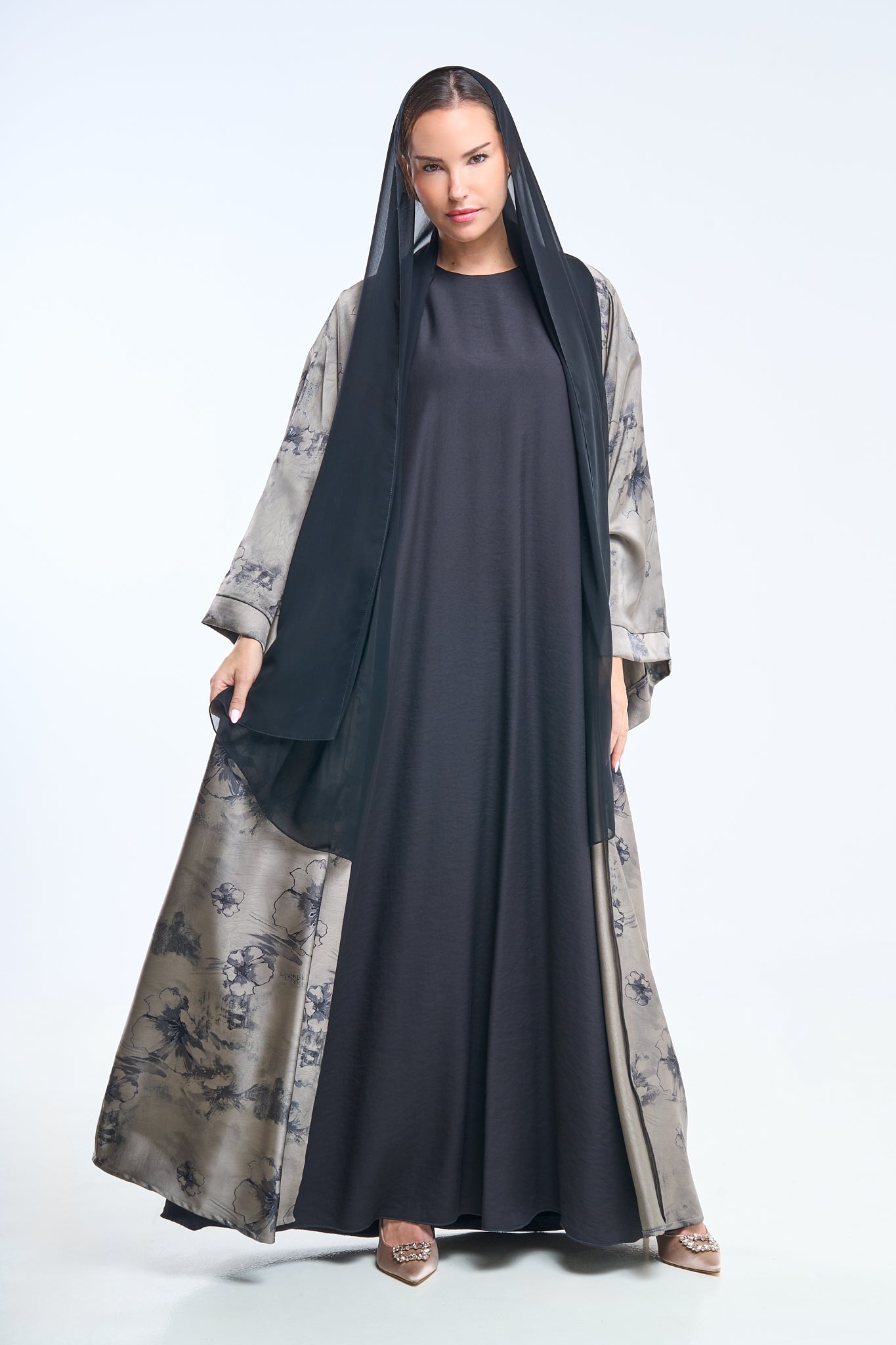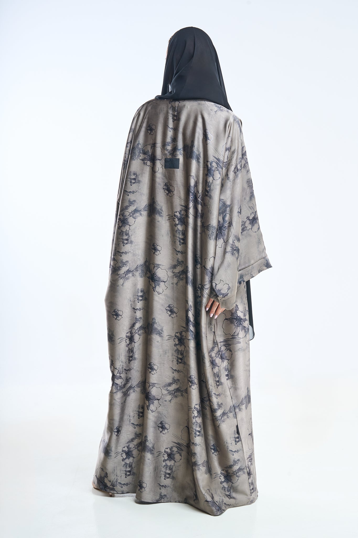 Ash grey floral detailing over a jet-black canvas makes this abaya ideal for twilight elegance. The fabric holds structure while remaining breathable.