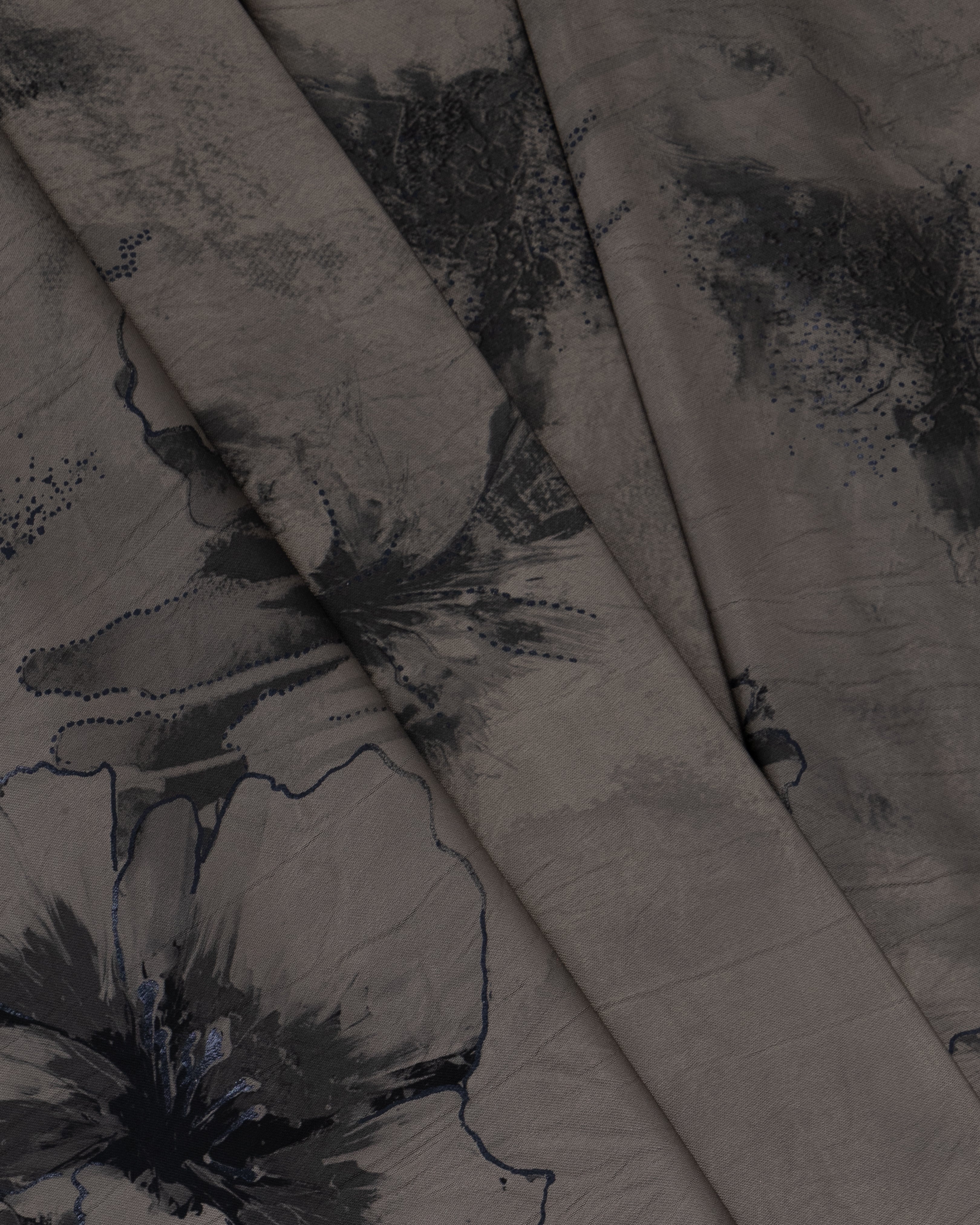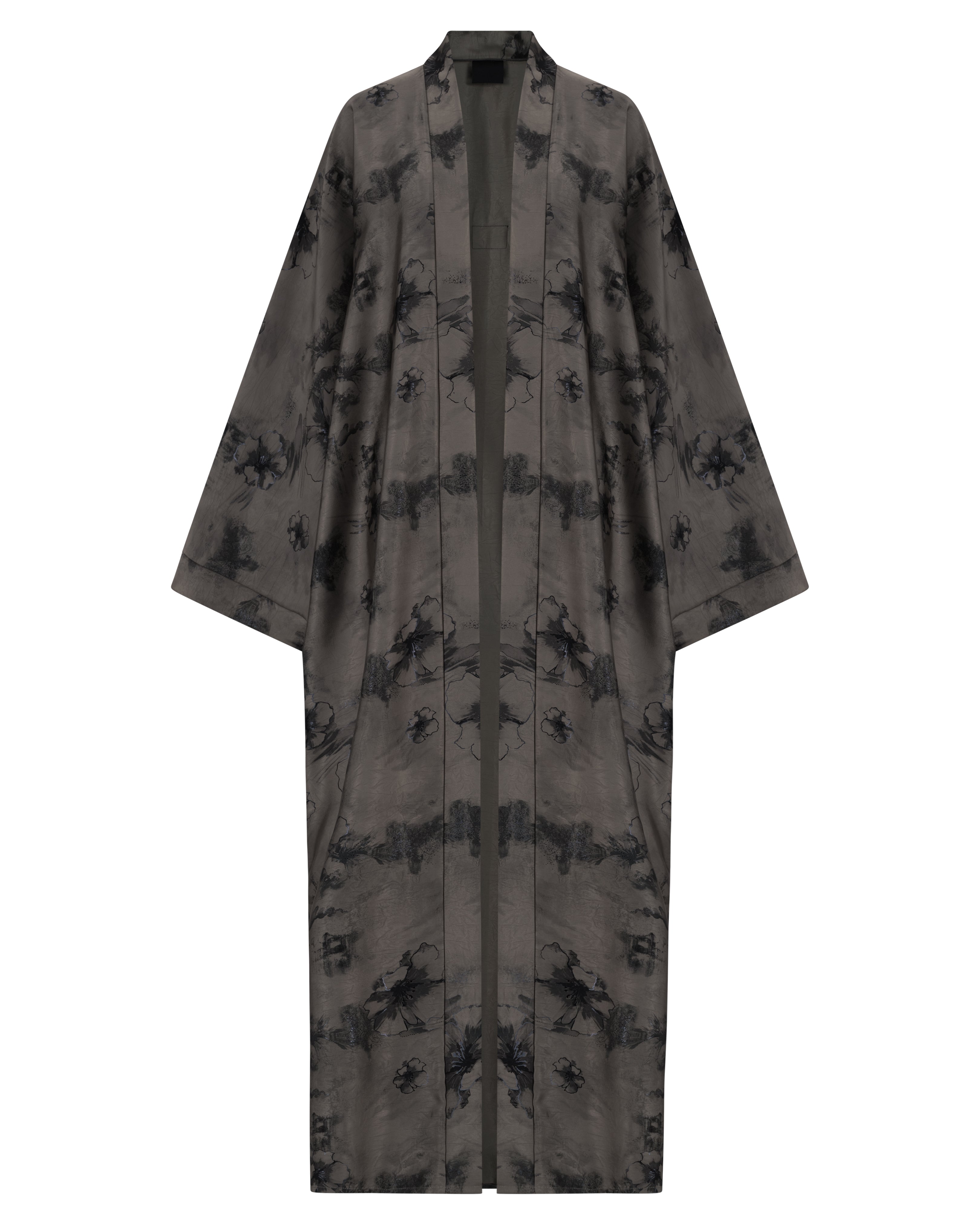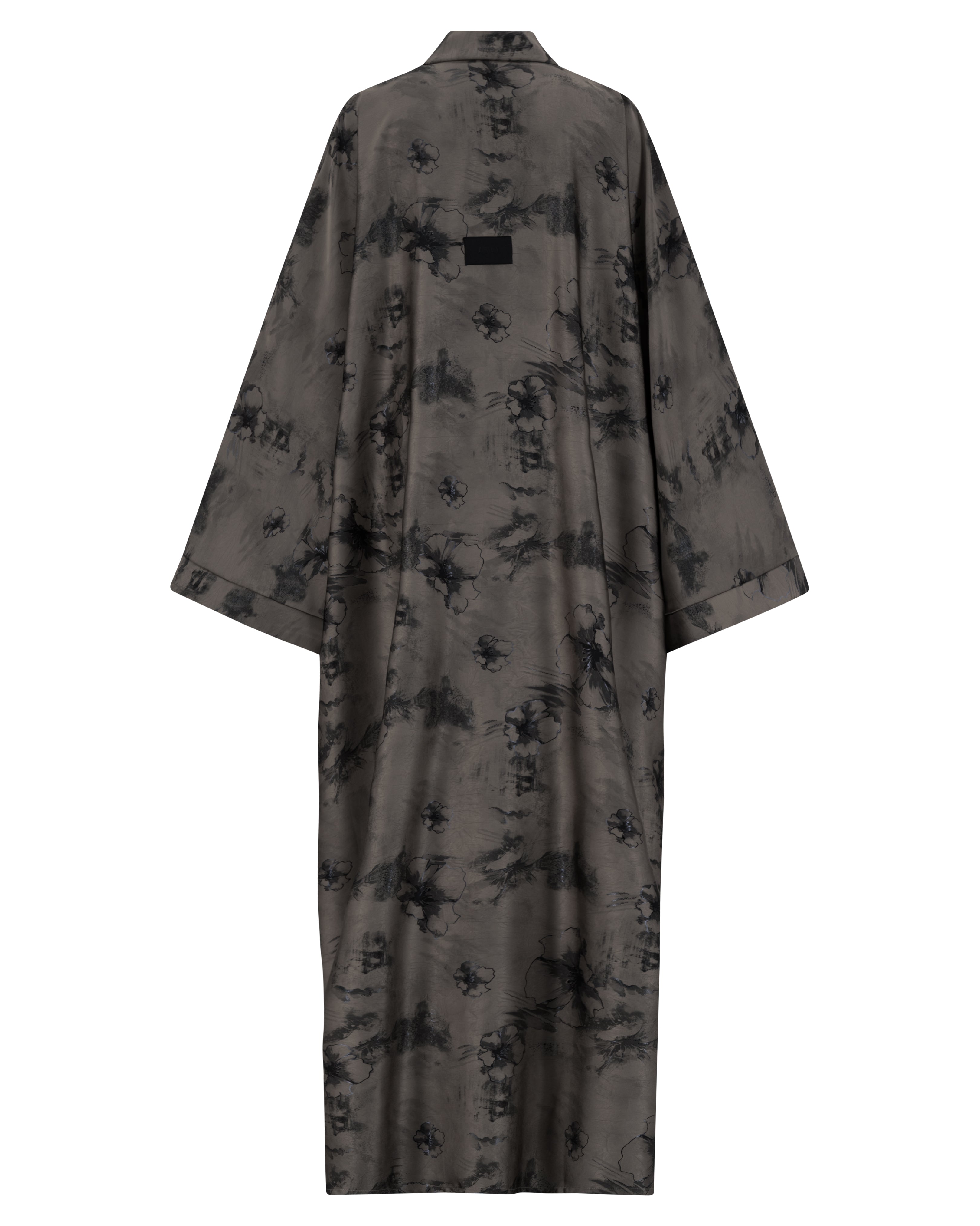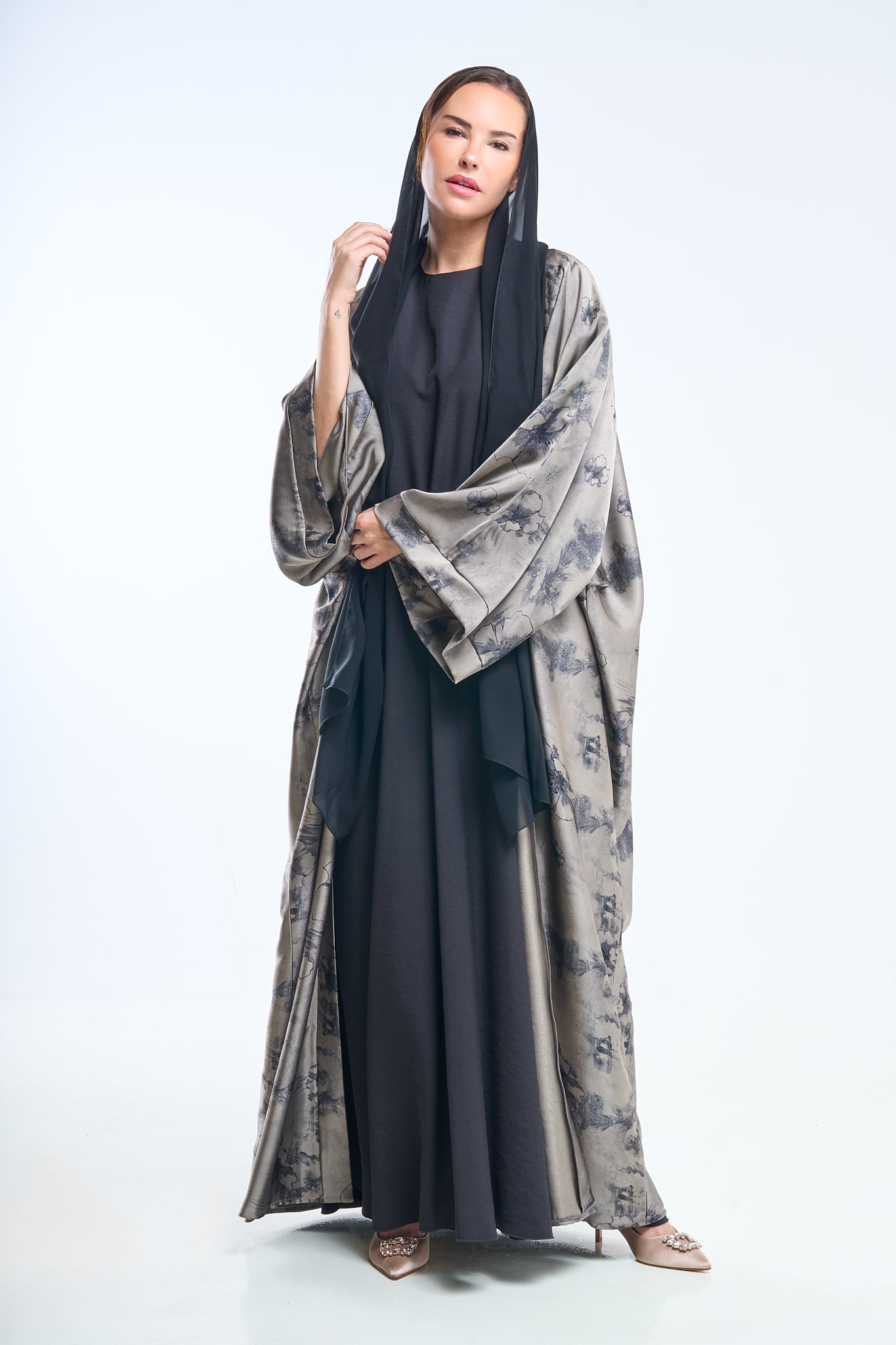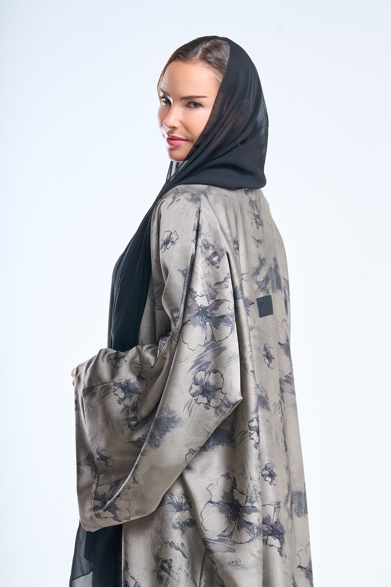Ash grey floral detailing over a jet-black canvas makes this abaya ideal for twilight elegance. The fabric holds structure while remaining breathable.