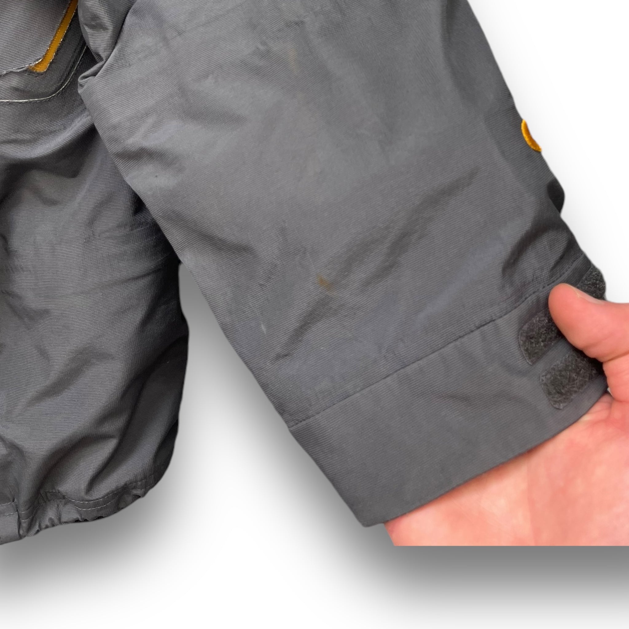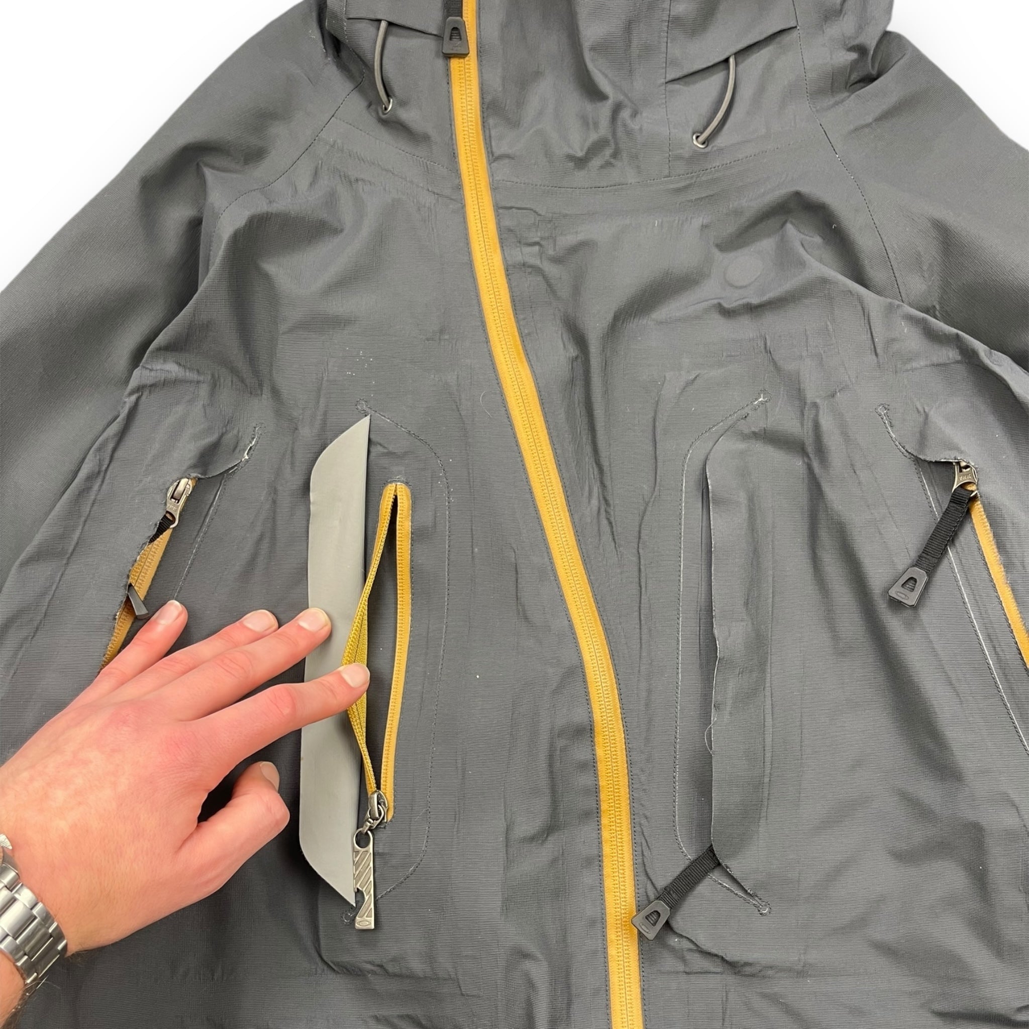 Very rare sample jacket. Asymmetric zip, concealed stash pockets on the chest, magnetic hood & collar, body ventilation zips, elasticated hood & waist hem & embroidered branding thoughout.