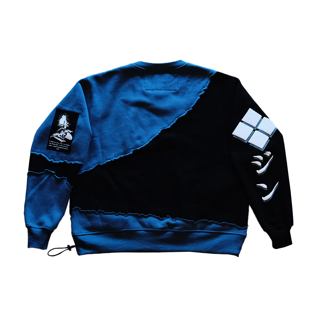Crewneck sweater with a 2 color splice of Blue and Black, 49/51 cotton/poly blend oversized fit, 380GSM.