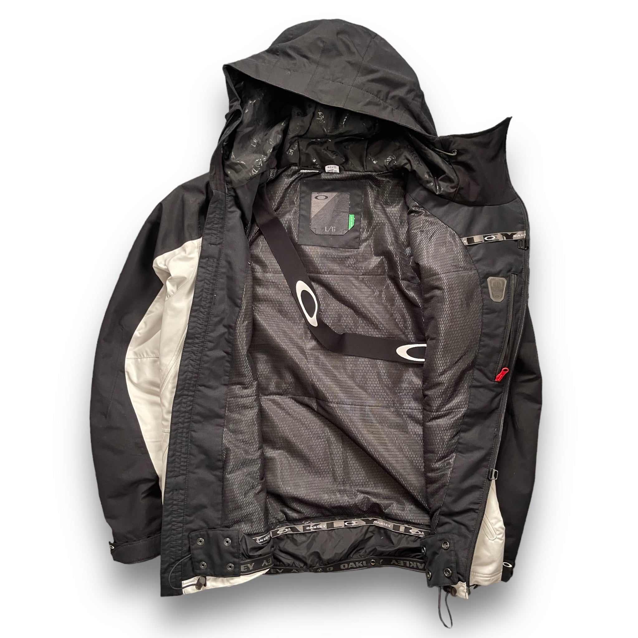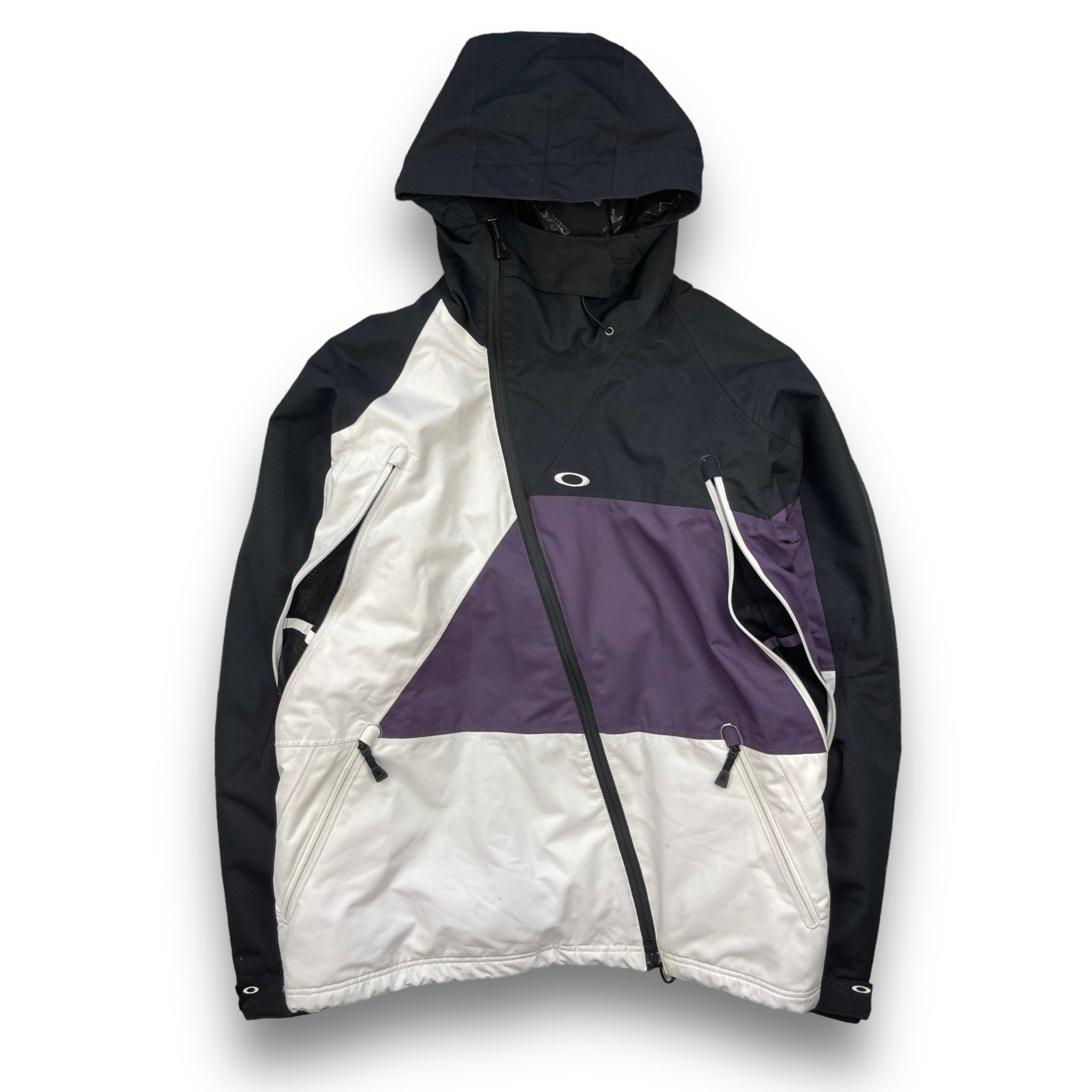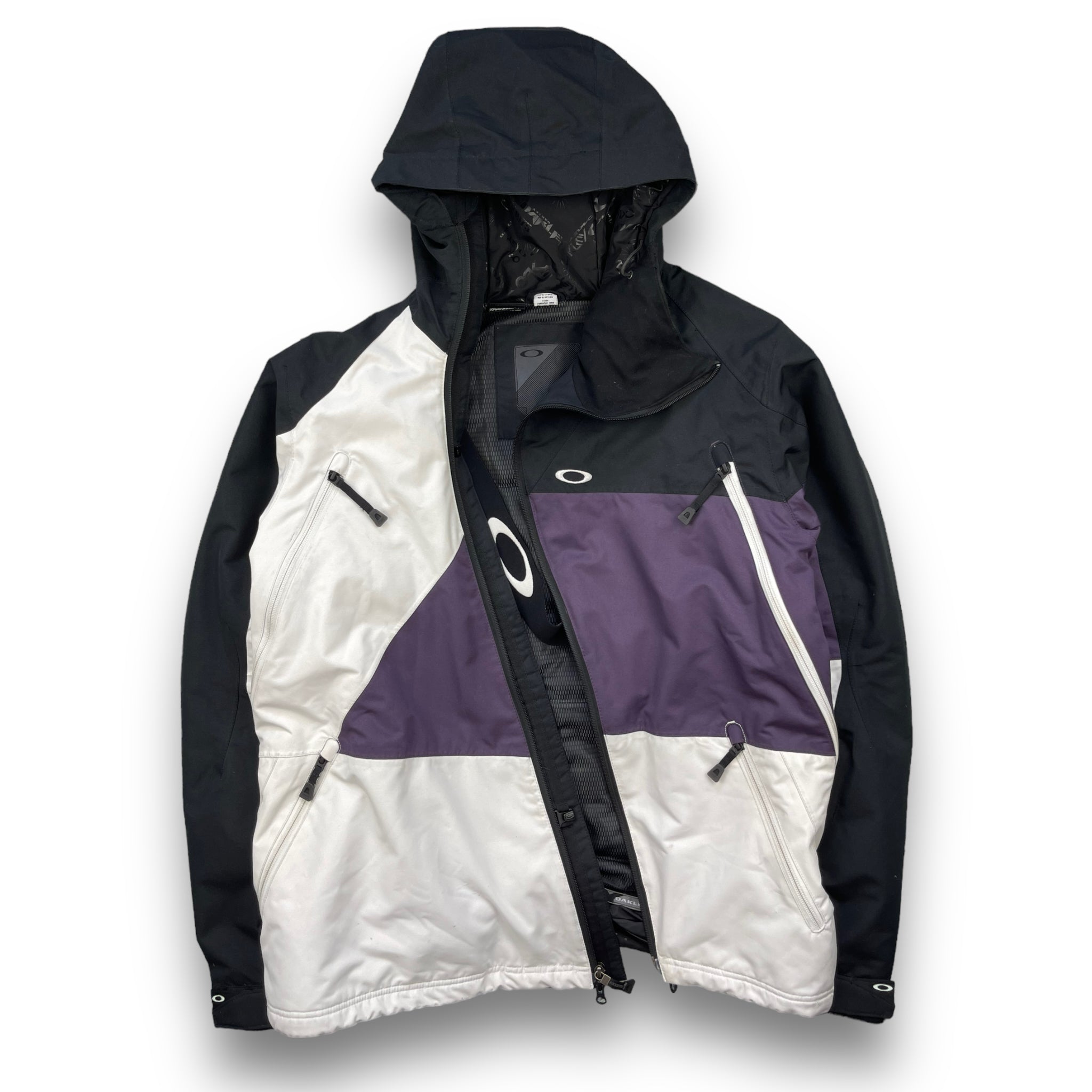 Black/White/Purple pannelling. Highly functional, with asymmetric body zip, 2 large ventilation zips either side of body as well as 2 zipped pockets. Elasticated hood & waist hem, magnetic feature in the hood & the front of the jacket to hold it open. Concealed sleeve pocket & slip-proof elasticated cross body strap to carry the jacket.