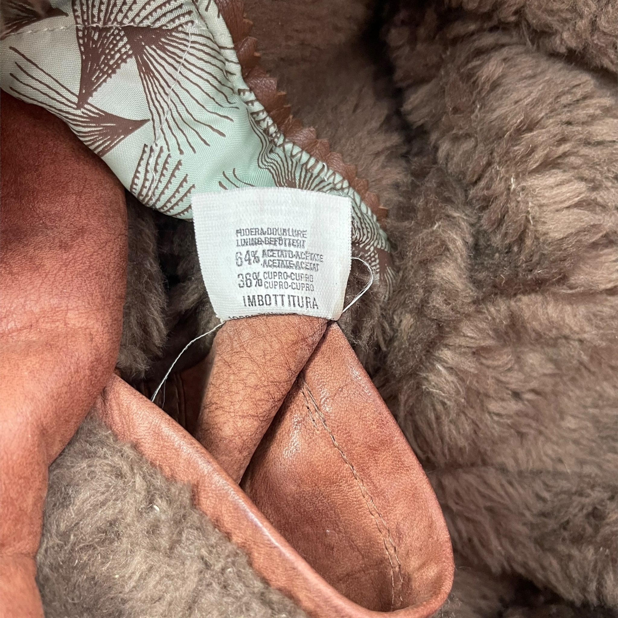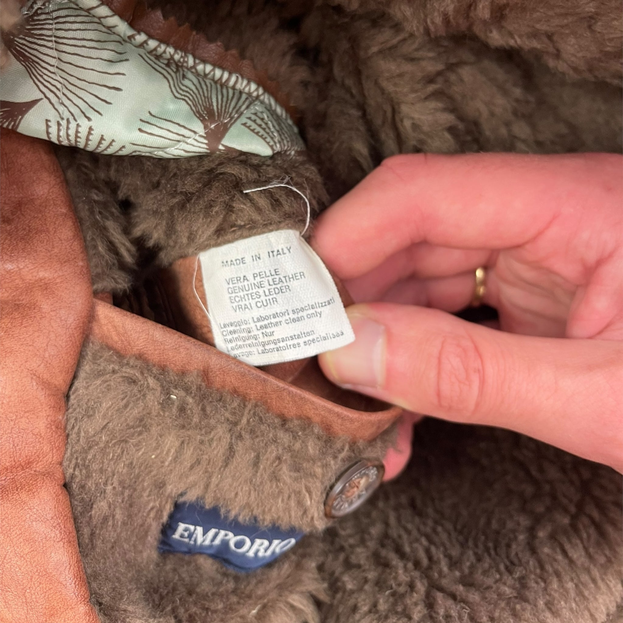 Genuine leather, 4 large exterior pockets, branded buttons, thick fleece lining/collar.