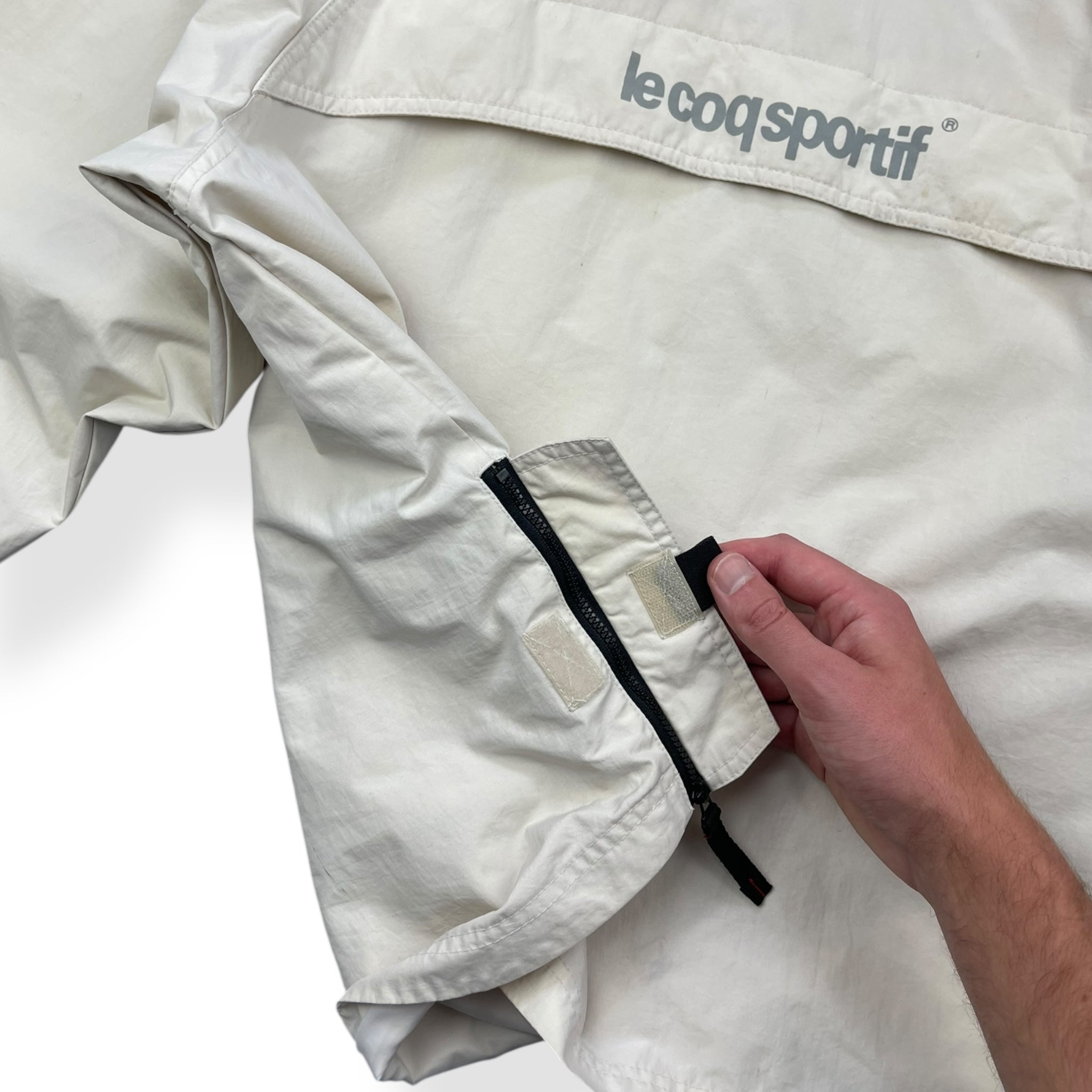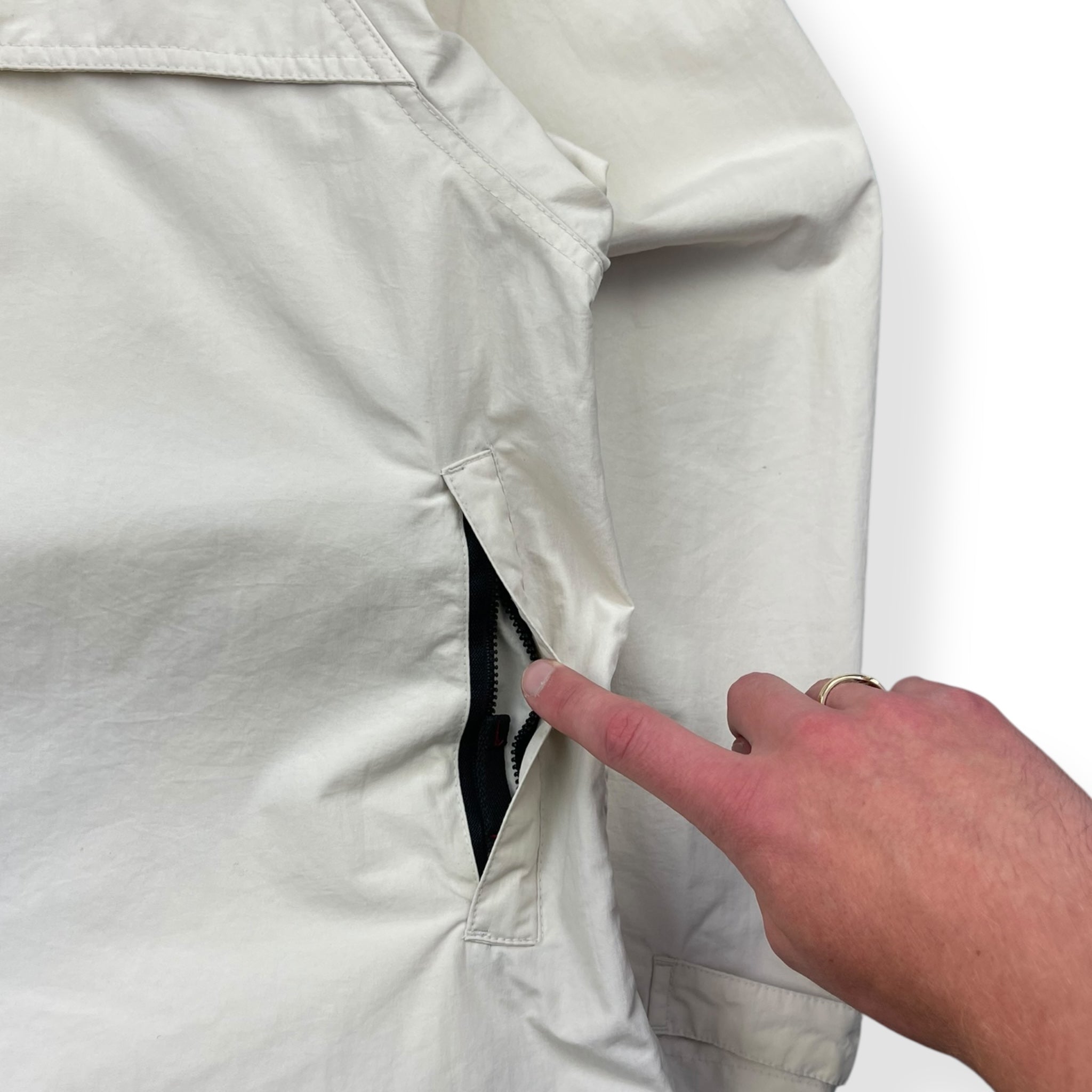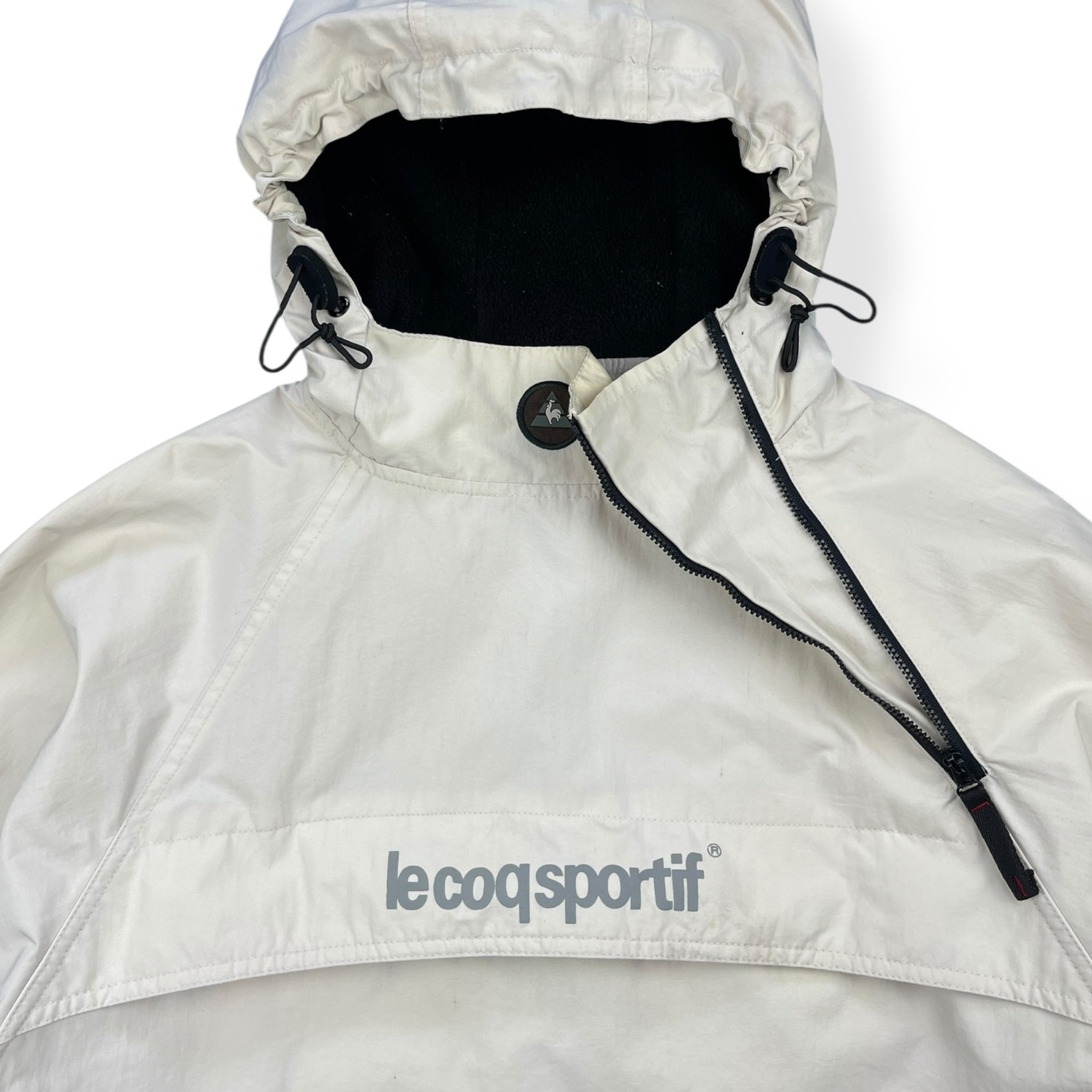Cream exterior with a black fleece lined interior, asymmetric 1/4 zip expandable neck opening, elasticated hood & concealed stash chest pocket.
