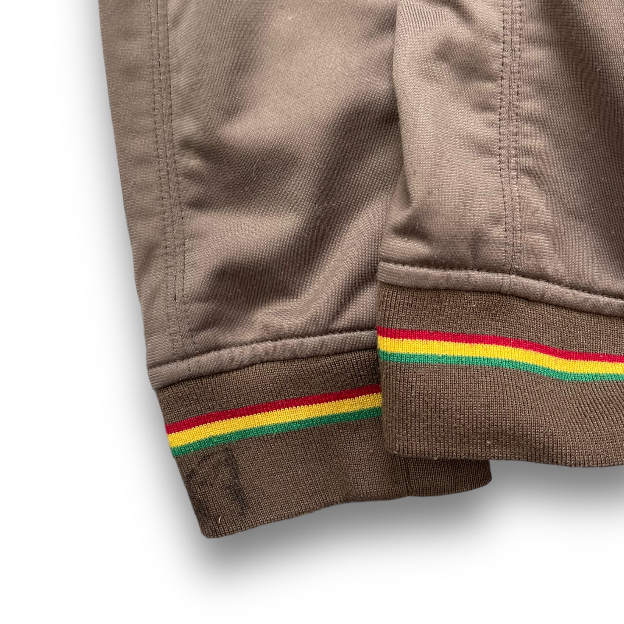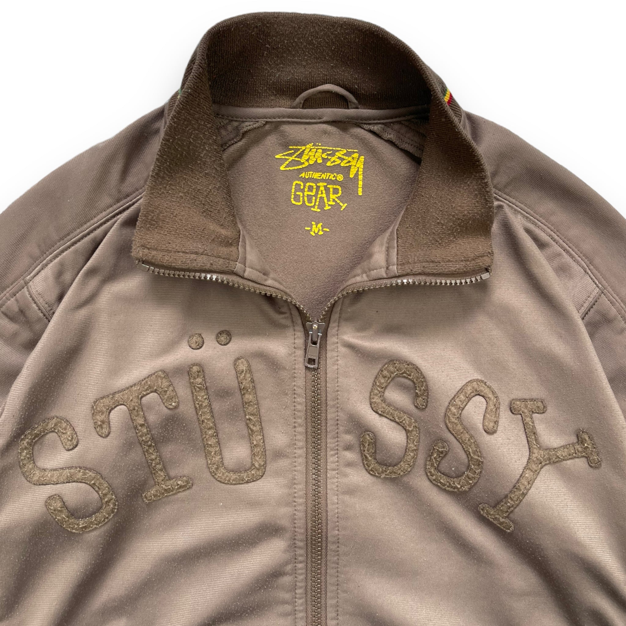 Khaki Green/Brown colourway, Stussy Authentic Gear. Rasta green, yellow, red detailing on the collar, cuffs & waist hem. Spellout across the chest.