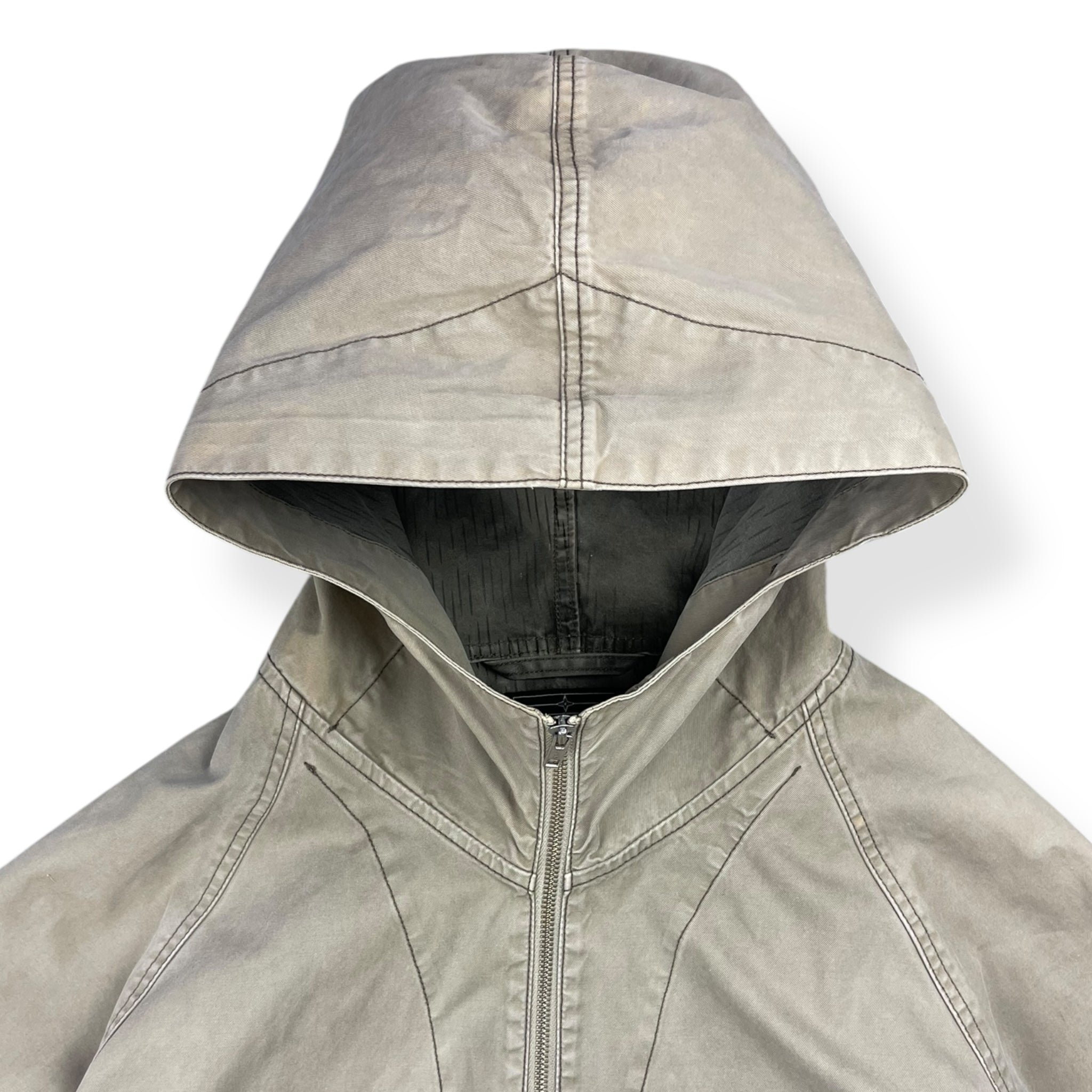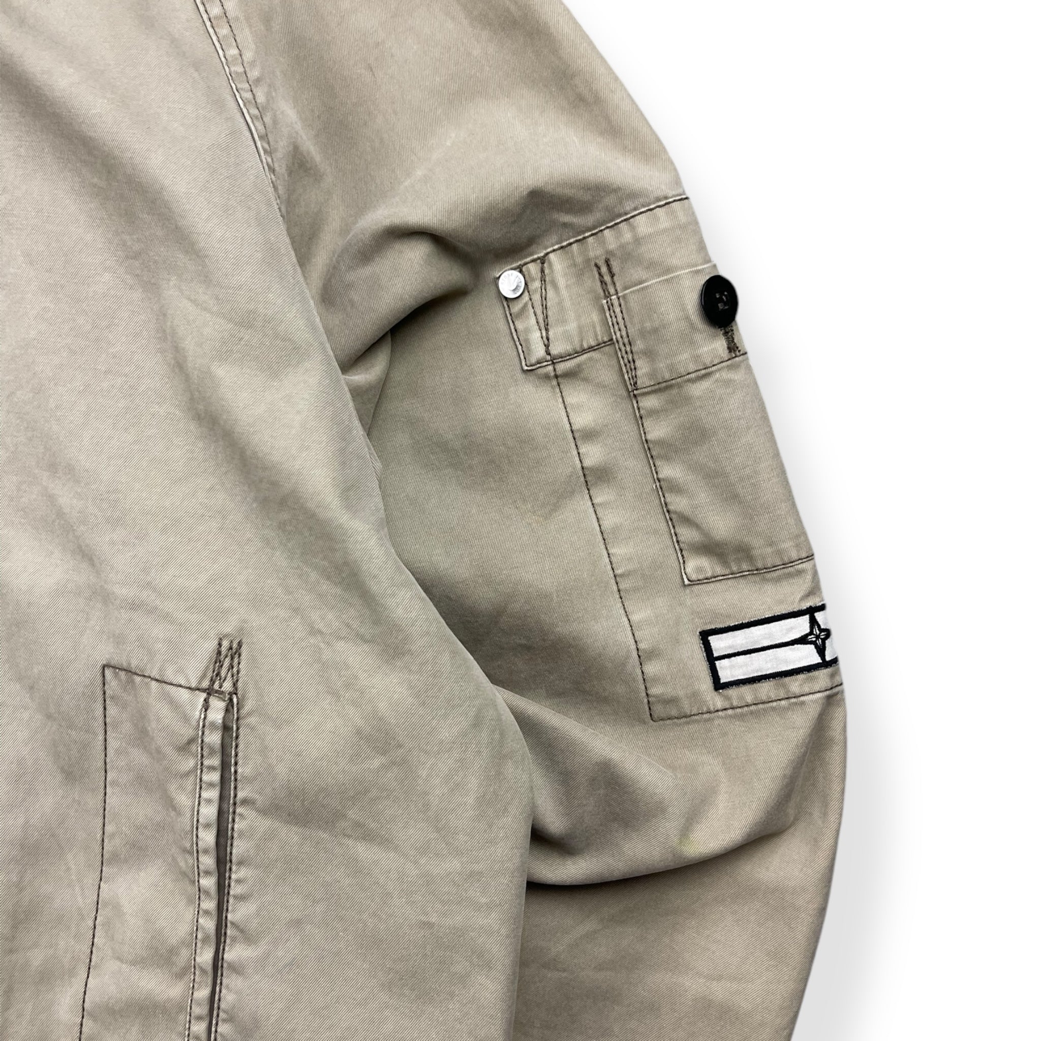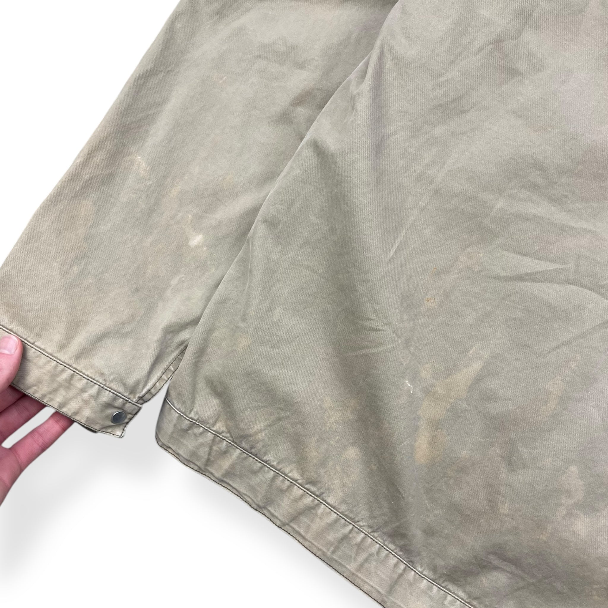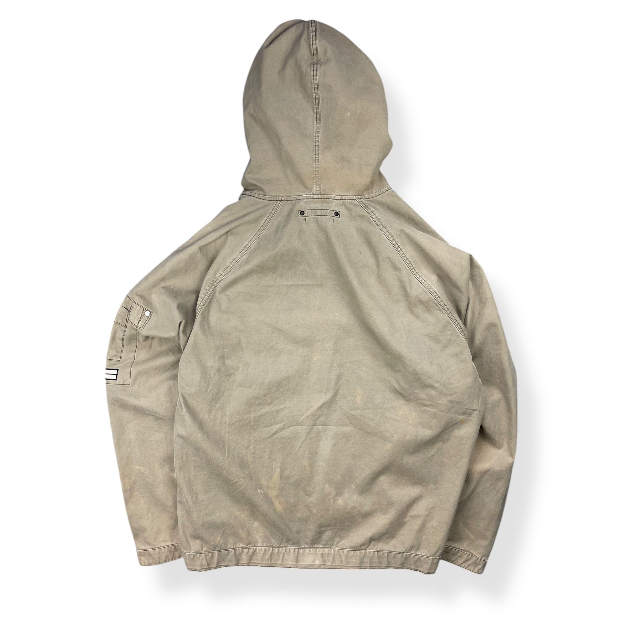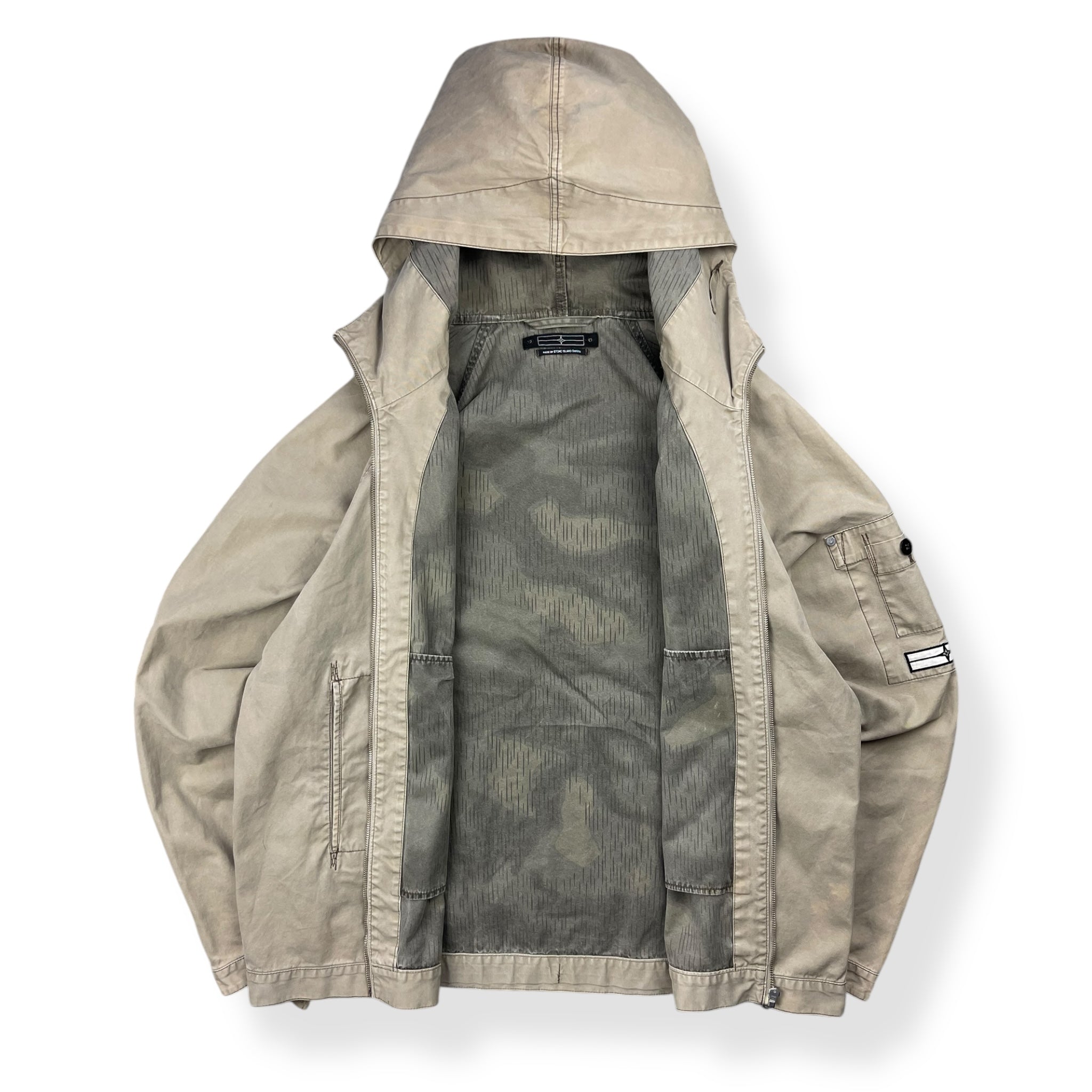 Beige exterior with a lovely rain strait camouflage interior lining. Really nice shape & construction with visible stitching details throughout, denims patch on the left sleeve with stash buttoned pocket & large spacious hood.