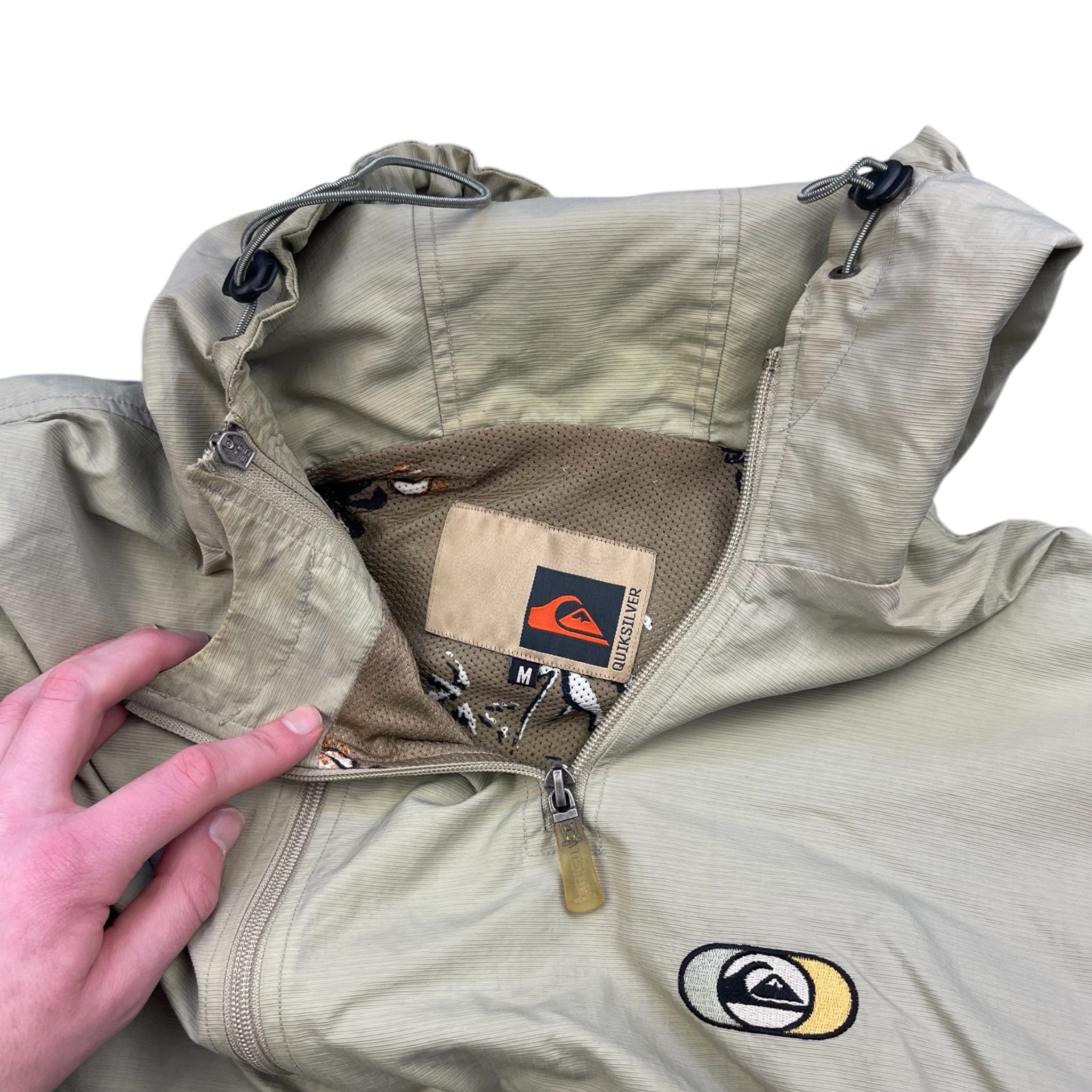 Cream/Beige colourway, exterior material has a waxy feel to it making it water repellent. Elasticated hood & waist hem, 4 front pockets, double zip neck opening, embroidered logo, stash velcro pocket on the sleeve.
