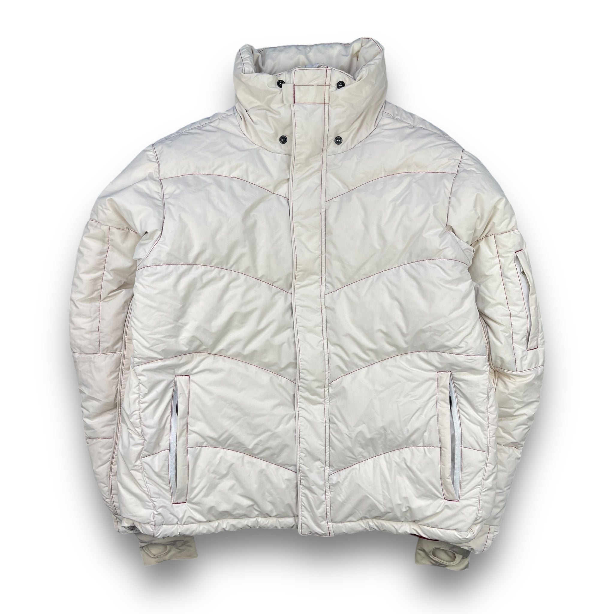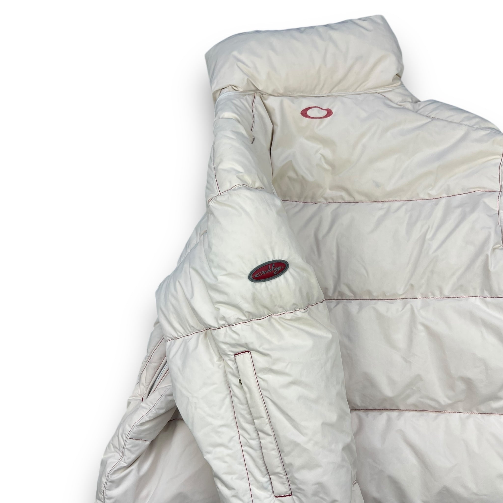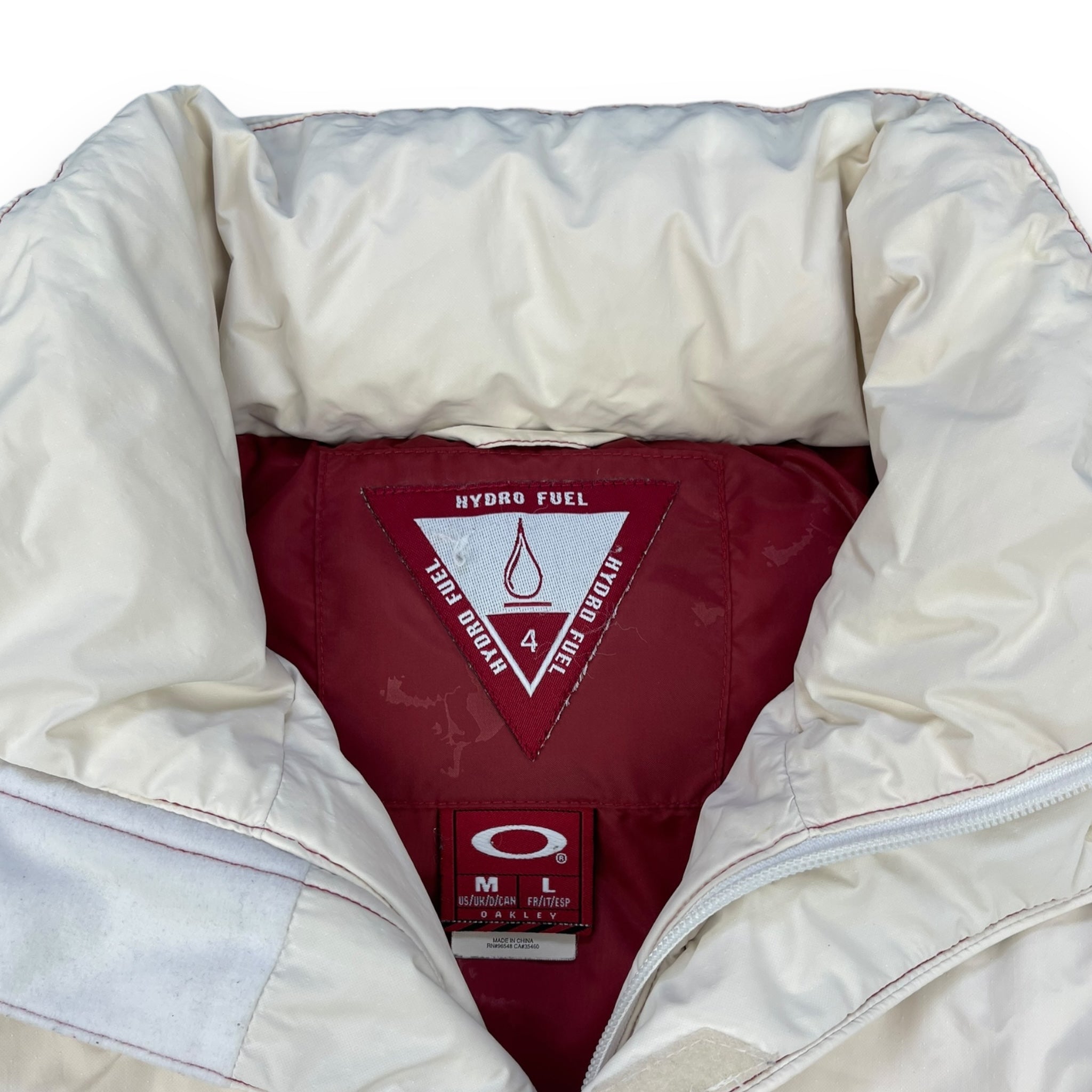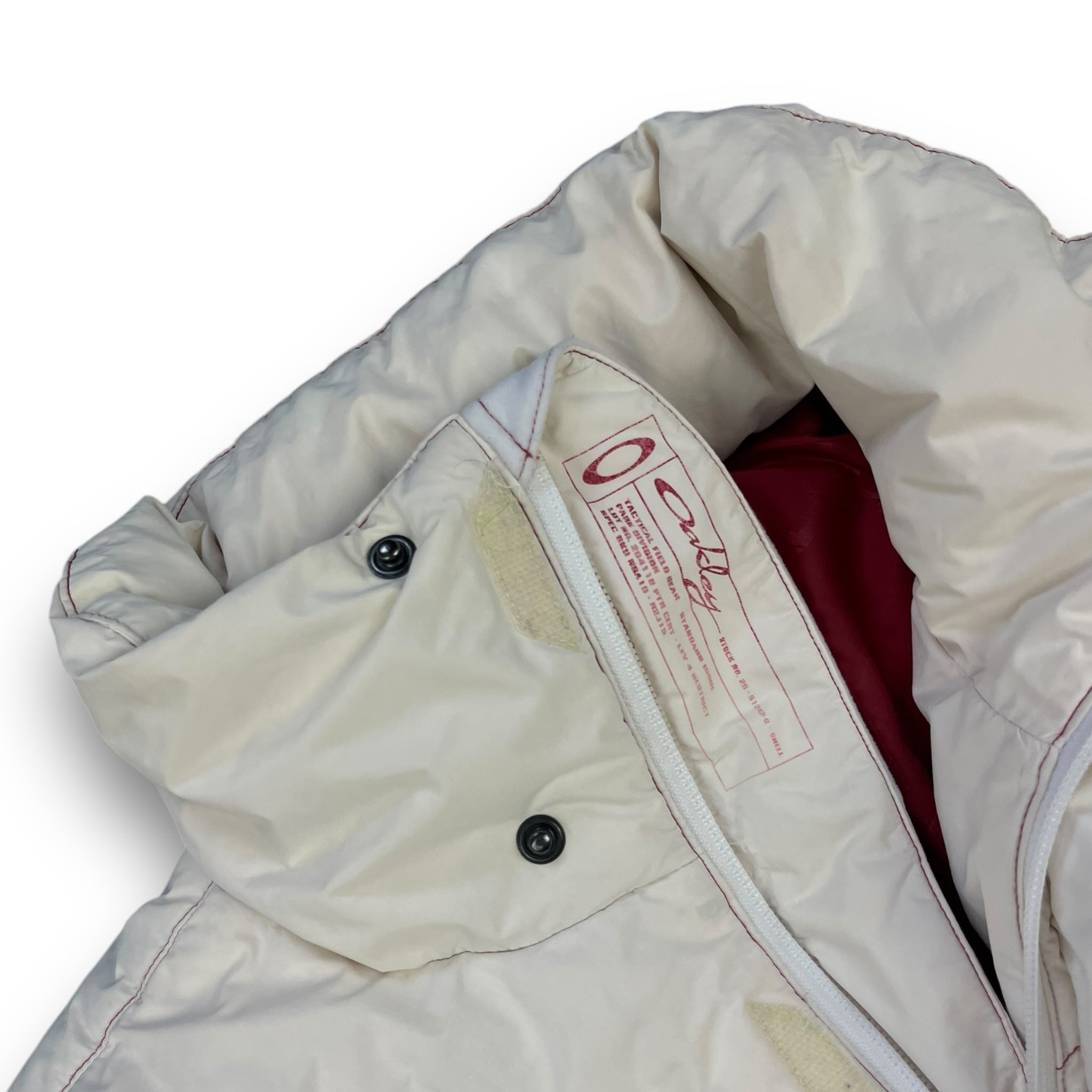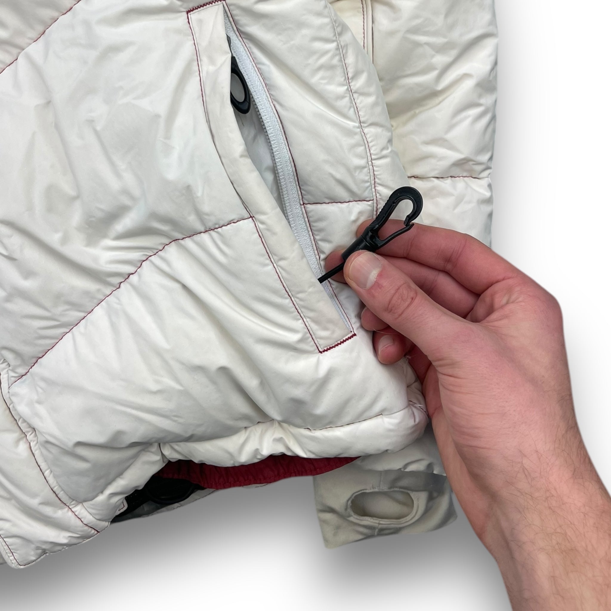 White/Cream with red contrast stitching. 2 front pockets, elasticated waistband, snow skirt, stash pocket on the sleeve & interior stash zipped pocket.