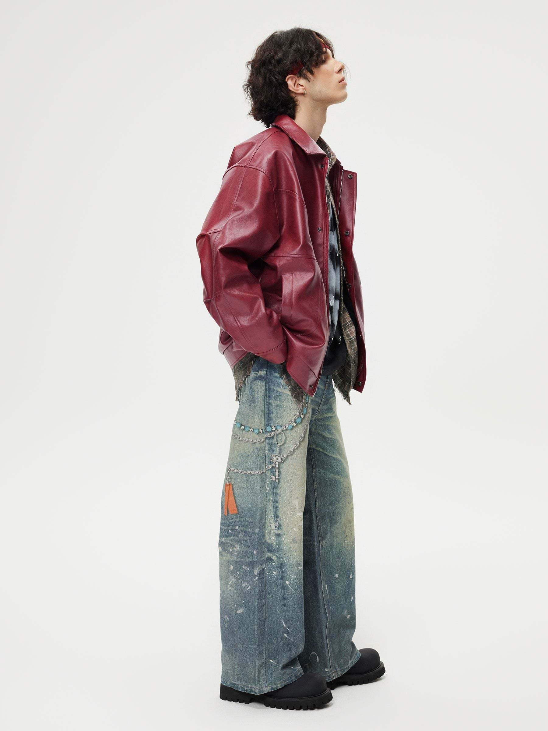 This eye-catching jacket is characterized by a retro burgundy color. Its strong sense of weight reminds you of the elegance of the retro era; while the modern design gives it a fashionable atmosphere. It is made of high-quality artificial leather with textured embellishments. Adds a unique texture. This jacket combines the perfect balance of modern and retro, showing the charm of both fashion and elegance.