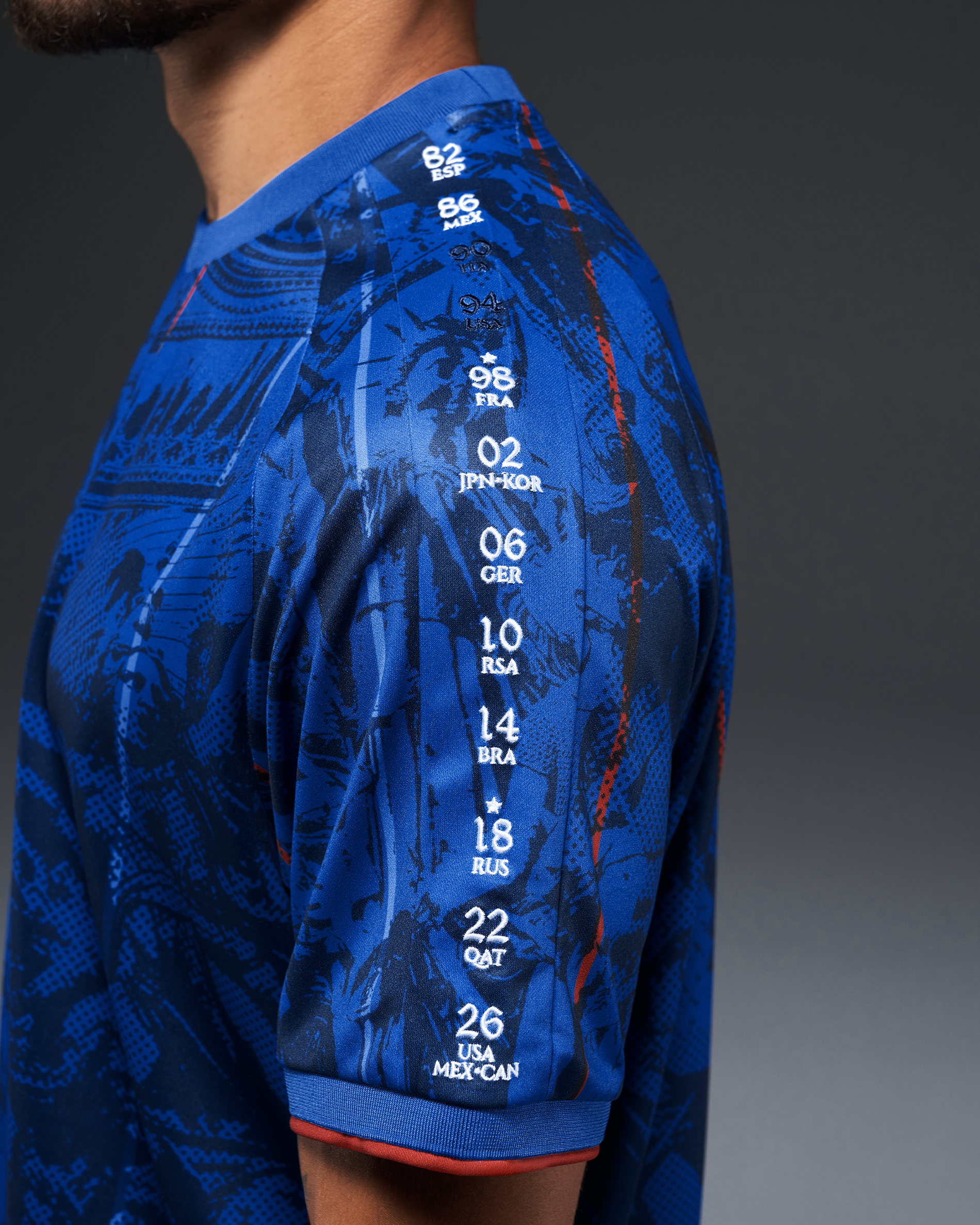 • Every World Cup they entered, embroidered along the sleeves - with stars for their wins in 1998 and 2018.