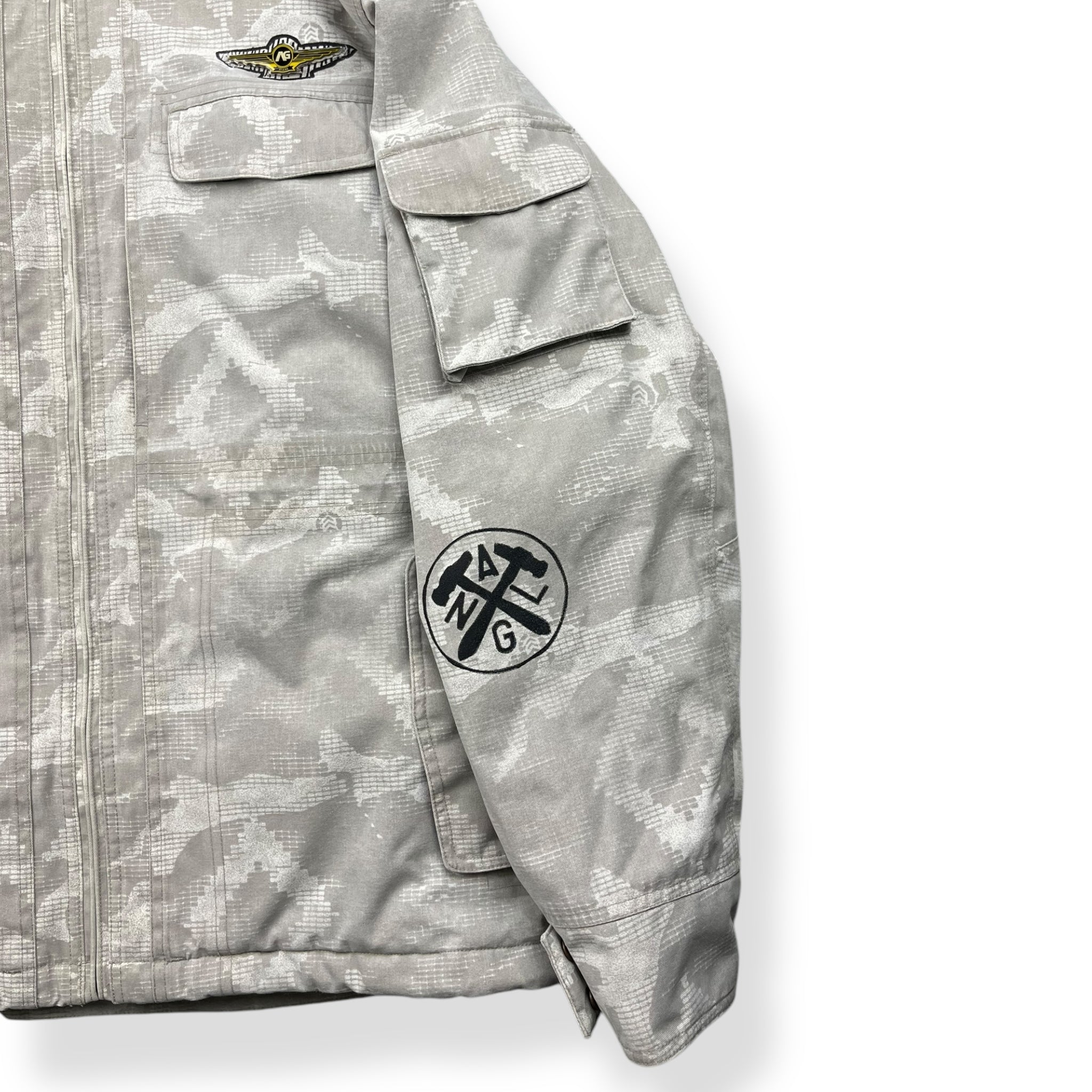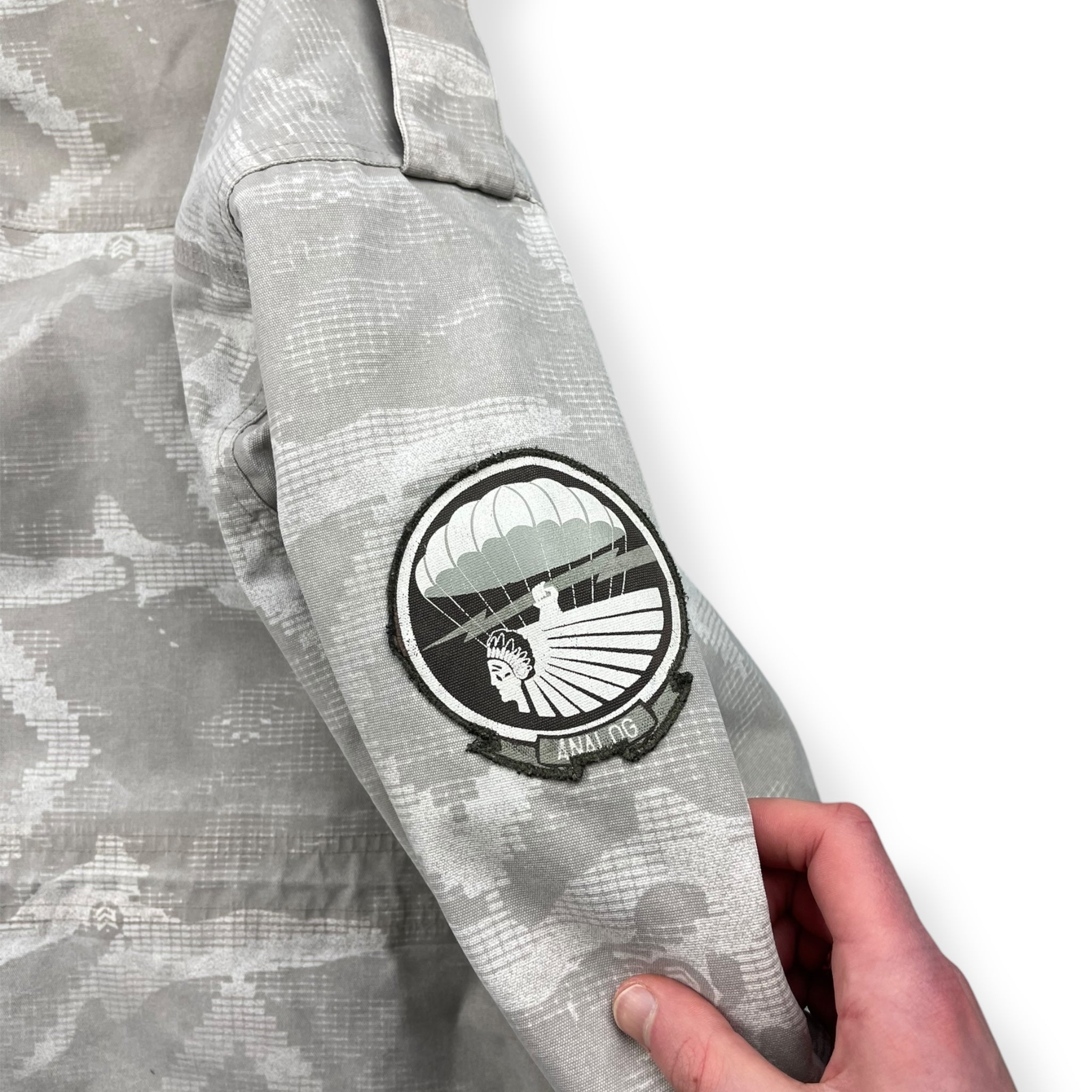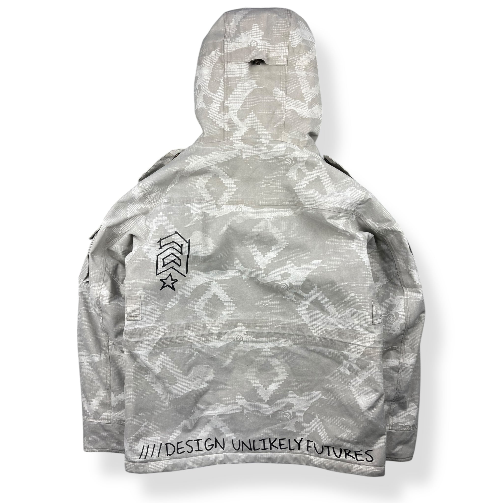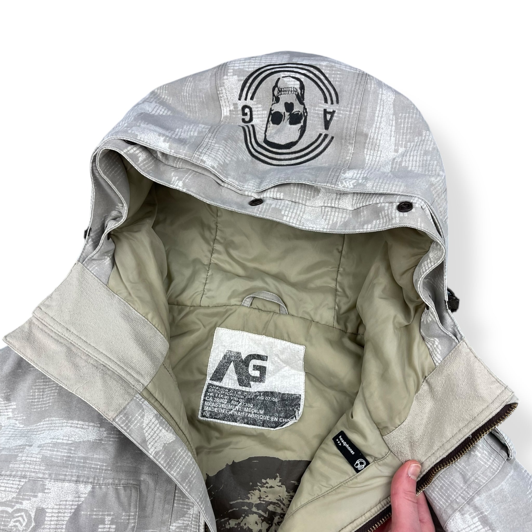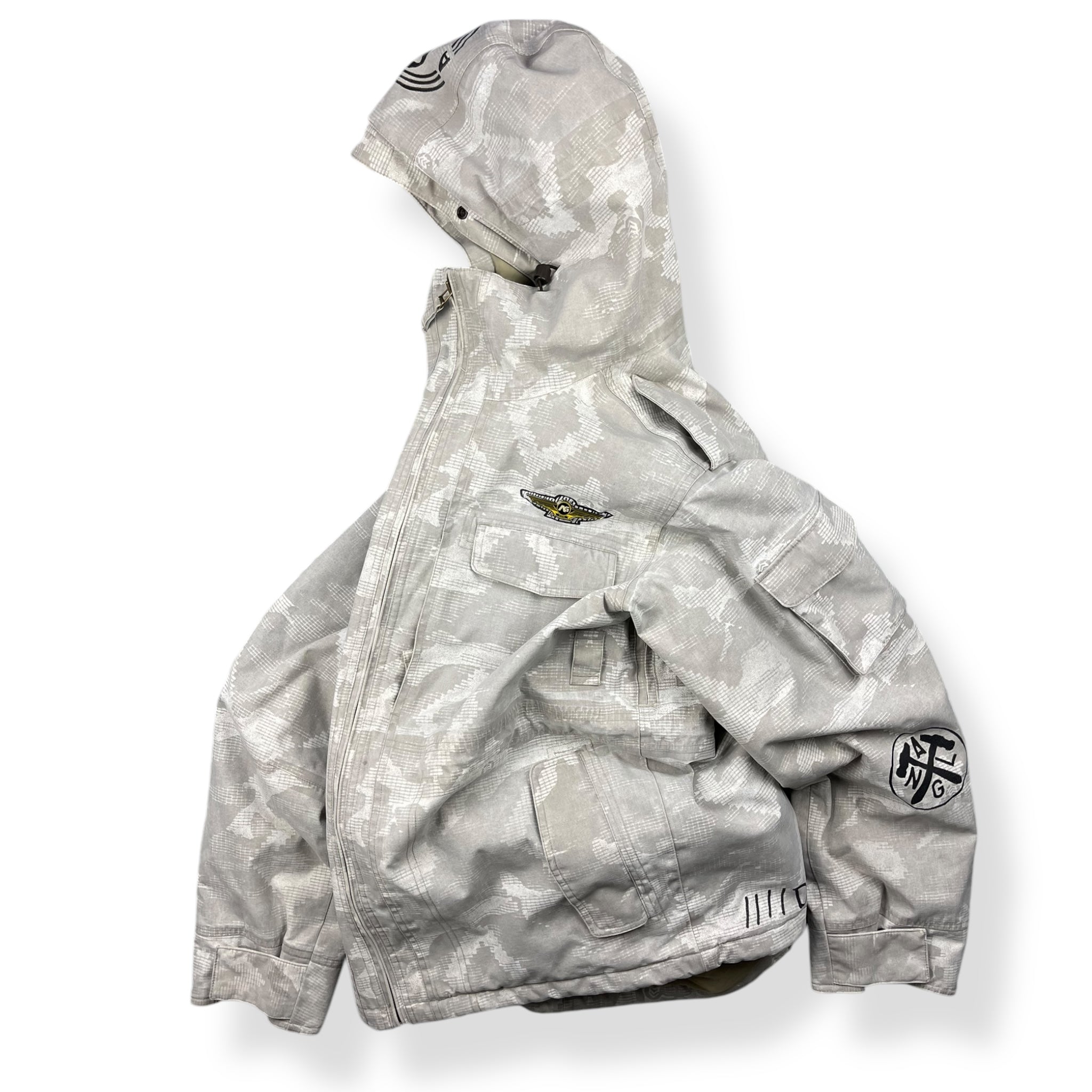 White/grey pixelated camouflage pattern, heavy duty canvas type material, elasticated hood & waist hem, snow skirt, ski pass wallet & headphone ports.