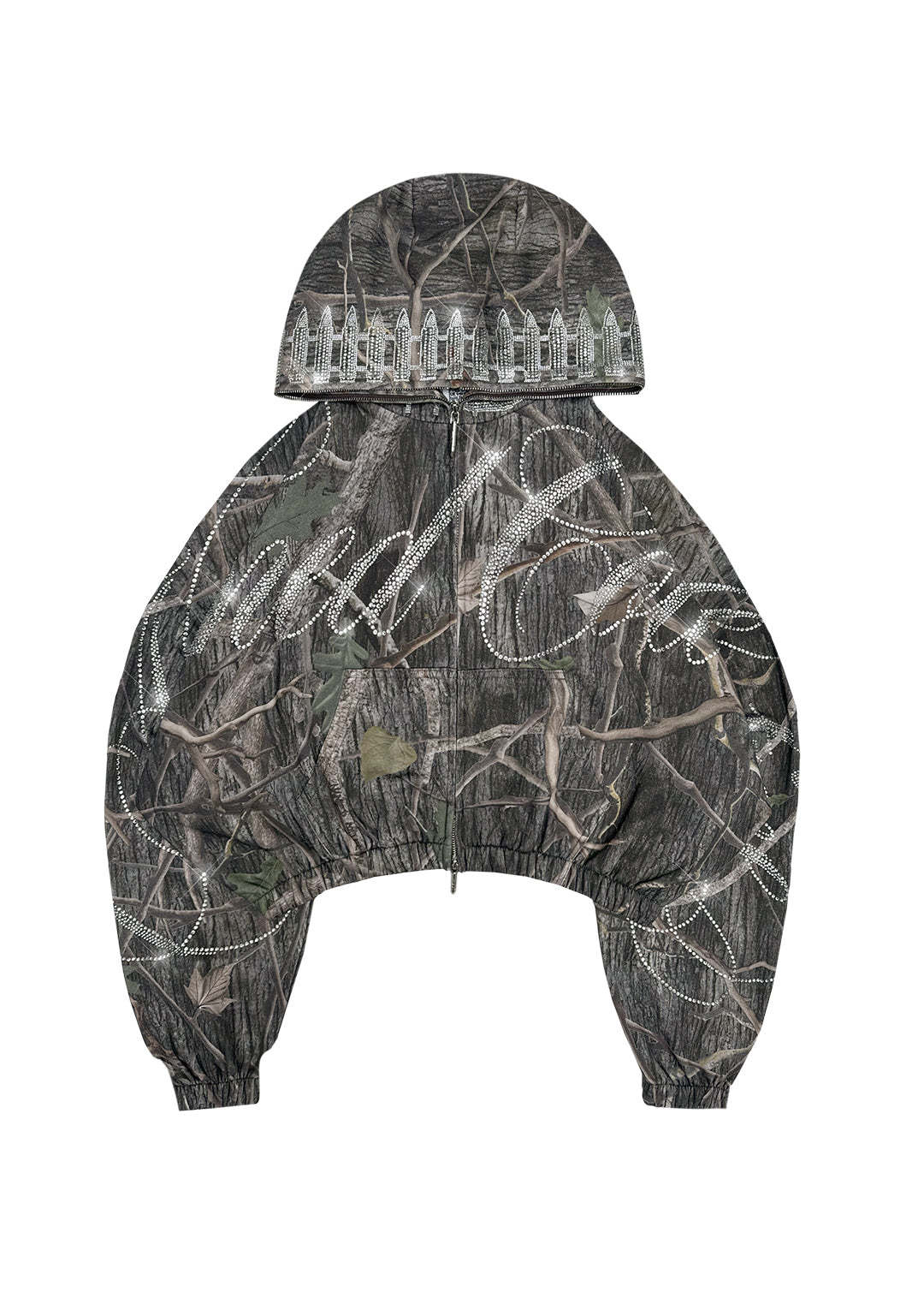 ENEMY RHINESTONE CROP ZIP HOODIE TREE CAMO