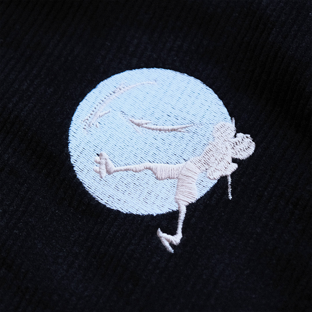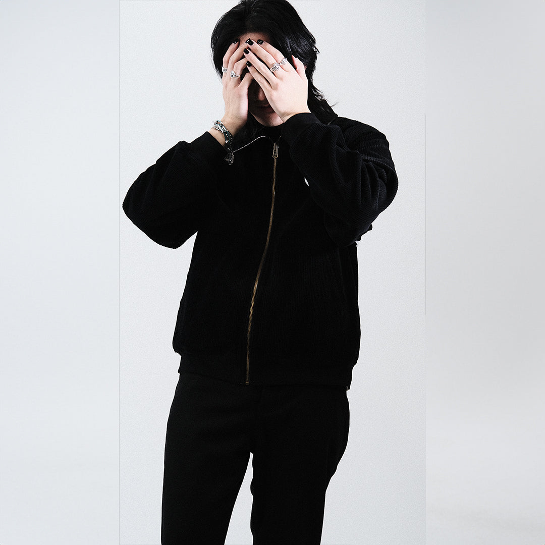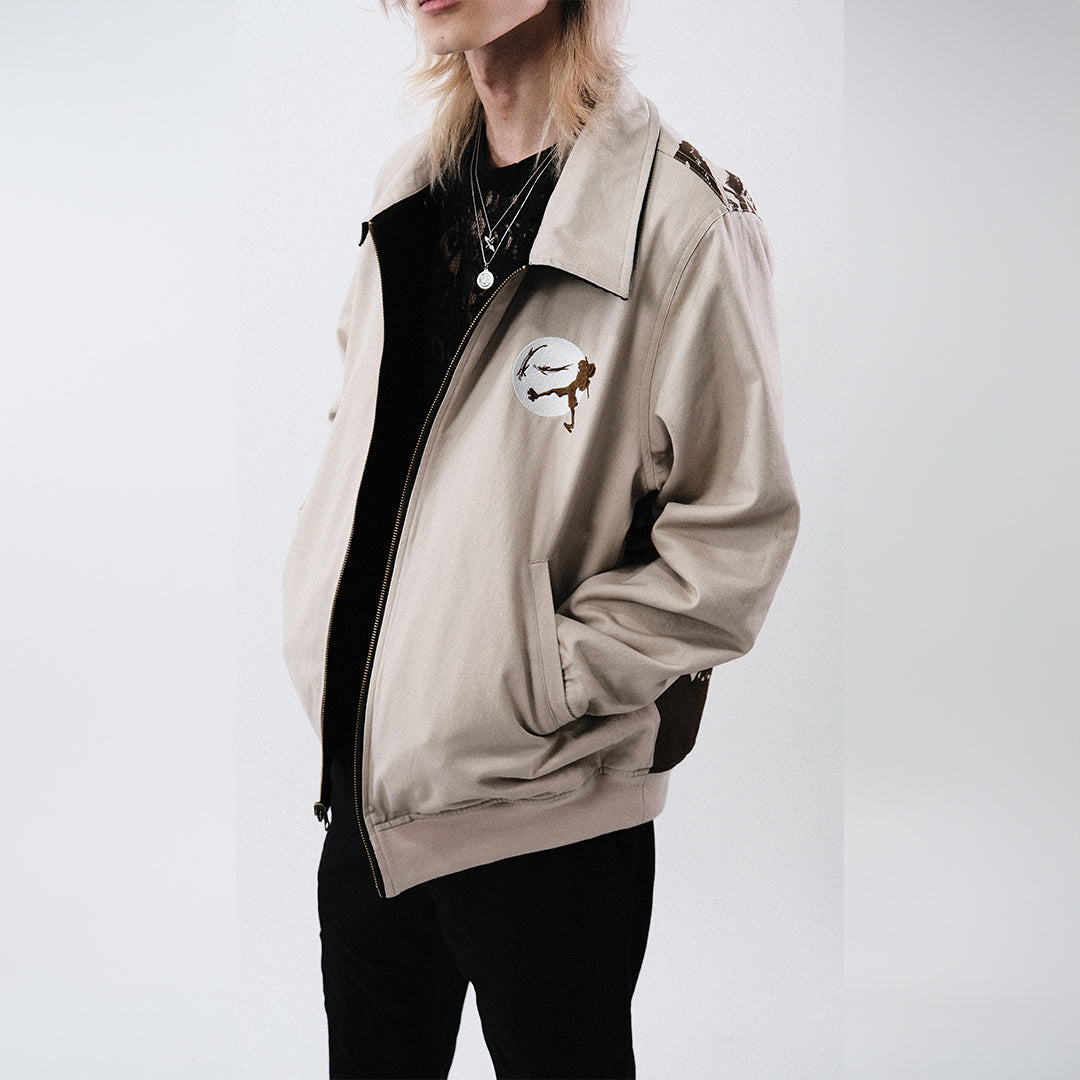 Reversible Jacket made with premium 100% cotton woven twill in beige, 100% cotton corduroy in black. Small front left chest embroidery, full screen printed graphics on back. Zip up jacket.