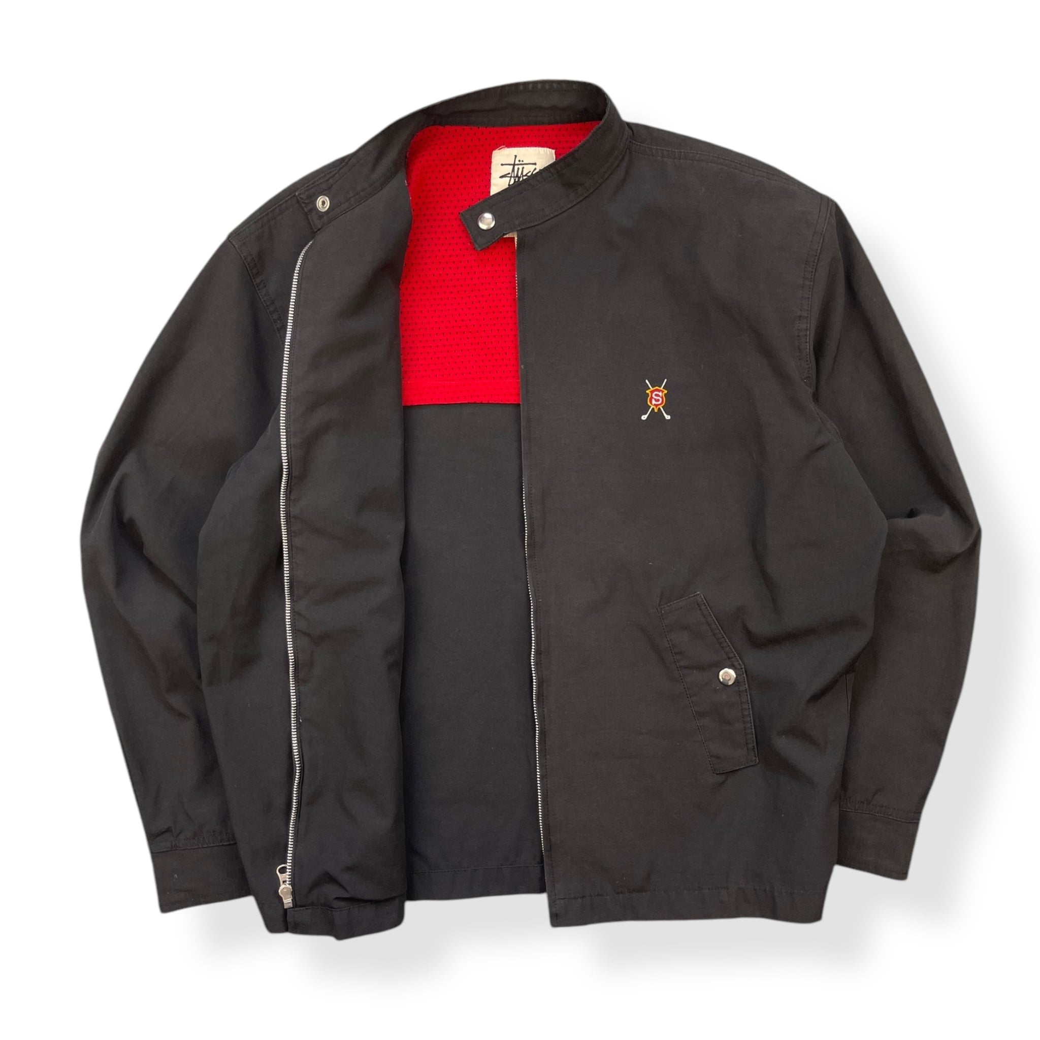 Black jacket with red mesh interior. Embroidered golf club logo on the chest.