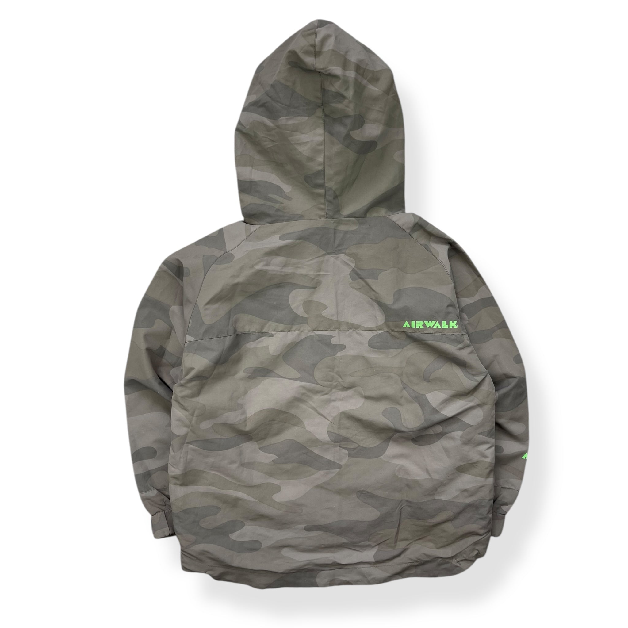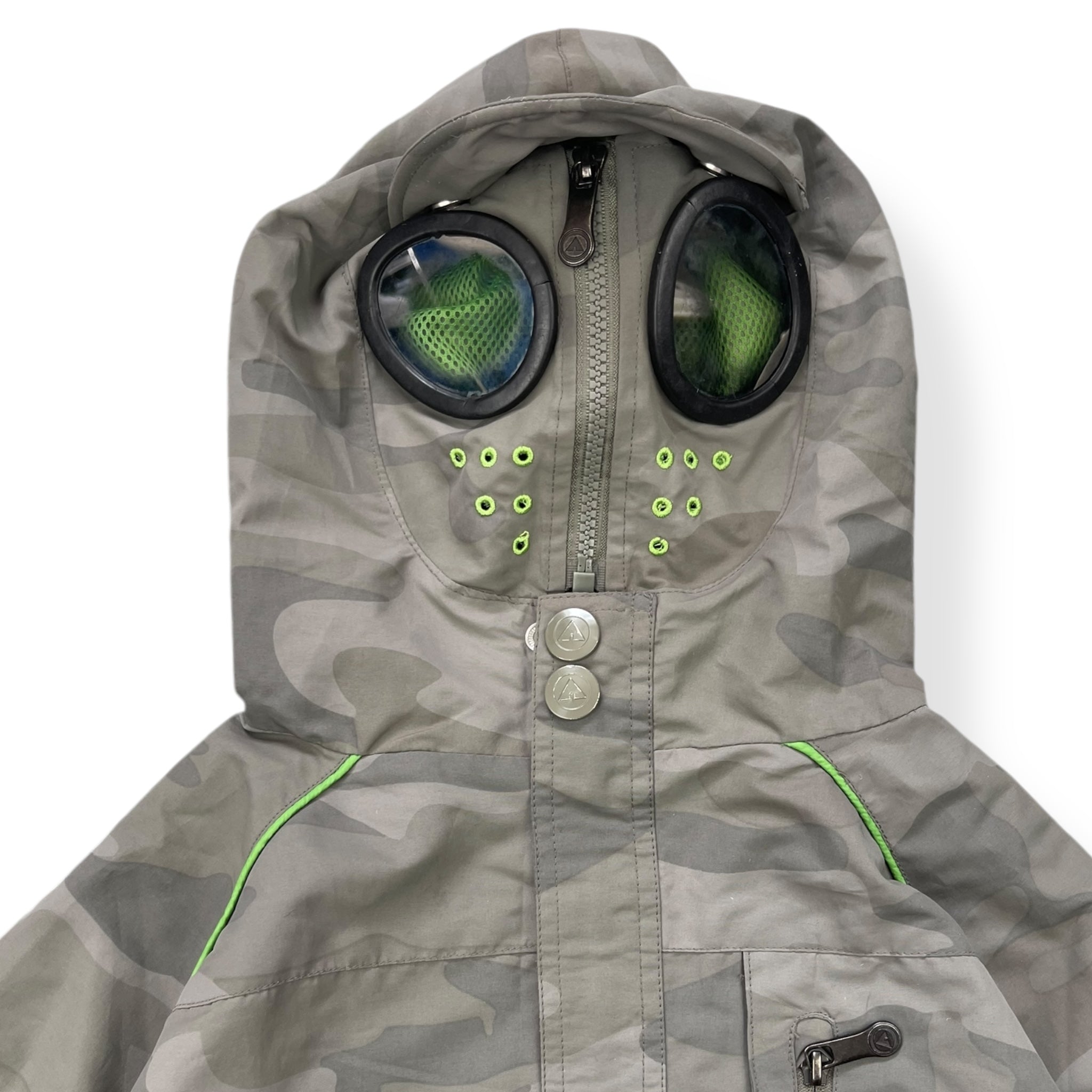 Full face zip with goggles that can be seen out of. Stash chest pocket.