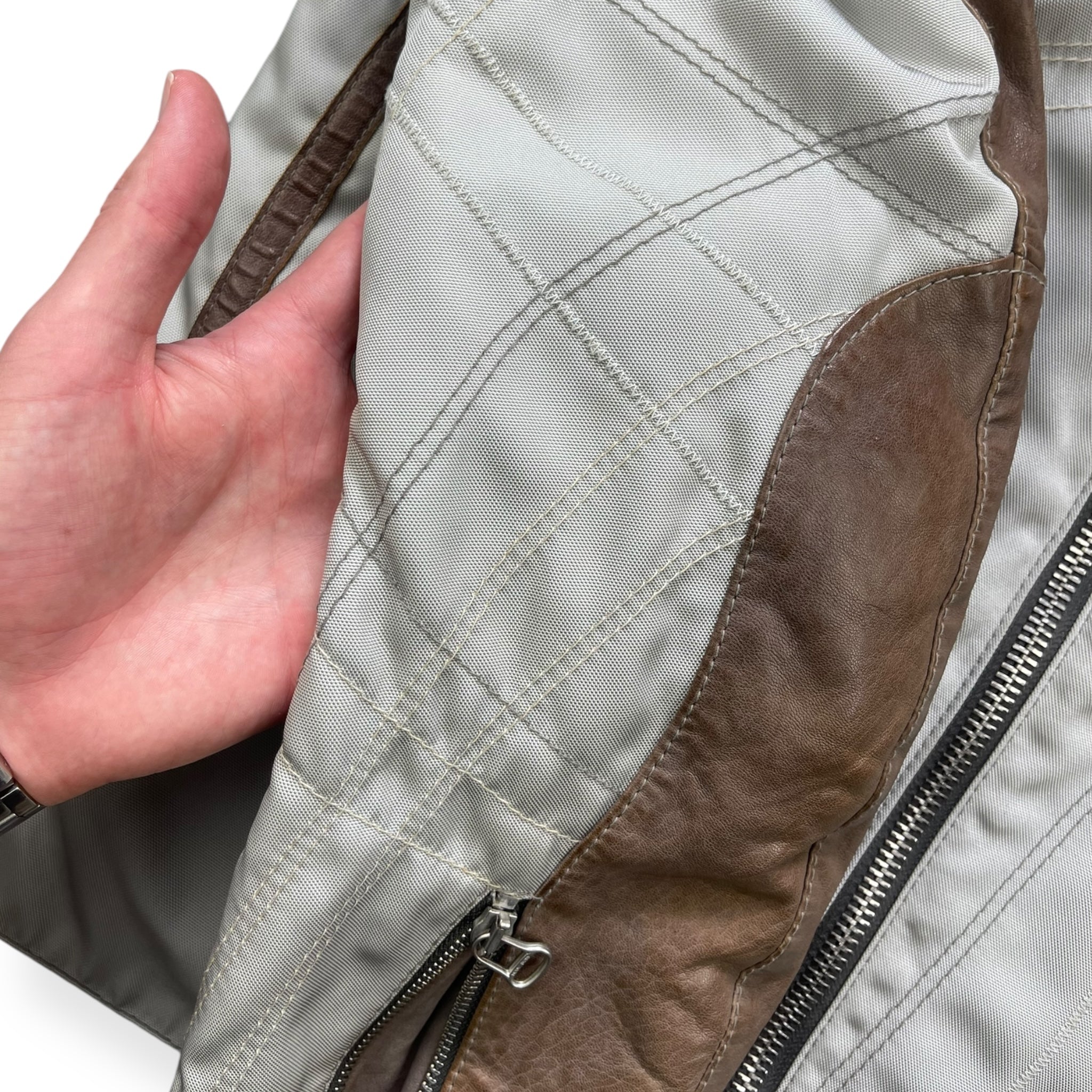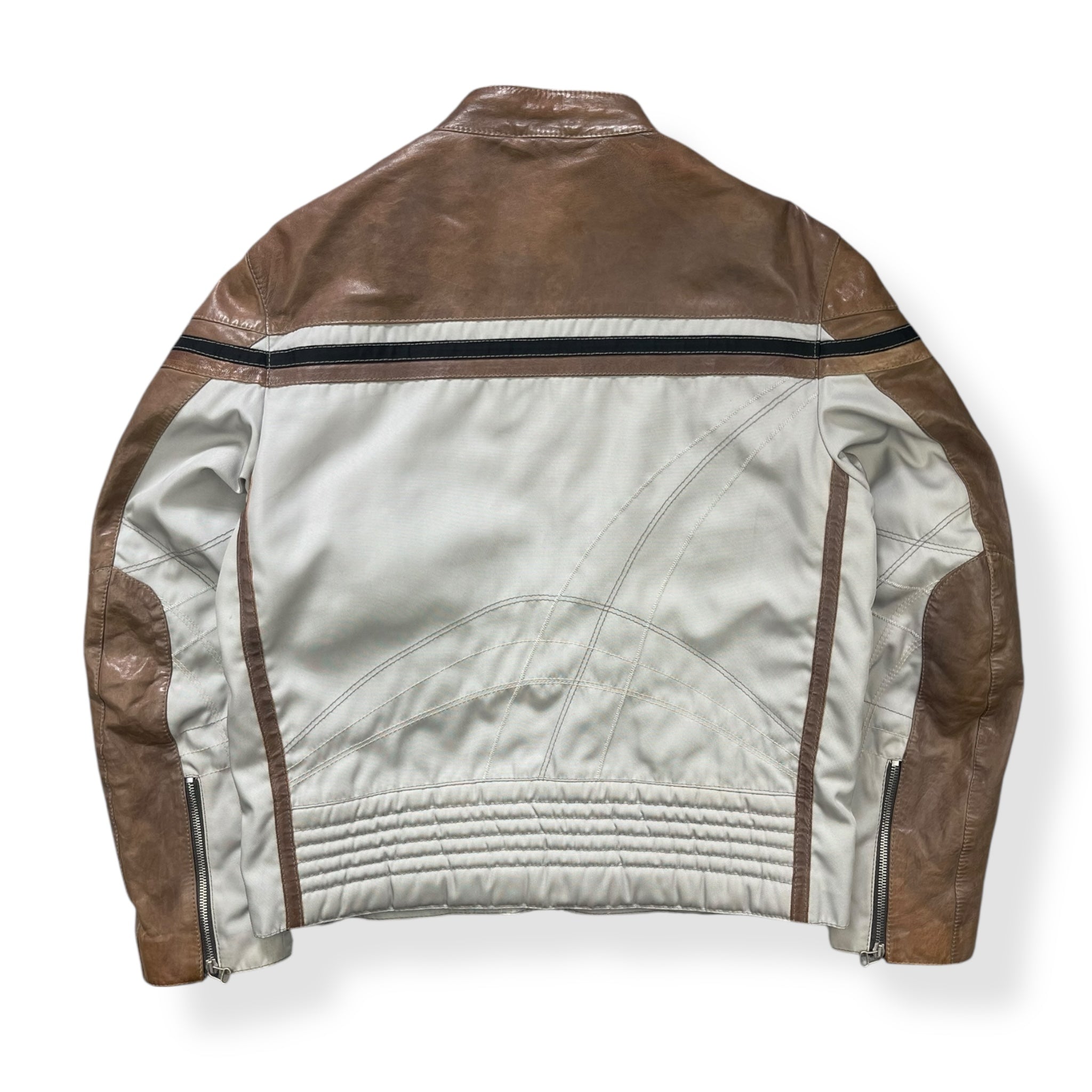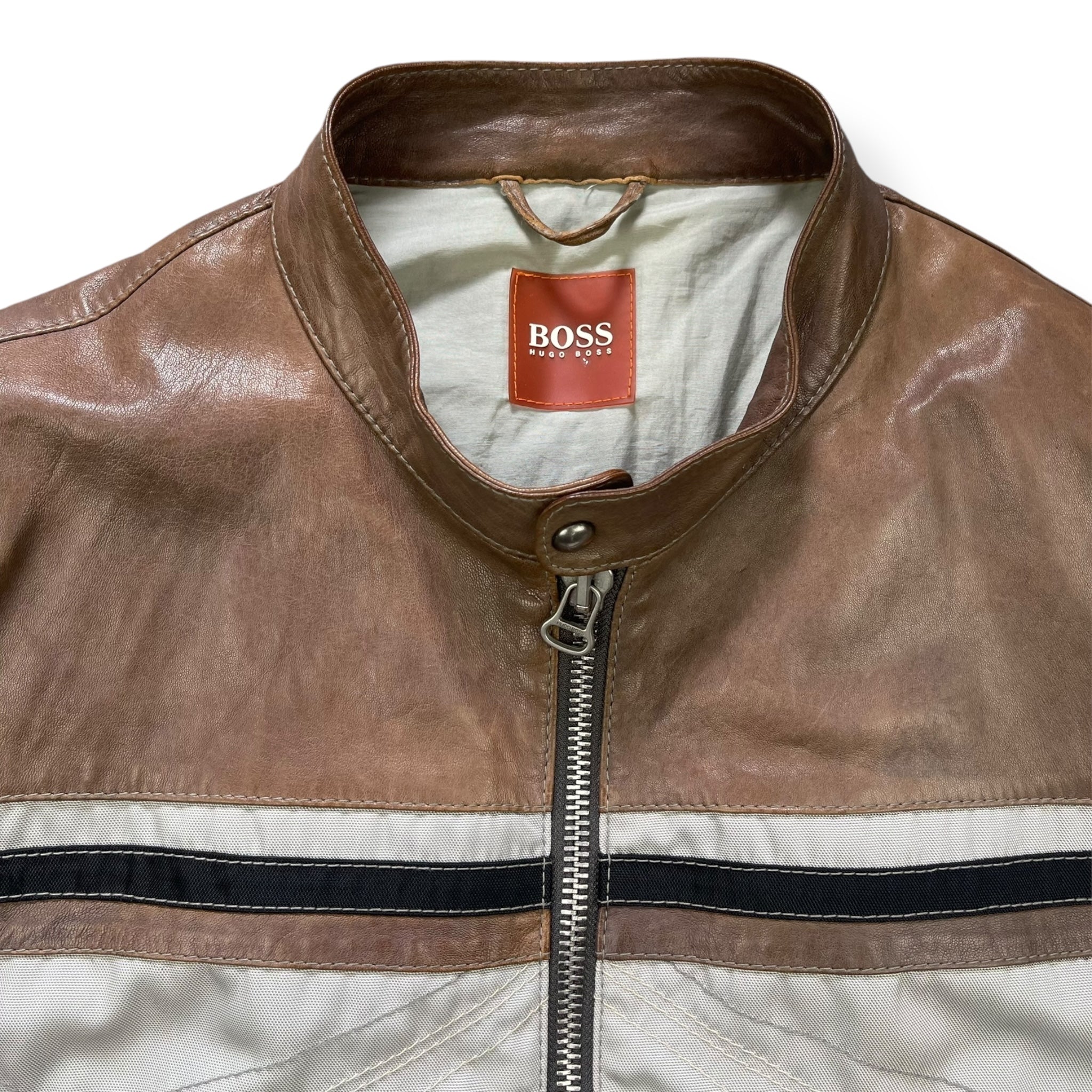 Supple, brown leather mixed with a high quality 'ballistic' nylon in an off white colour. Nice stitch detailing running across the front, down the sleeves & on the back. Riri zippers with a tiny engraved 'Hugo Boss', big metal popper on the collar, expandable zips on the cuffs & a padded waist hem on the back. From the Hugo Boss Orange line that began in 1999.