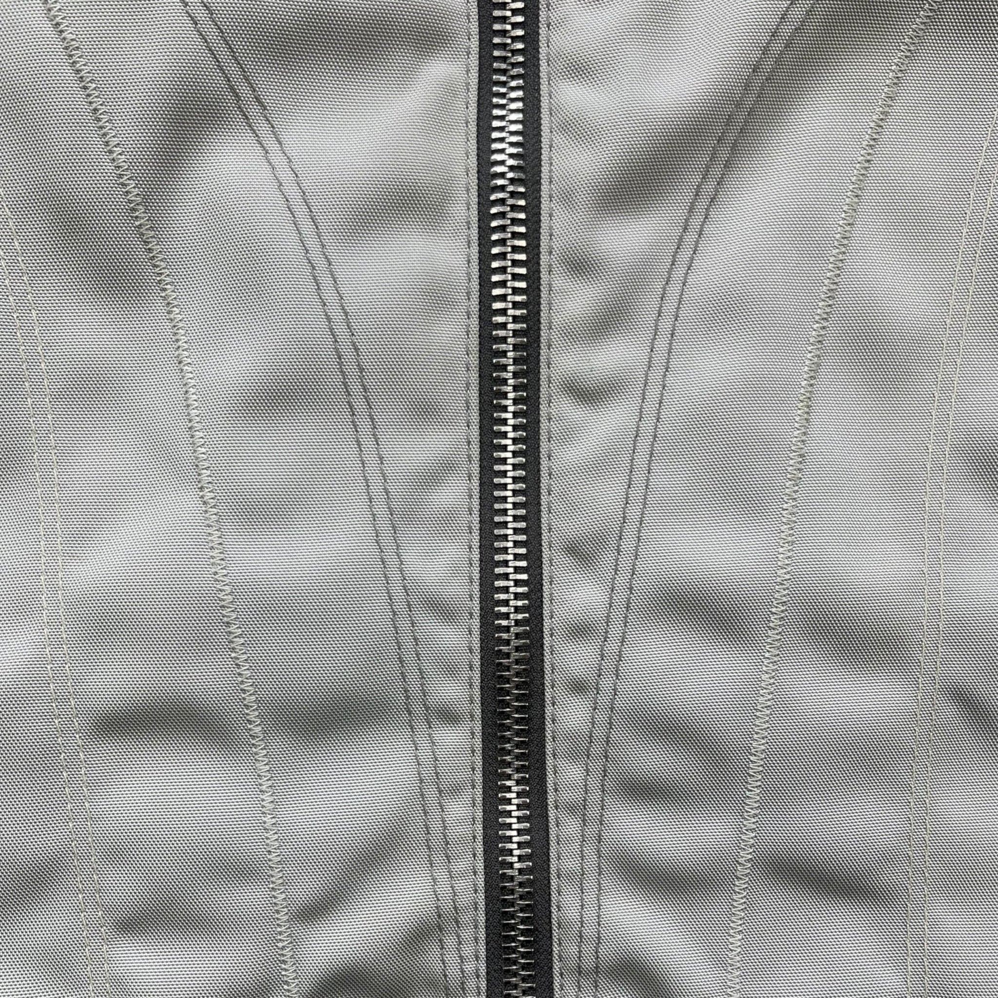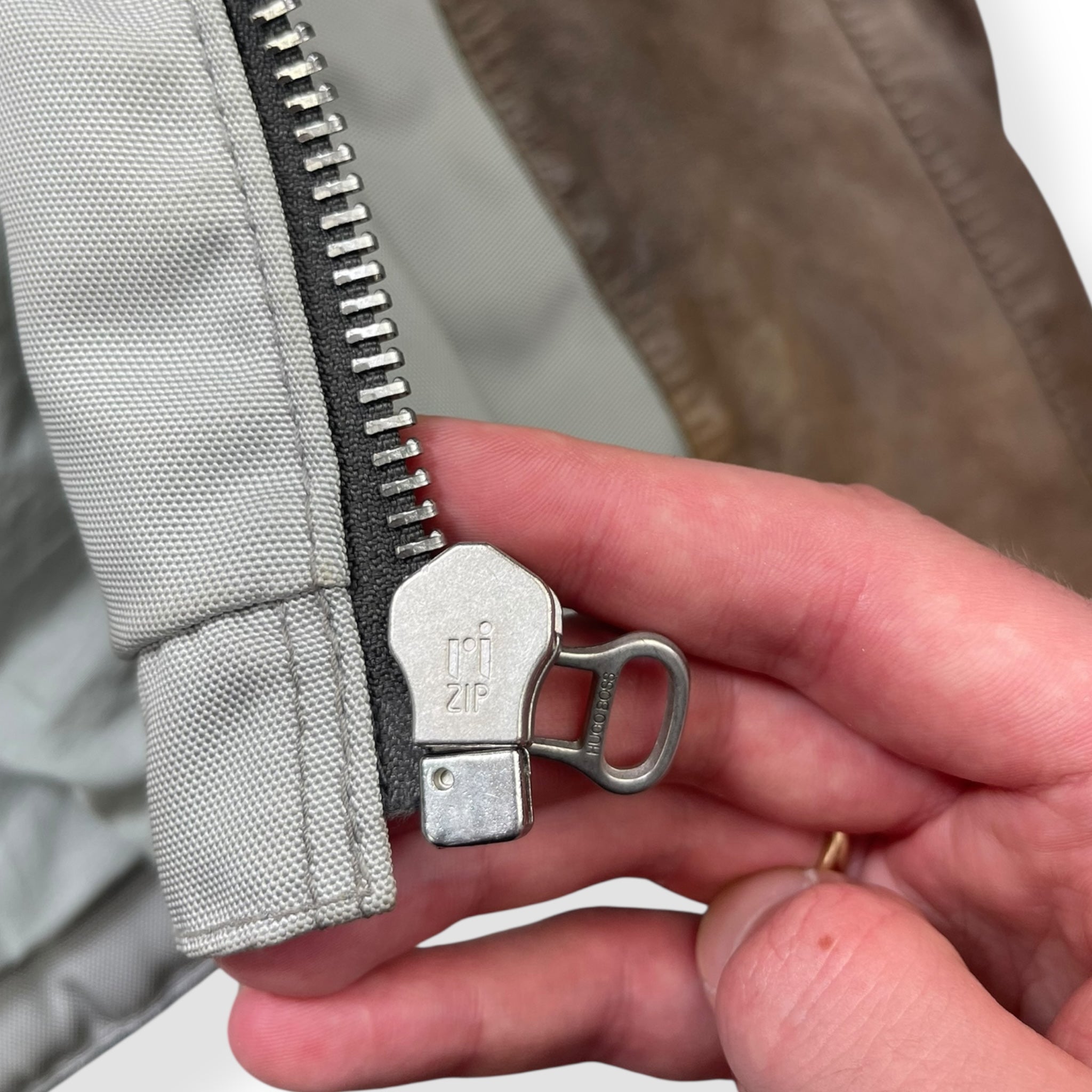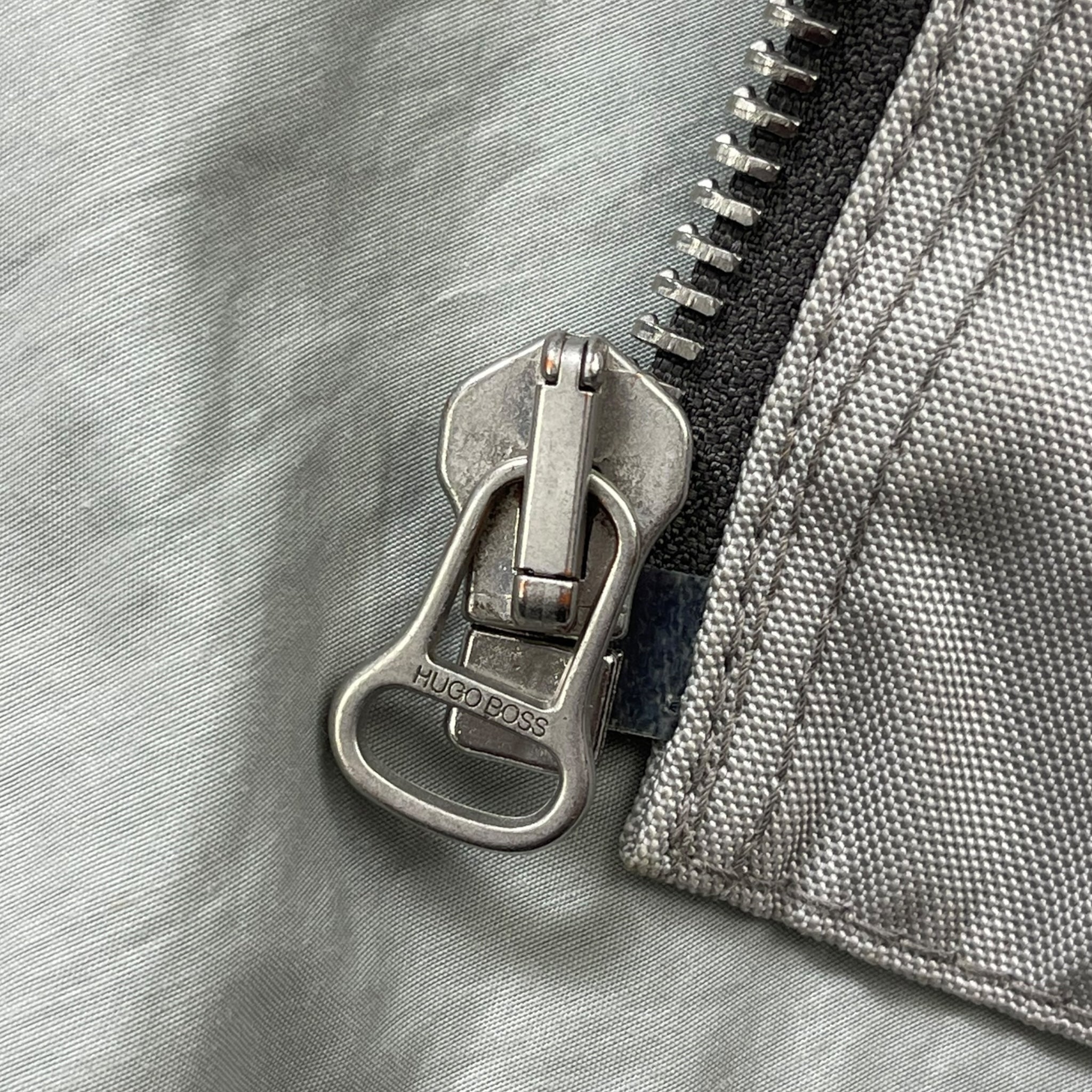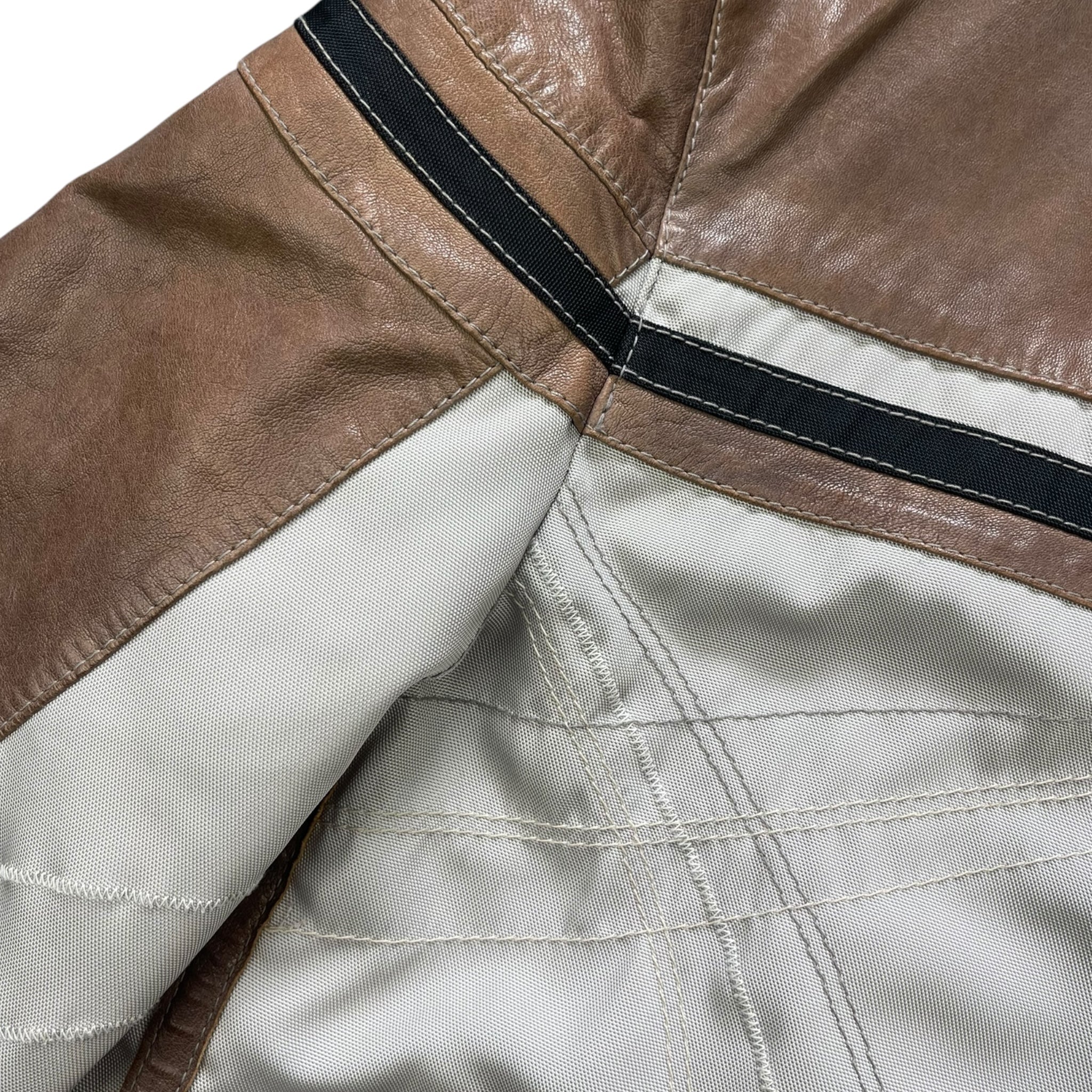 Supple, brown leather mixed with a high quality 'ballistic' nylon in an off white colour. Nice stitch detailing running across the front, down the sleeves & on the back. Riri zippers with a tiny engraved 'Hugo Boss', big metal popper on the collar, expandable zips on the cuffs & a padded waist hem on the back. From the Hugo Boss Orange line that began in 1999.