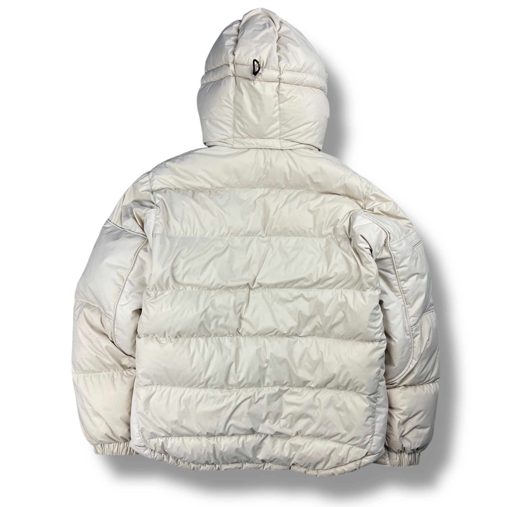Cream colourway. Peaked & elasticated hood & waist hem, super puffy down filling, multiple pockets inc stash zip pockets on both sleeves, detachable hood.