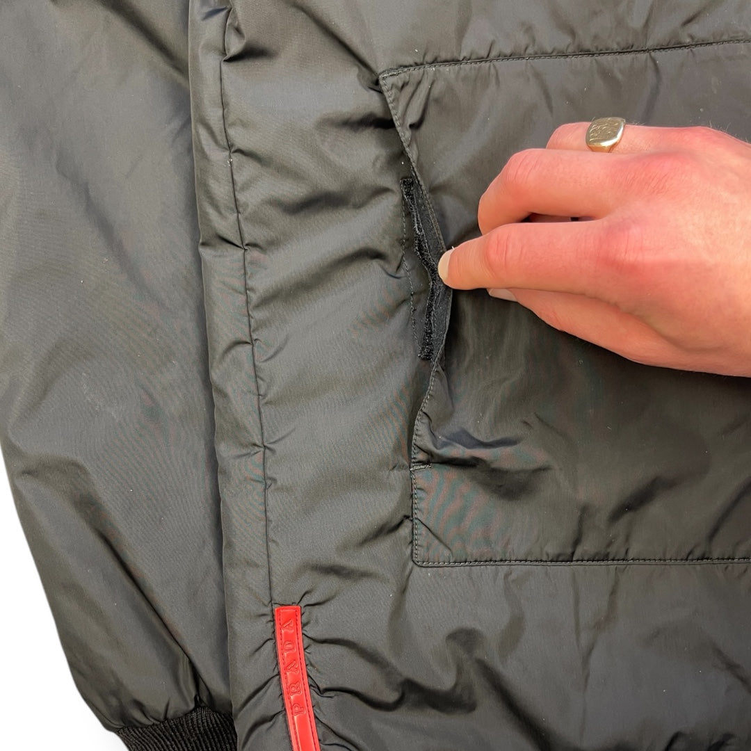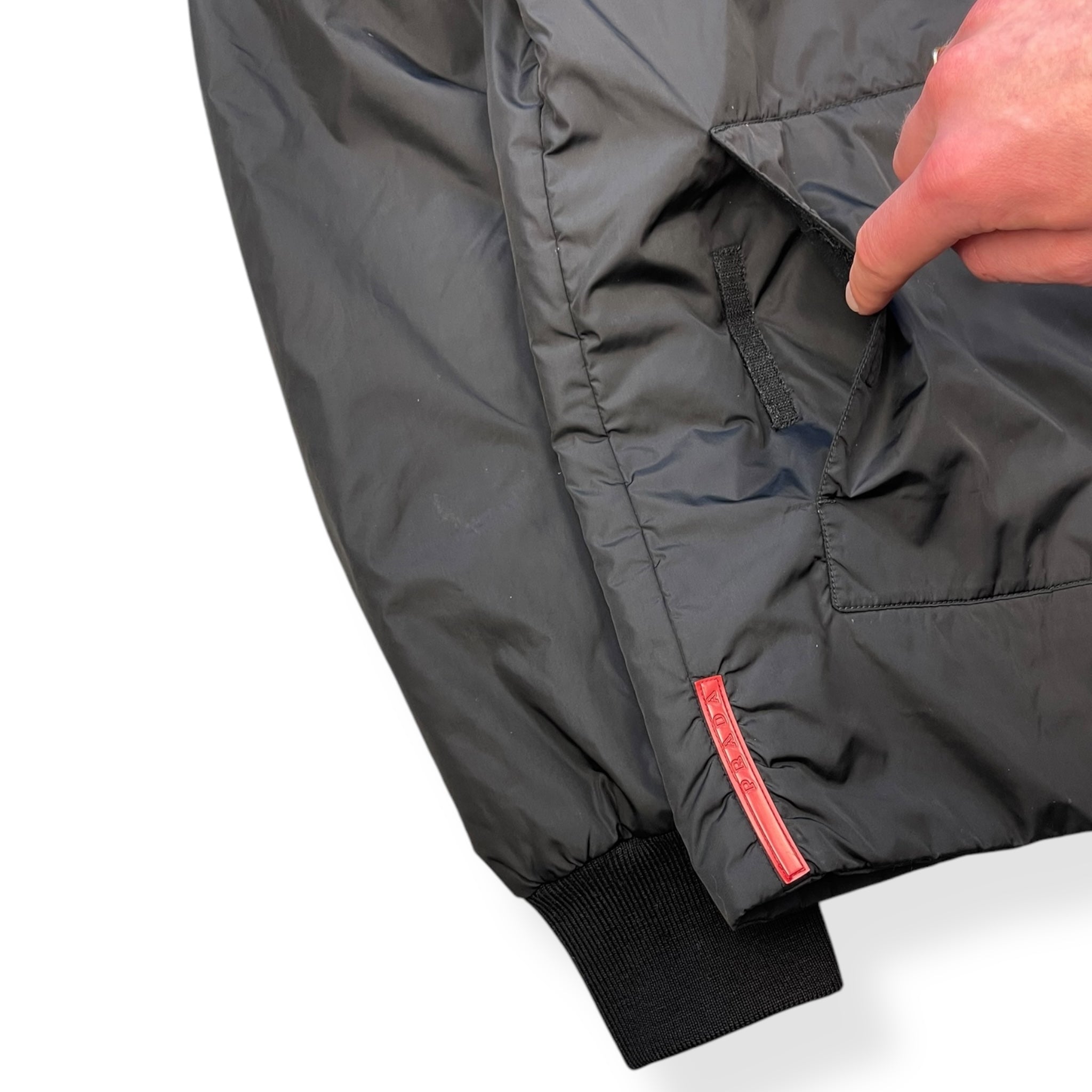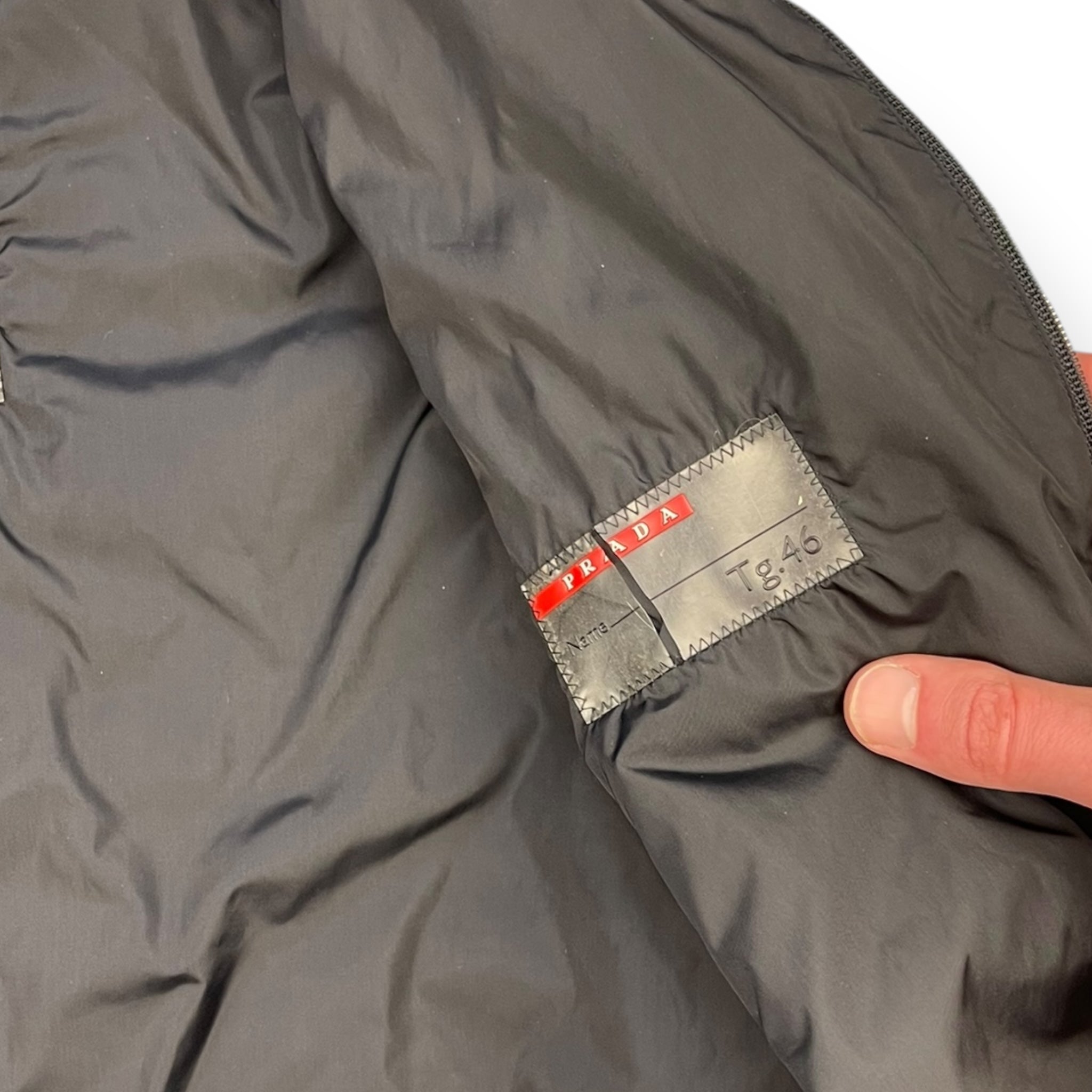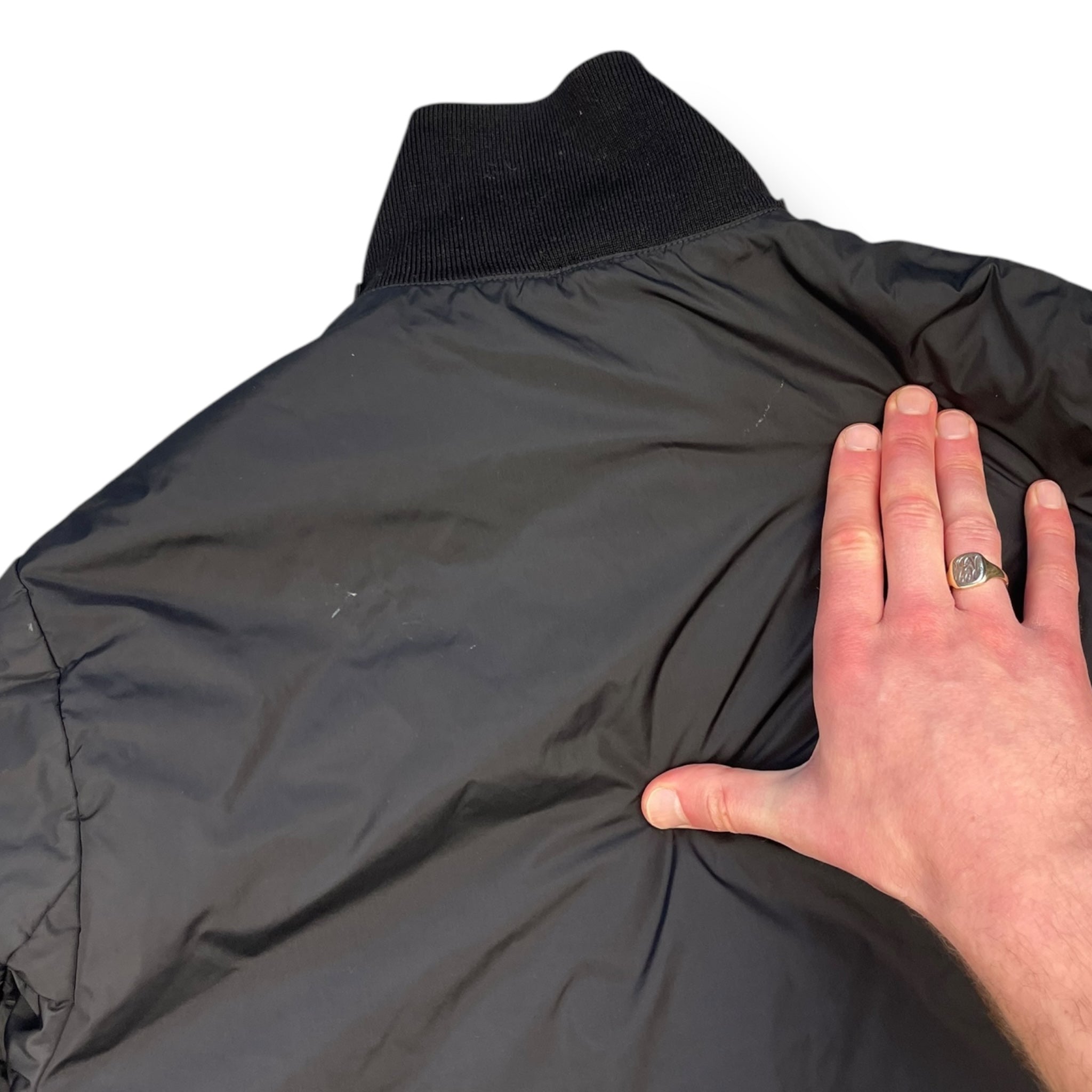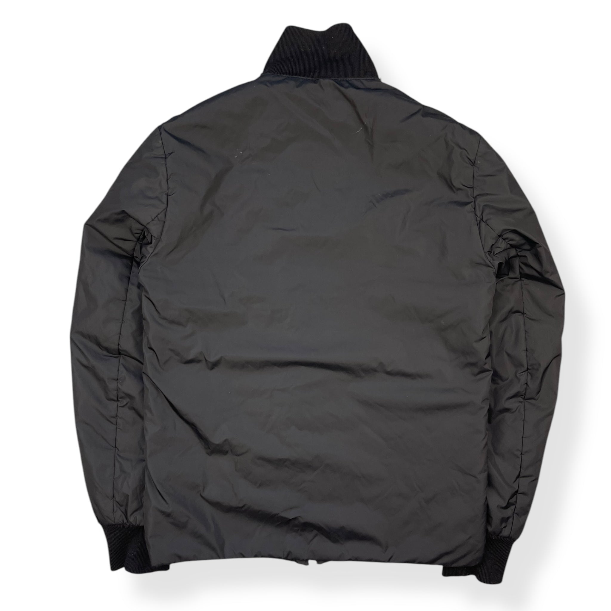 Nylon body with ribbed cotton collar & cuffs. Full zip, 2 front velcro pockets.