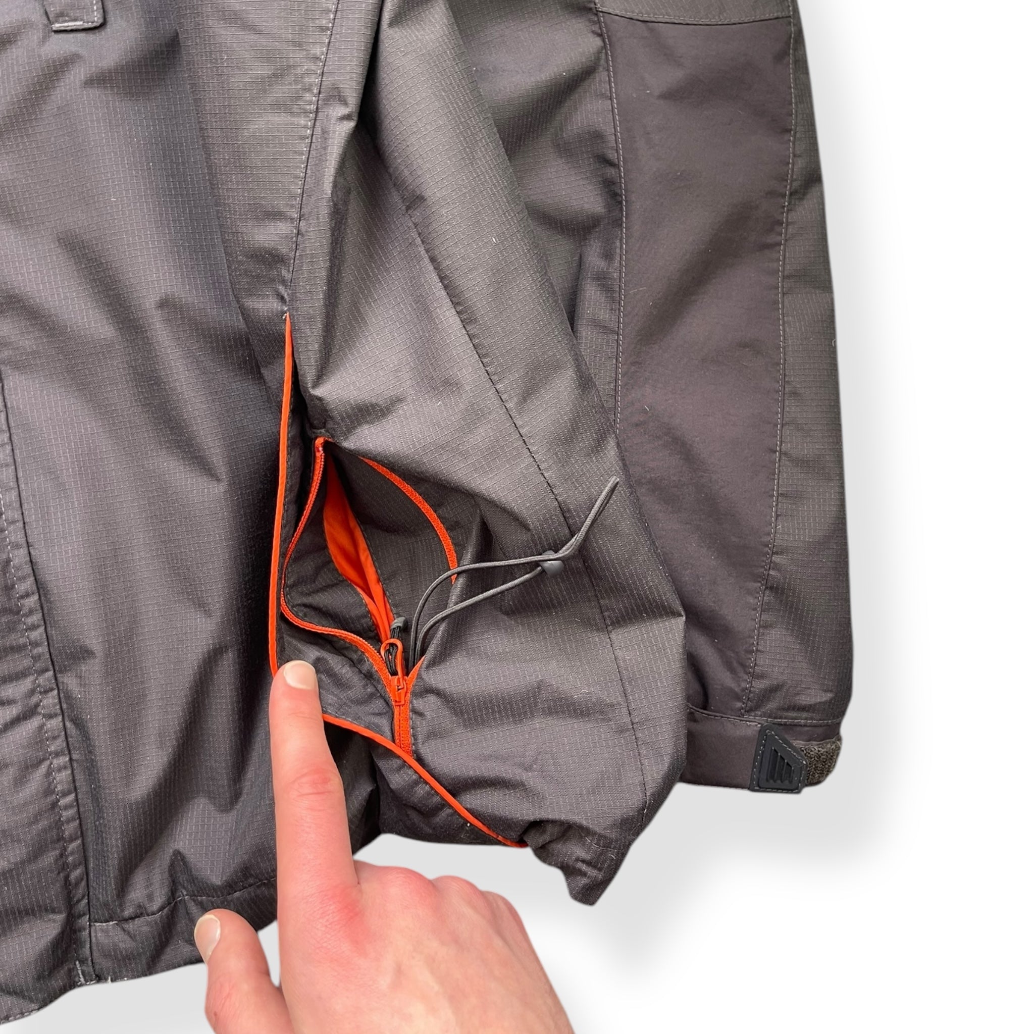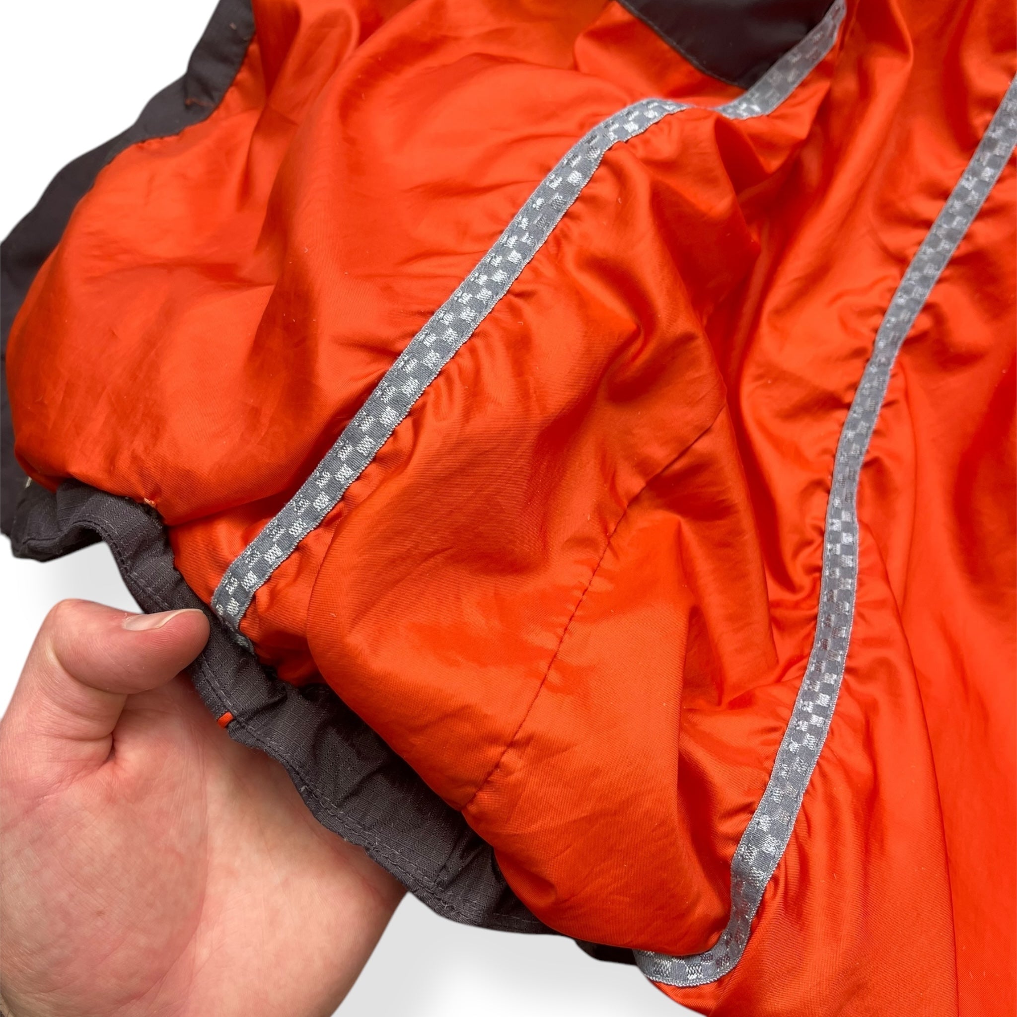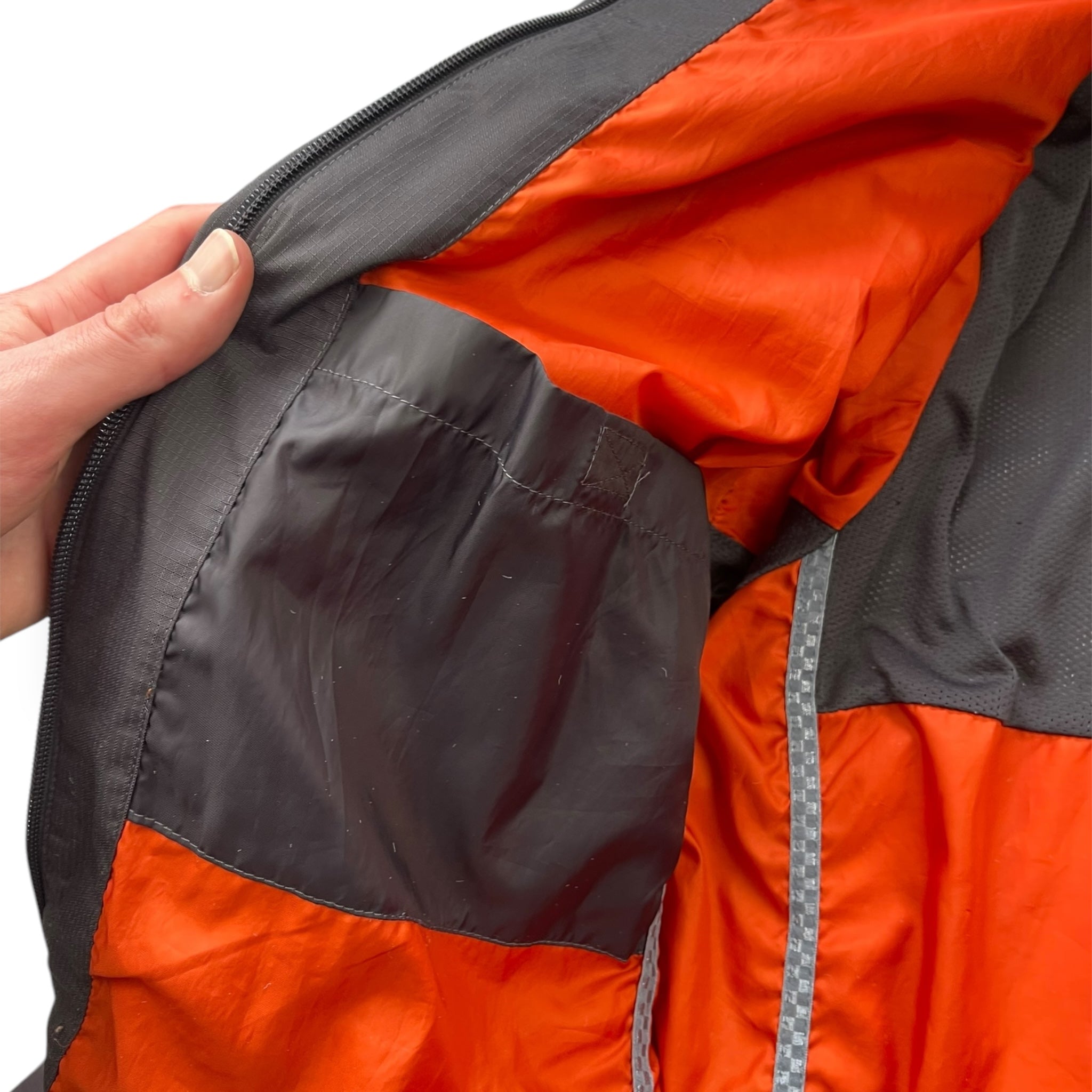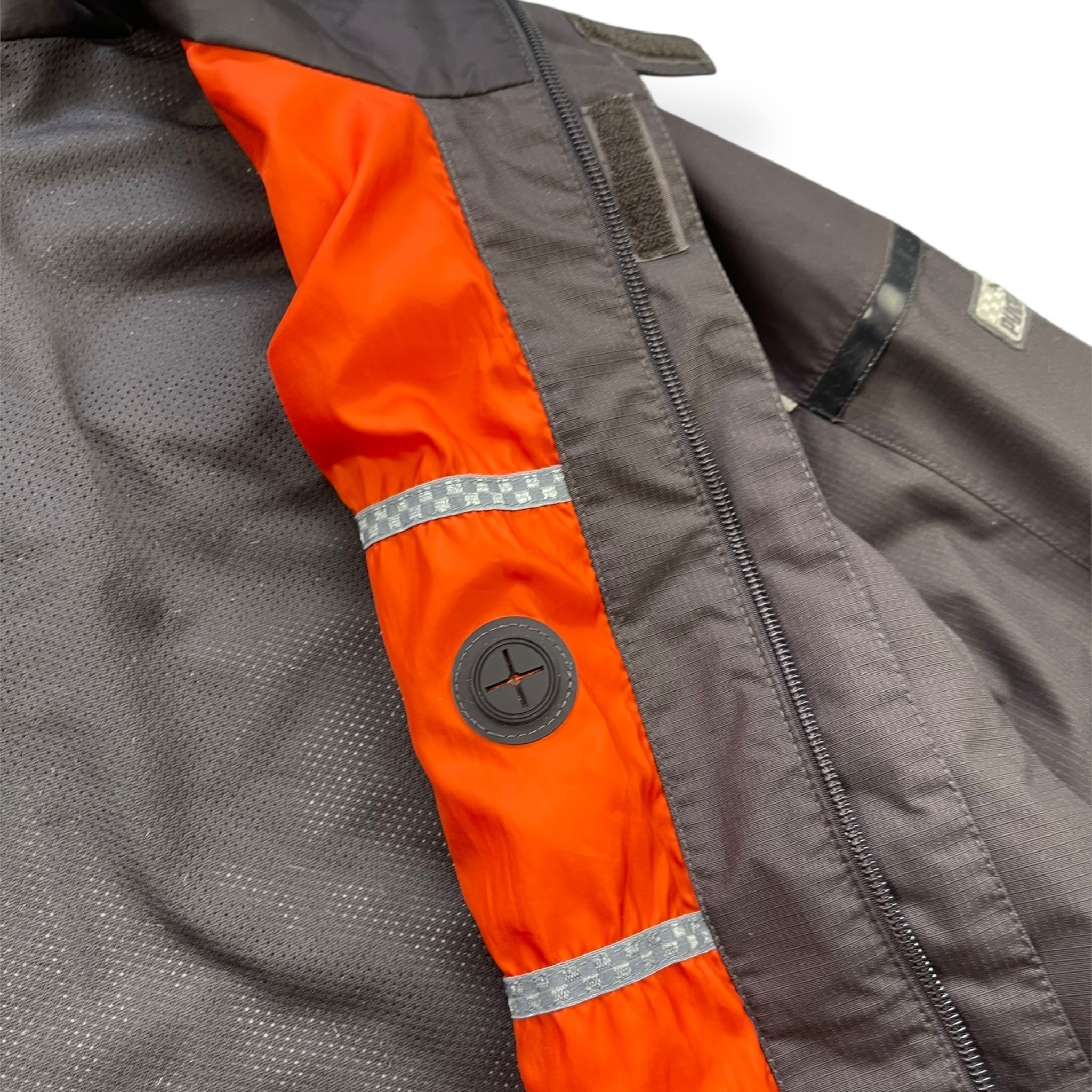 Grey ripstop exterior with vibrant orange interior lining/detailing, stash chest pocket, headphone port for audio devices, large back ventilation zip, stash interior velcro pockets, race-inspired checkered piping.