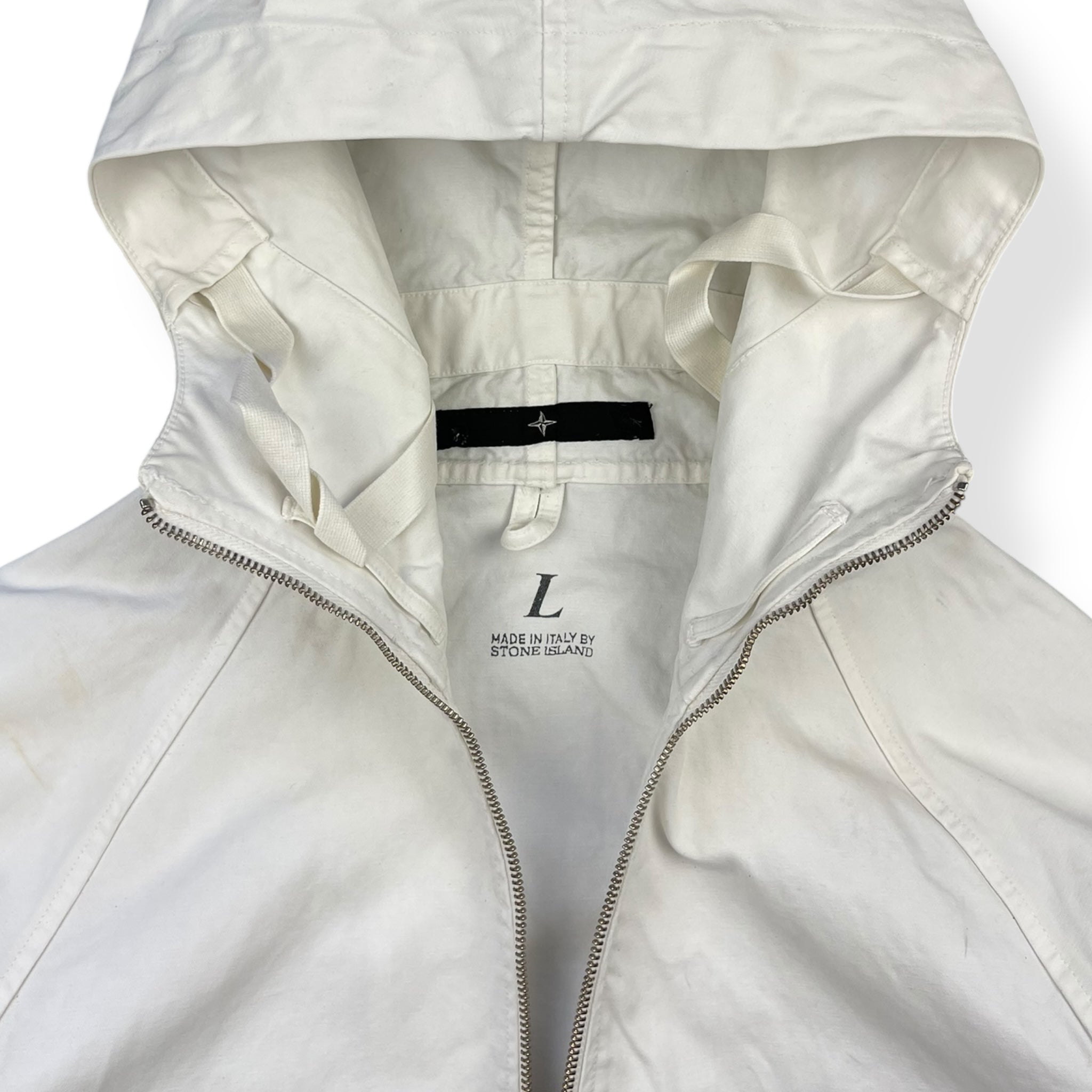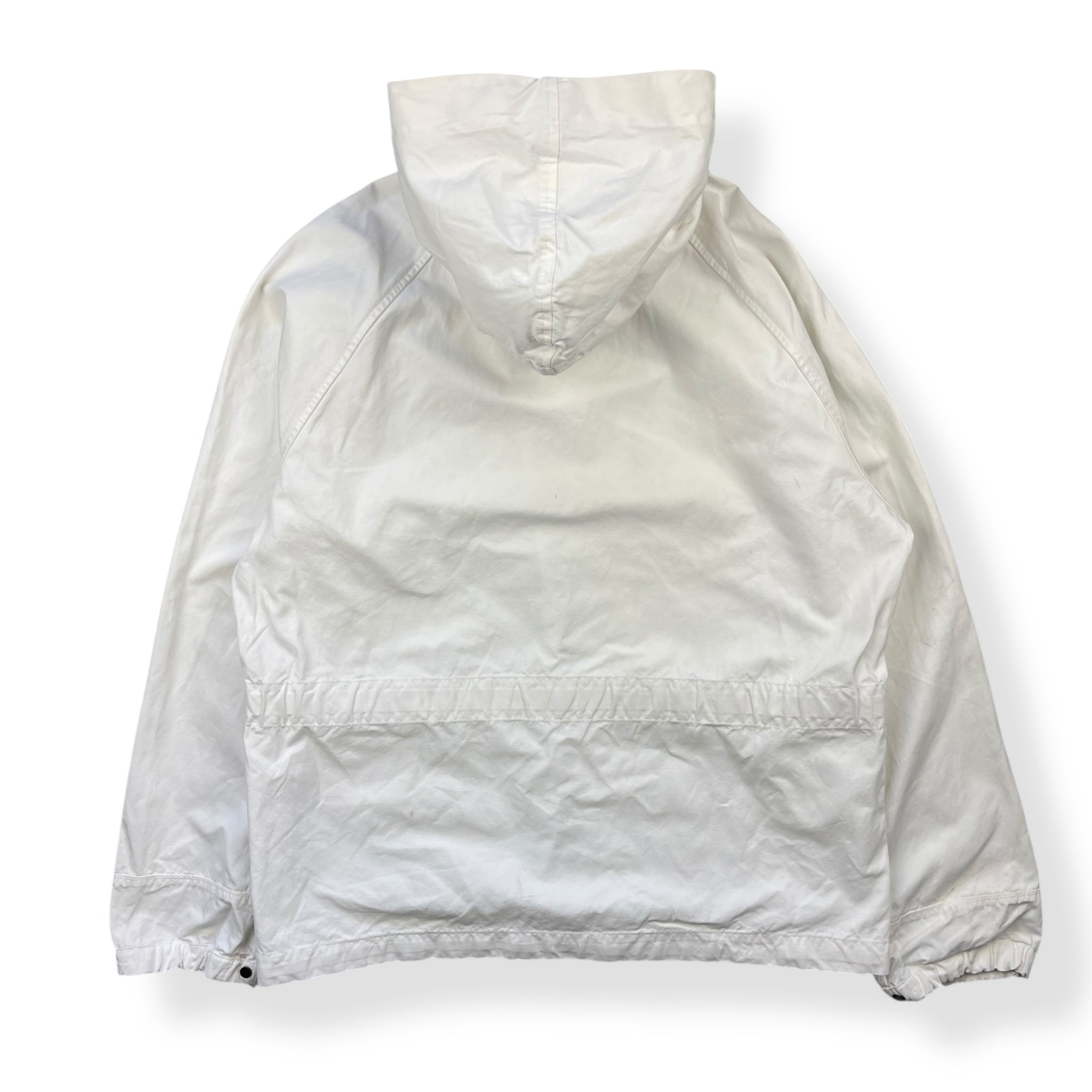 Durable, white, canvas material. Full zip main body opening, spacious hood, buttoned pockets either side of the body & subtle SI Denims spellout on the sleeve.
