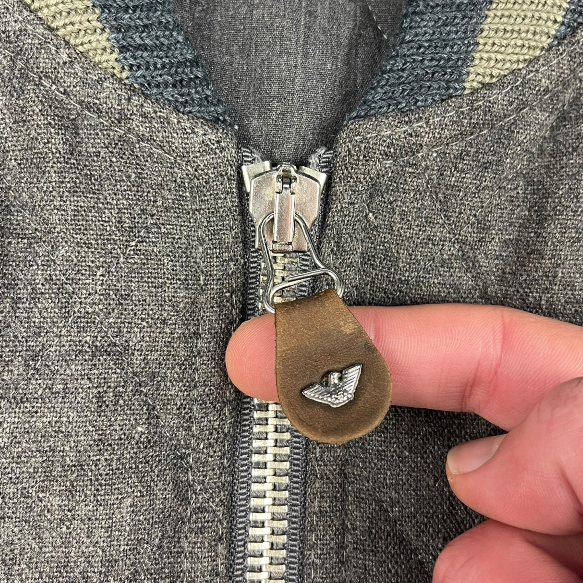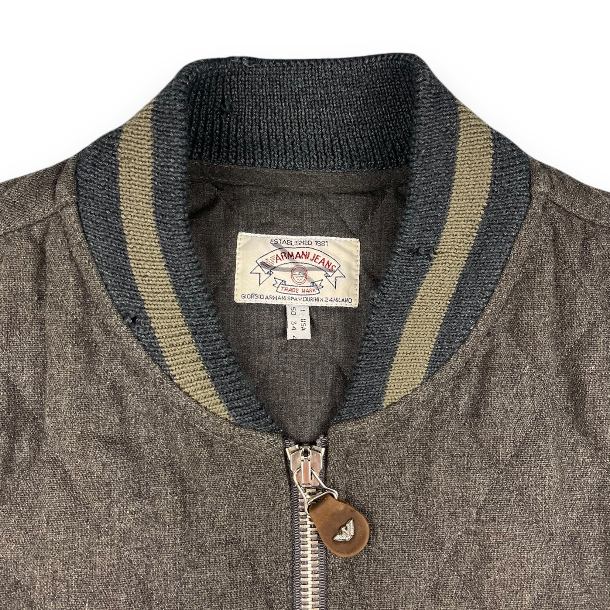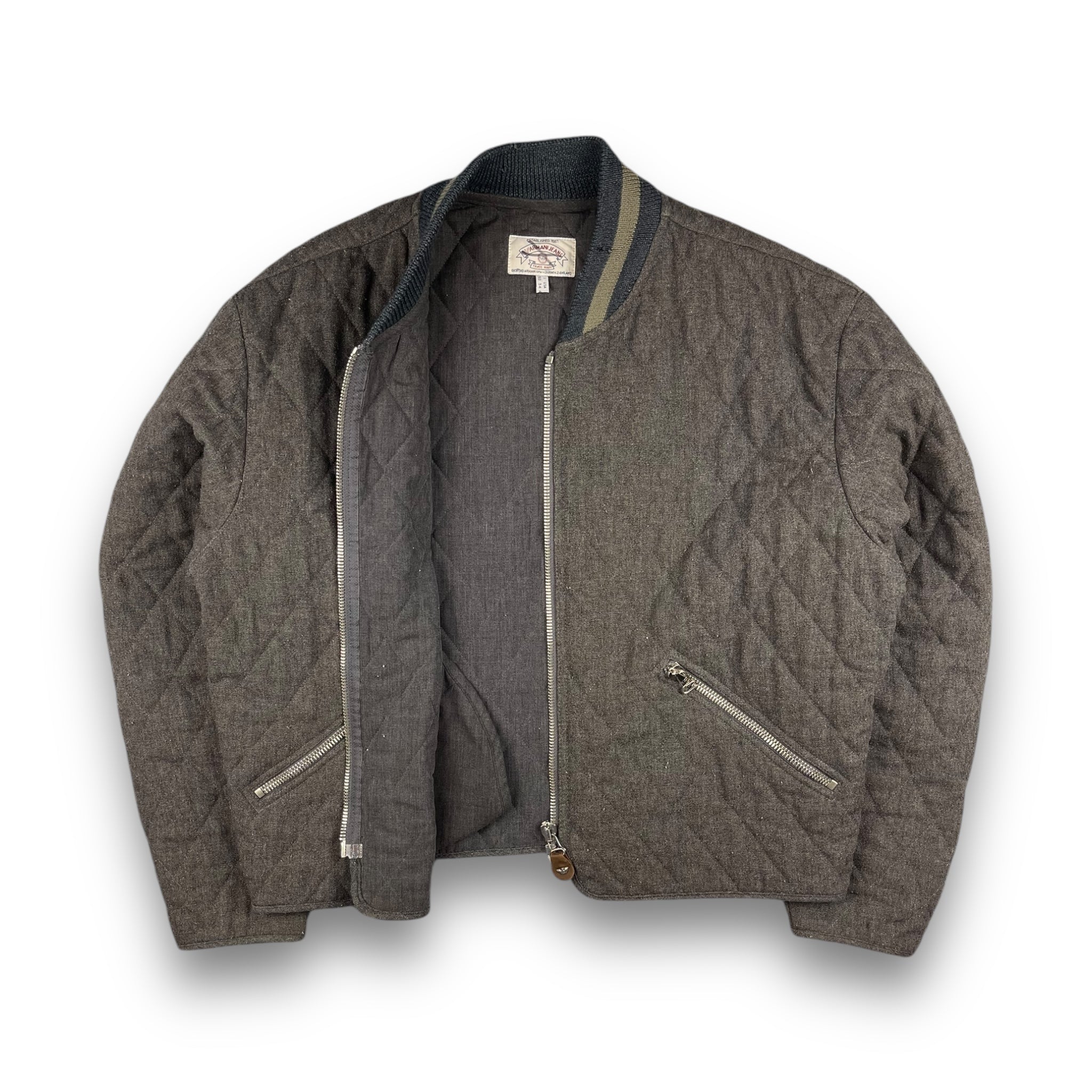 Quilted grey wool with a chunky khaki/navy collar, lampo zipper & branded leather pull tab.