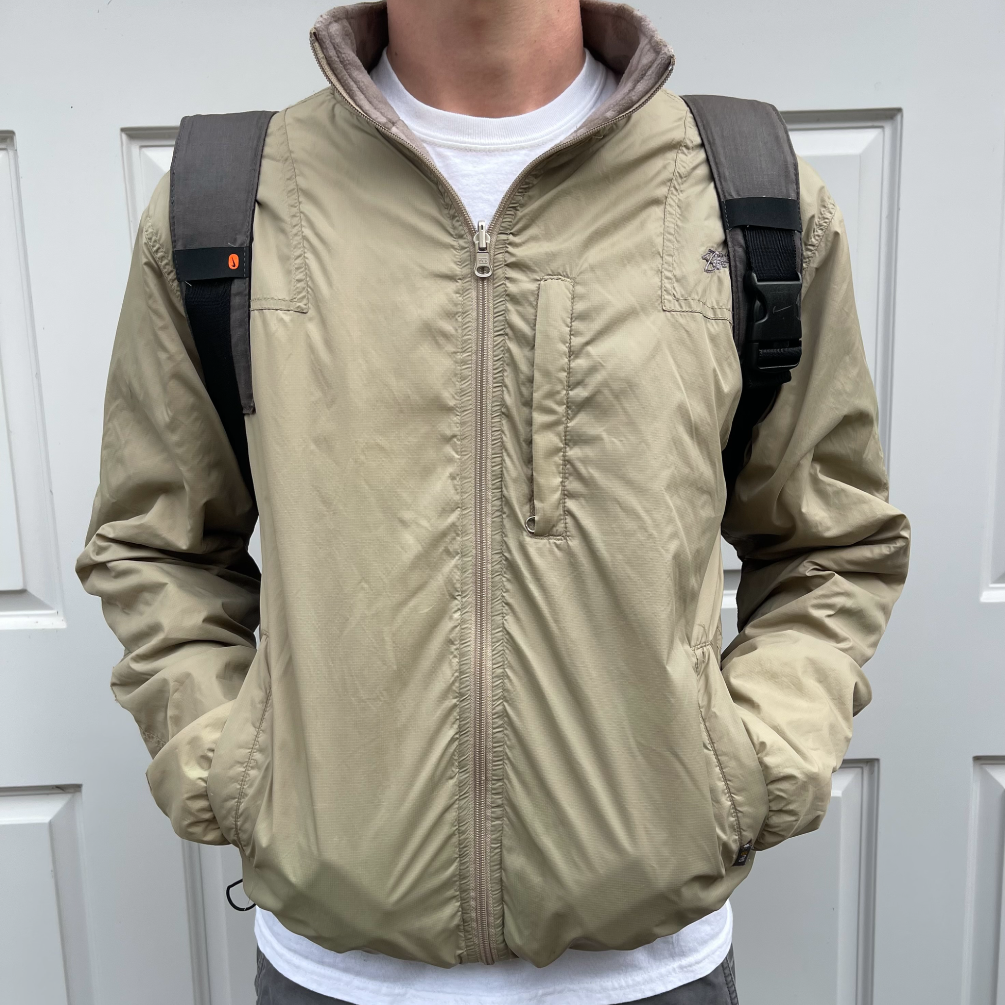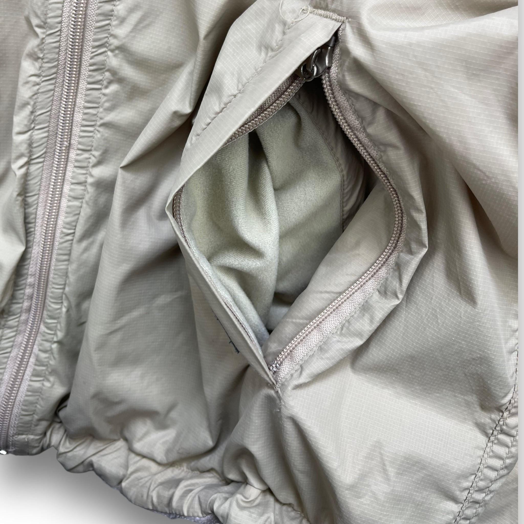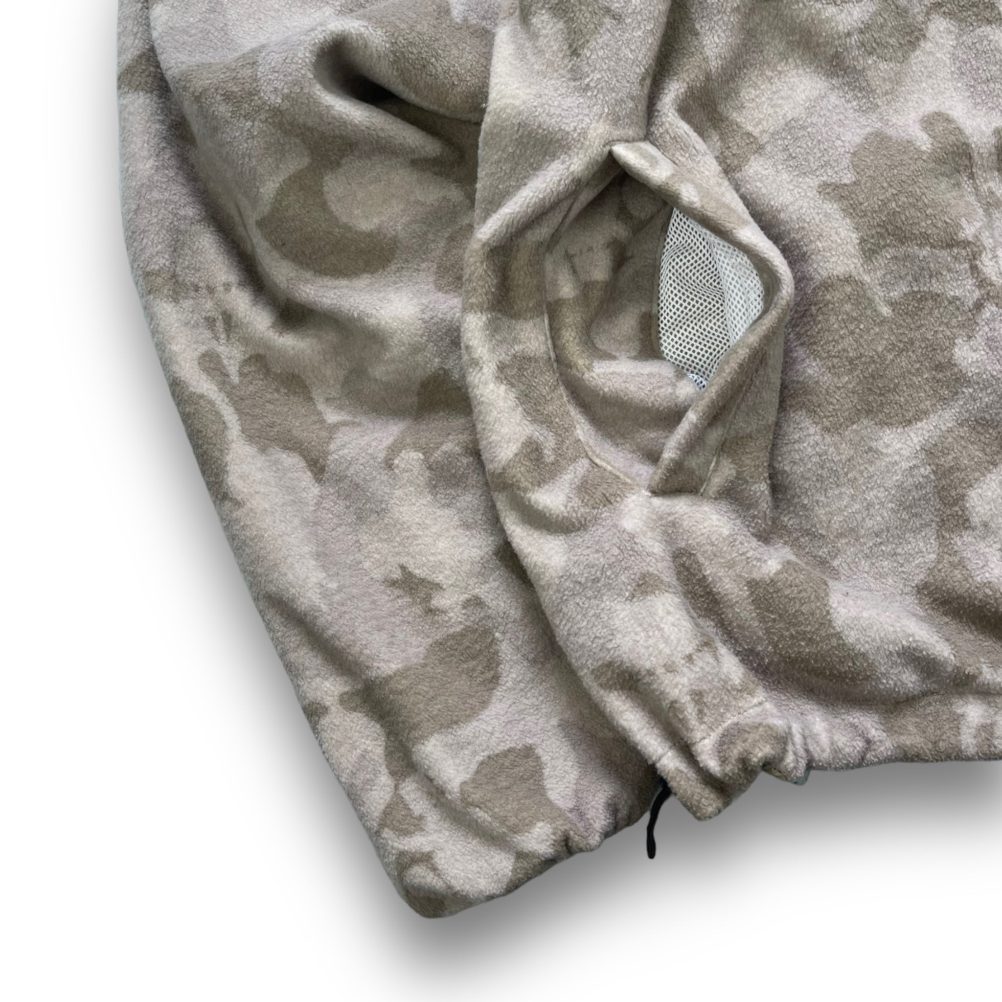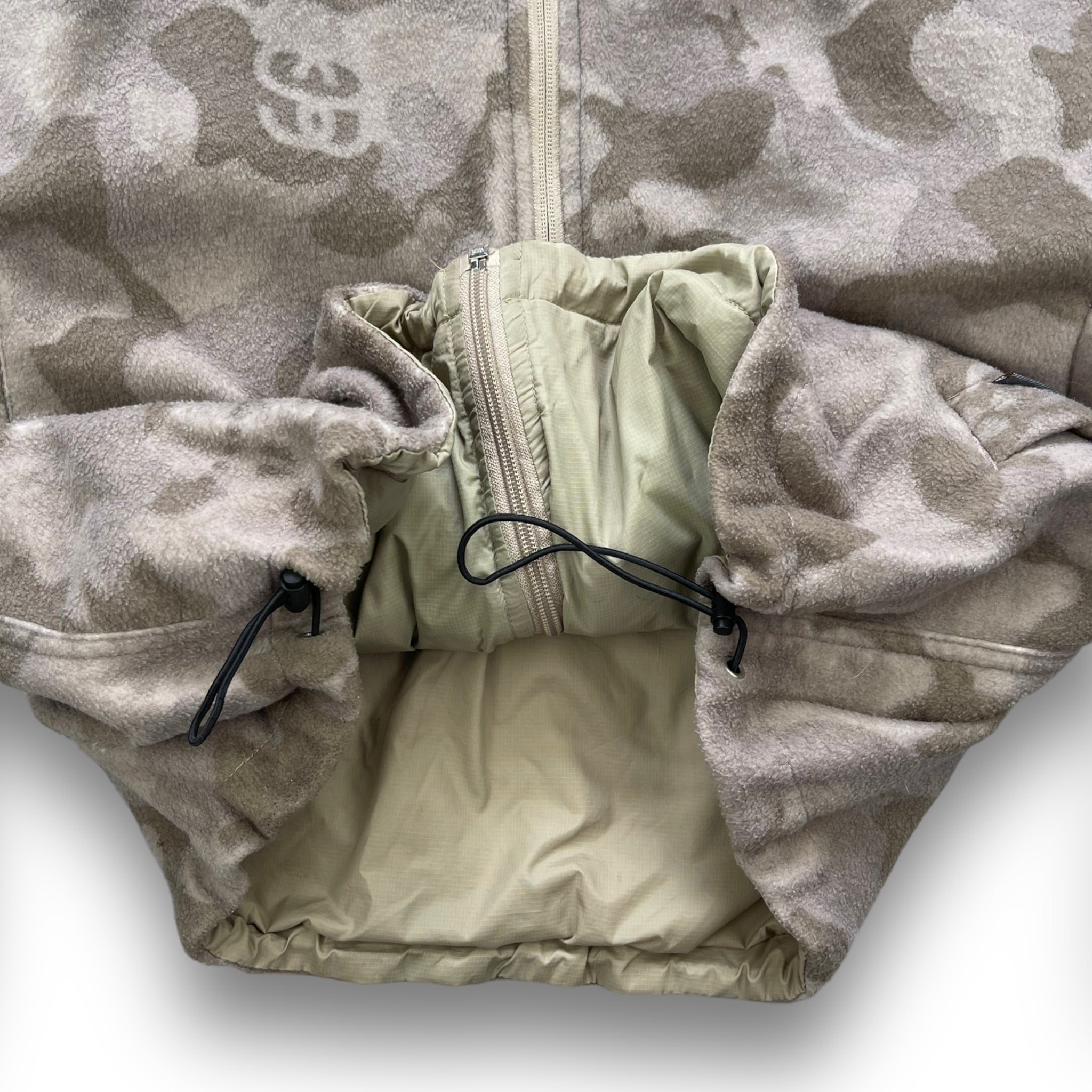 One side is a soft desert camo fleece, featuring double S logo & skull & crossbones graphic, the other is a lightweight ripstop fabric. Has 2 pockets on each side, elasticated waistband & subtle Stussy branding.