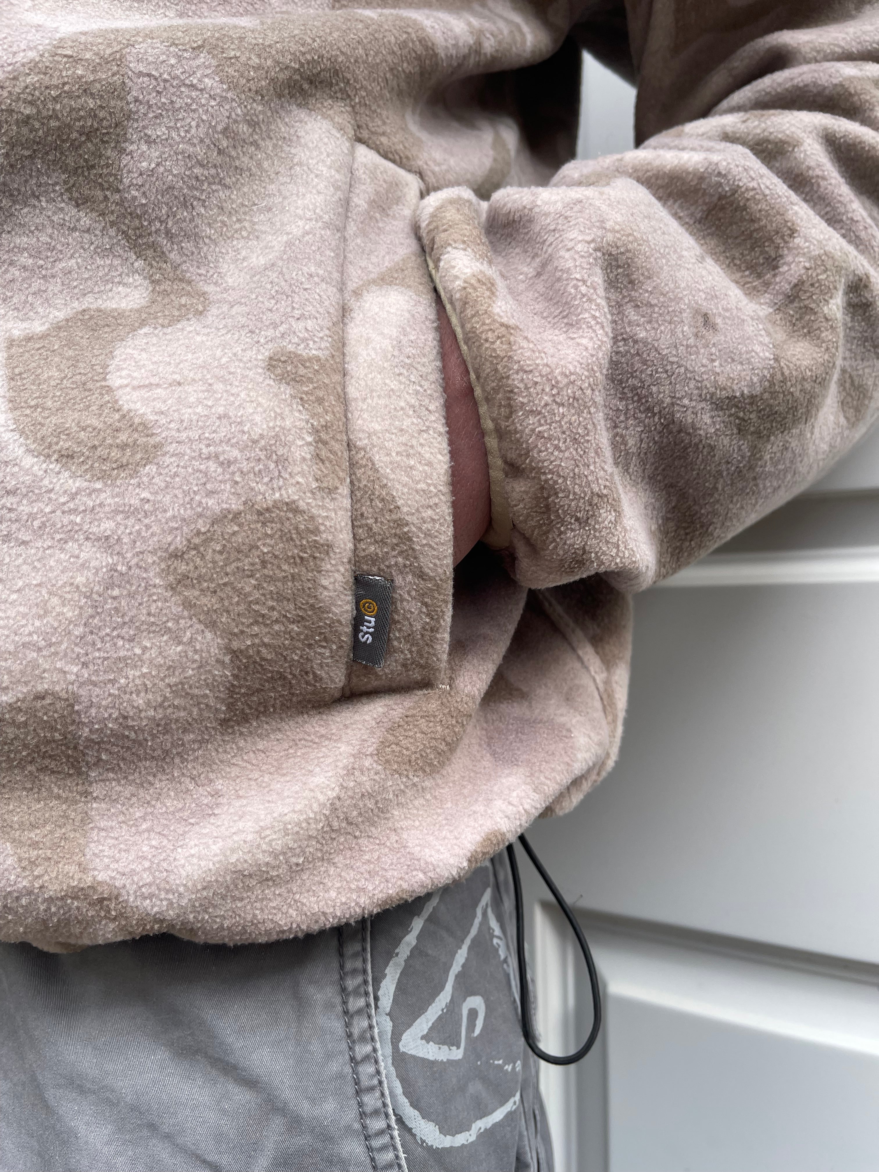 One side is a soft desert camo fleece, featuring double S logo & skull & crossbones graphic, the other is a lightweight ripstop fabric. Has 2 pockets on each side, elasticated waistband & subtle Stussy branding.