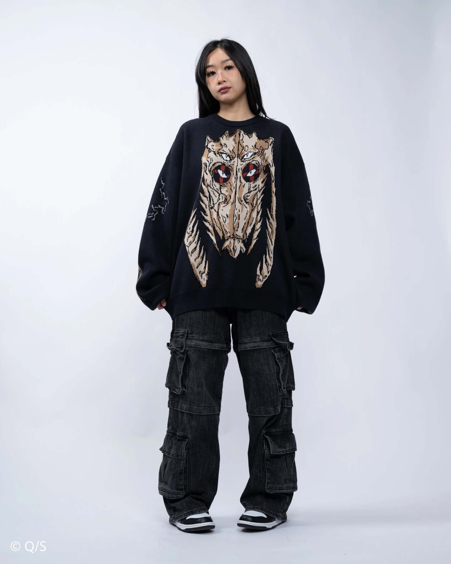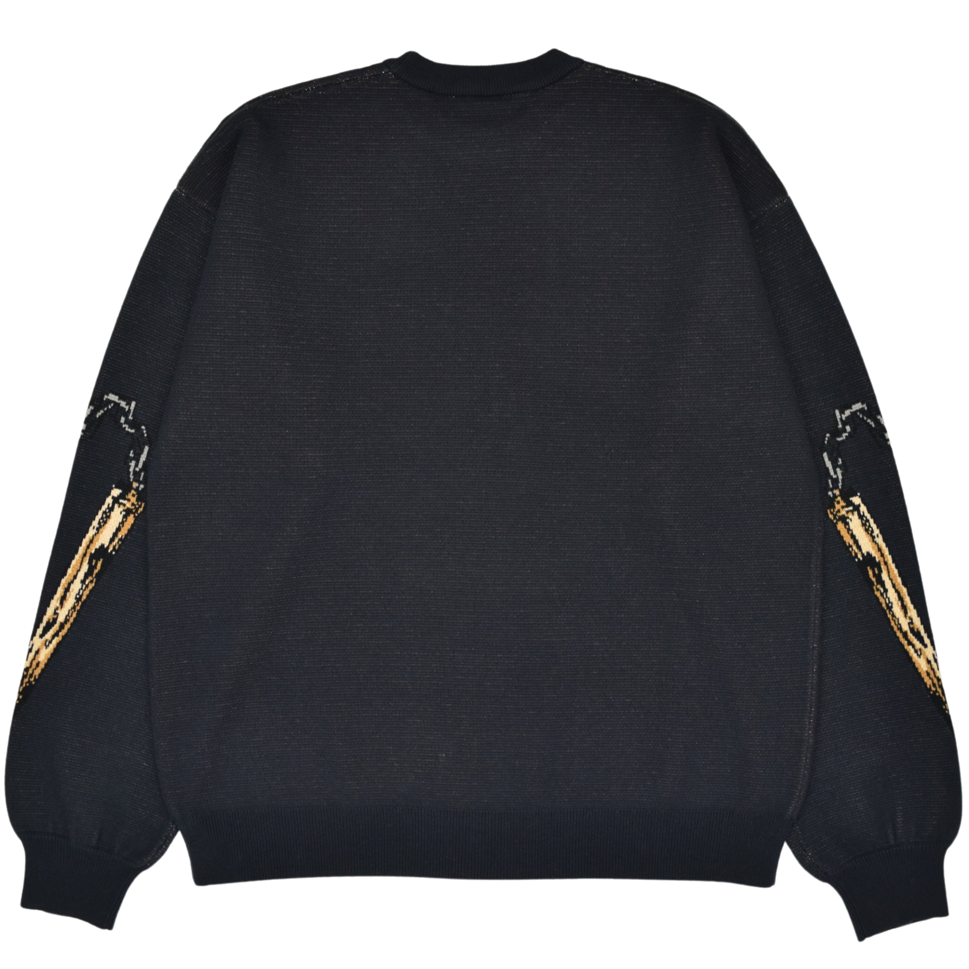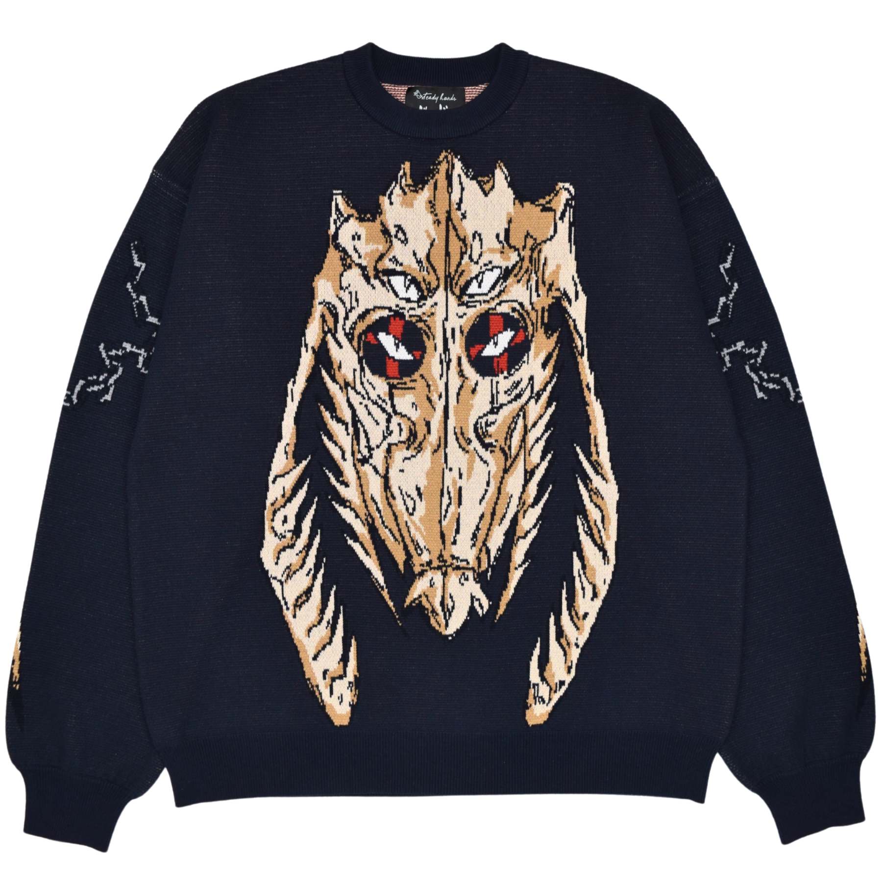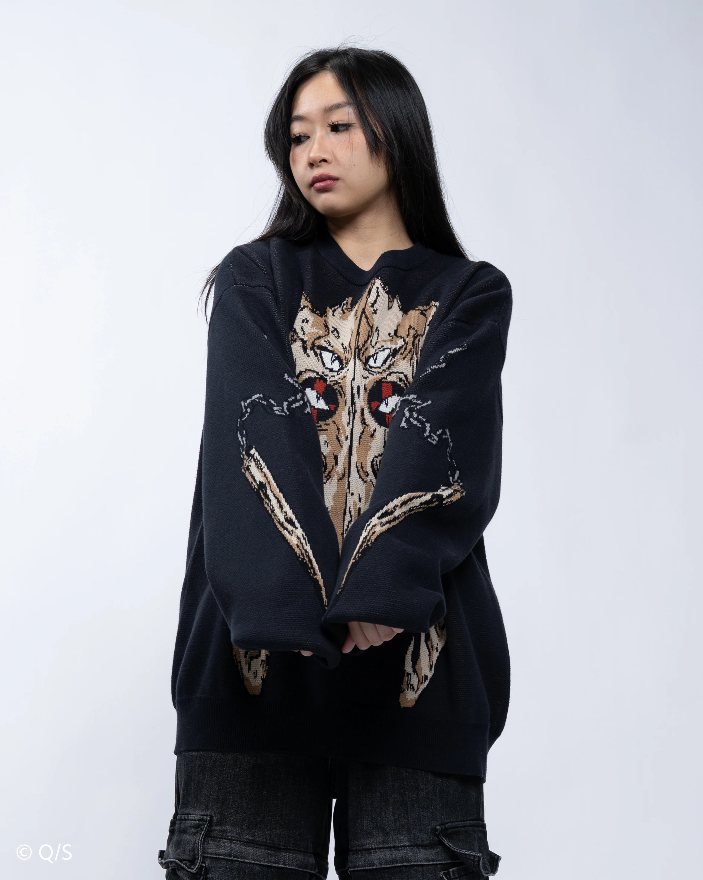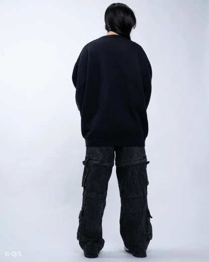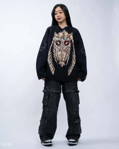 The sweaters use the same sizing for construction as our standard knit sweaters, but due to the difference in material, they WILL FIT SLIGHTLY LESS OVERSIZED.