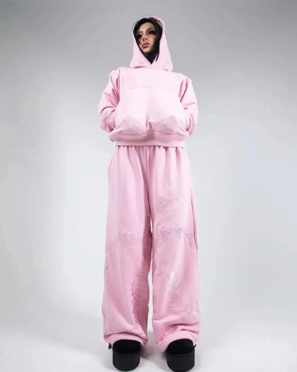 Details: Oversized hood & pocket on hoodie, embroidered back pocket on sweats, internal drawstrings at waistband & leg opening