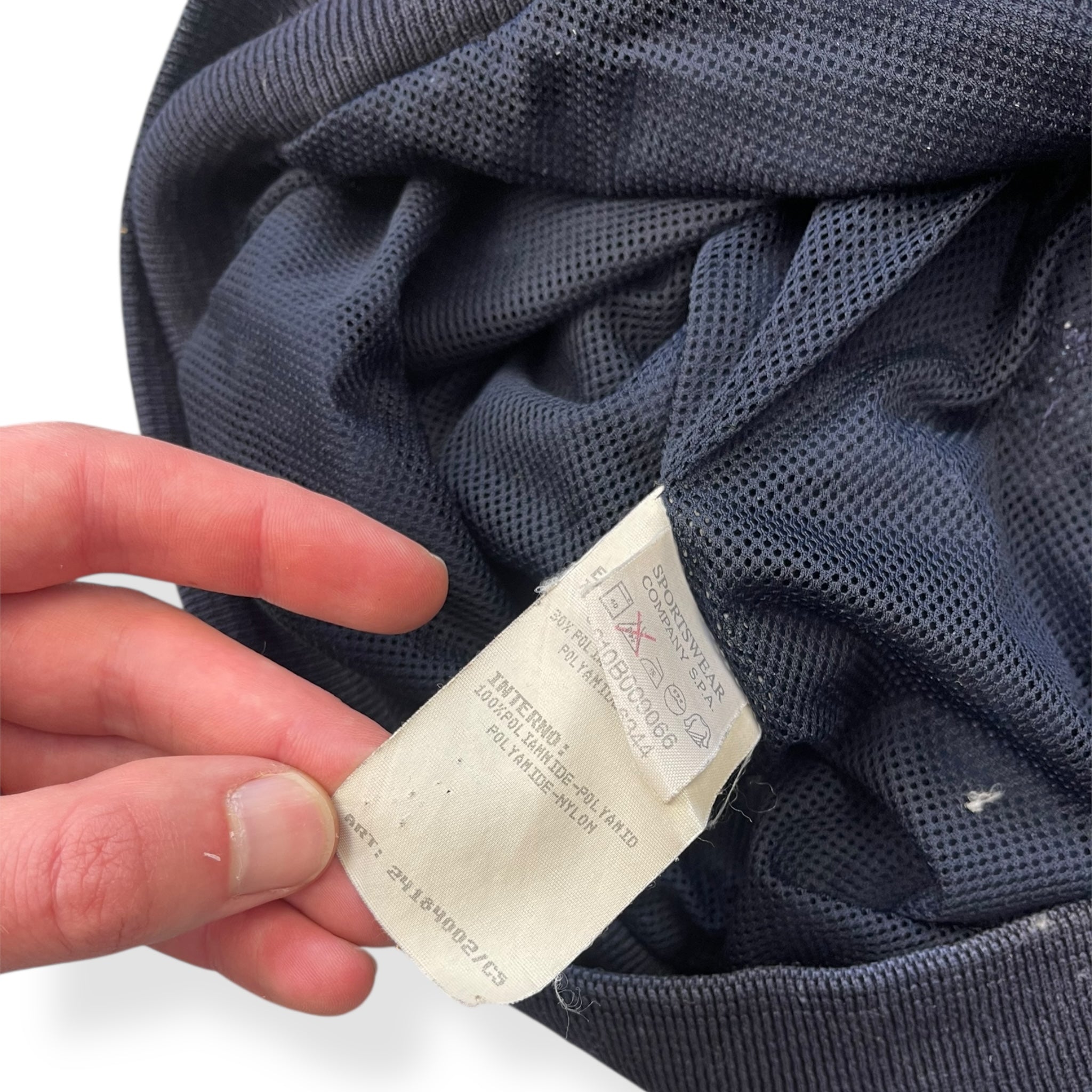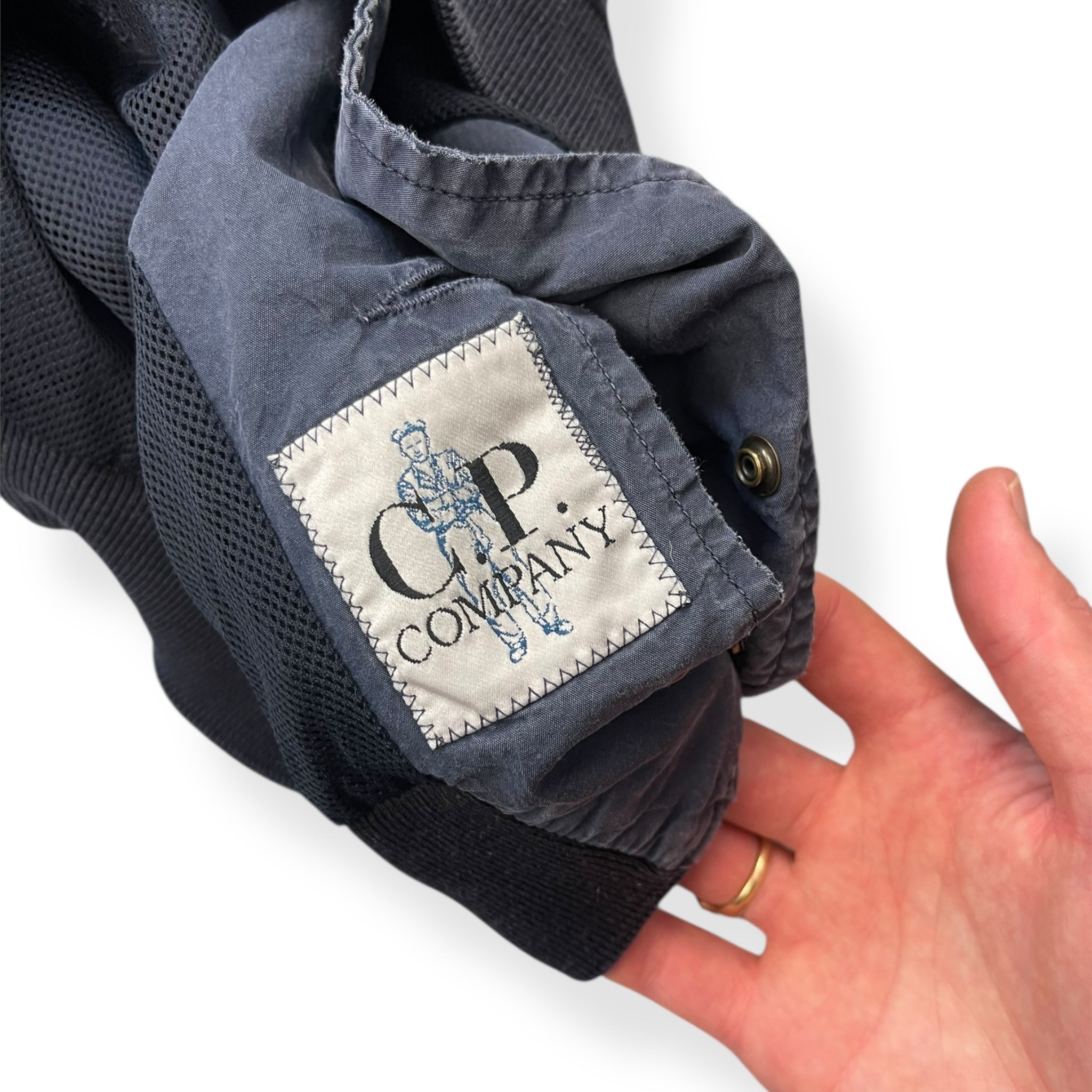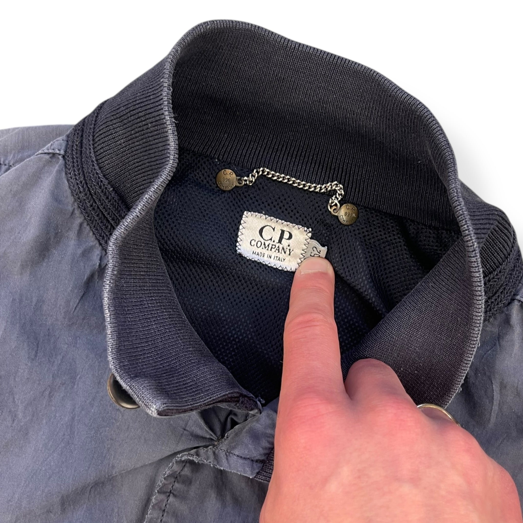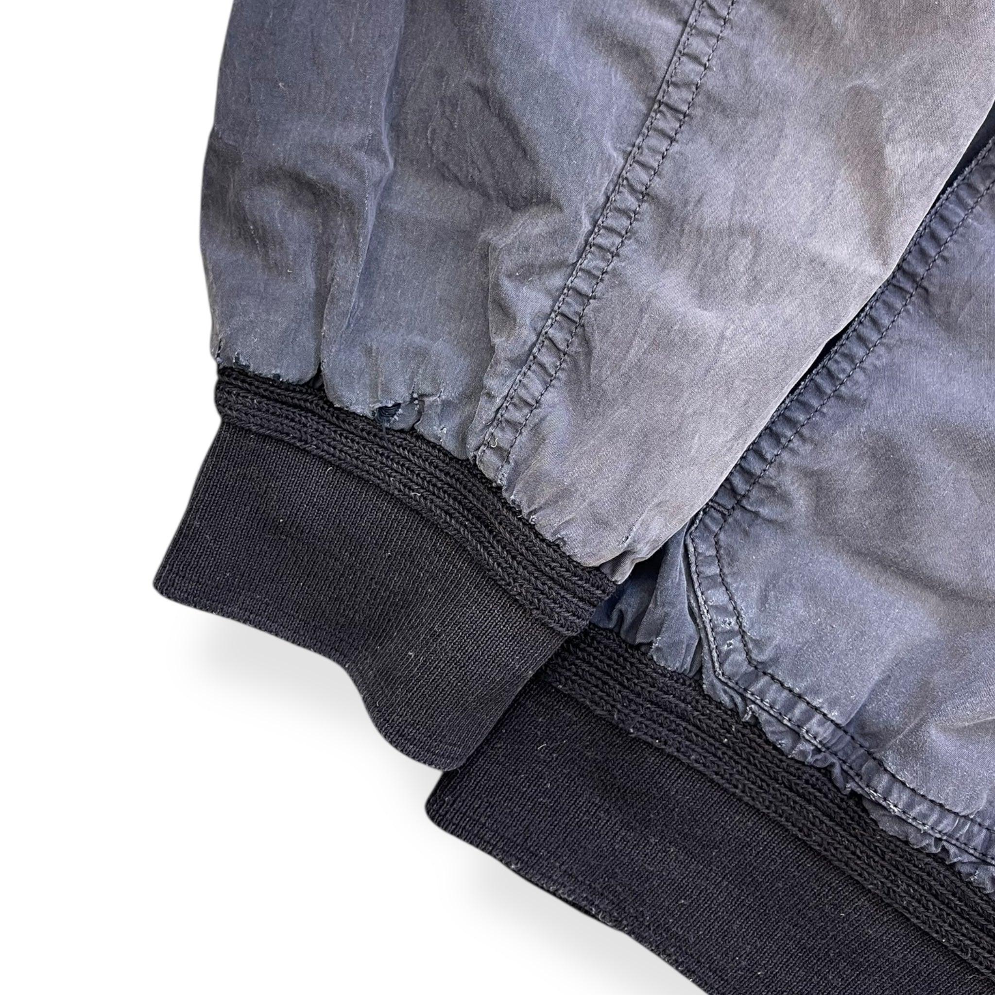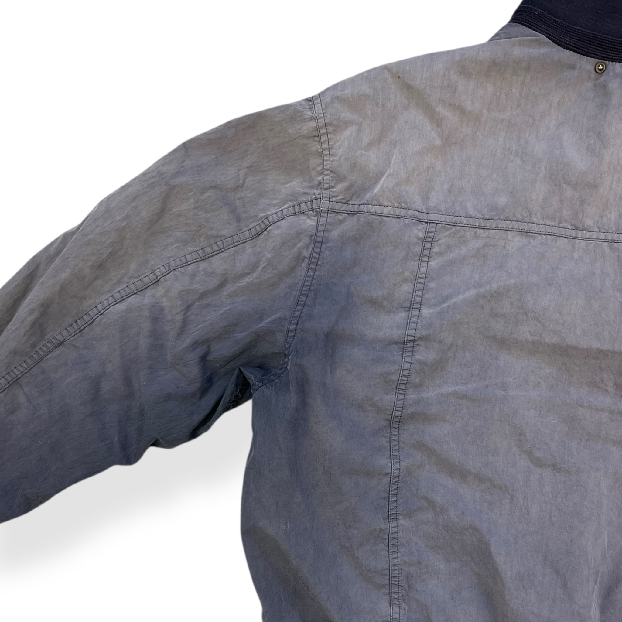 Navy blue colourway that has been subjected to alot of sunlight, causing it to fade really nicely over time. Buttoned closure, 2 large buttoned front pockets, soft cotton collar, cuffs & waist hem.