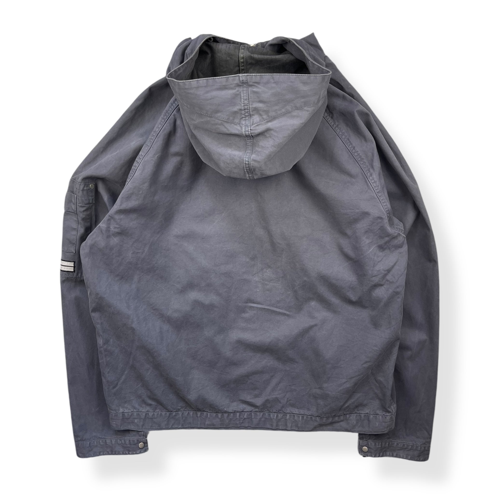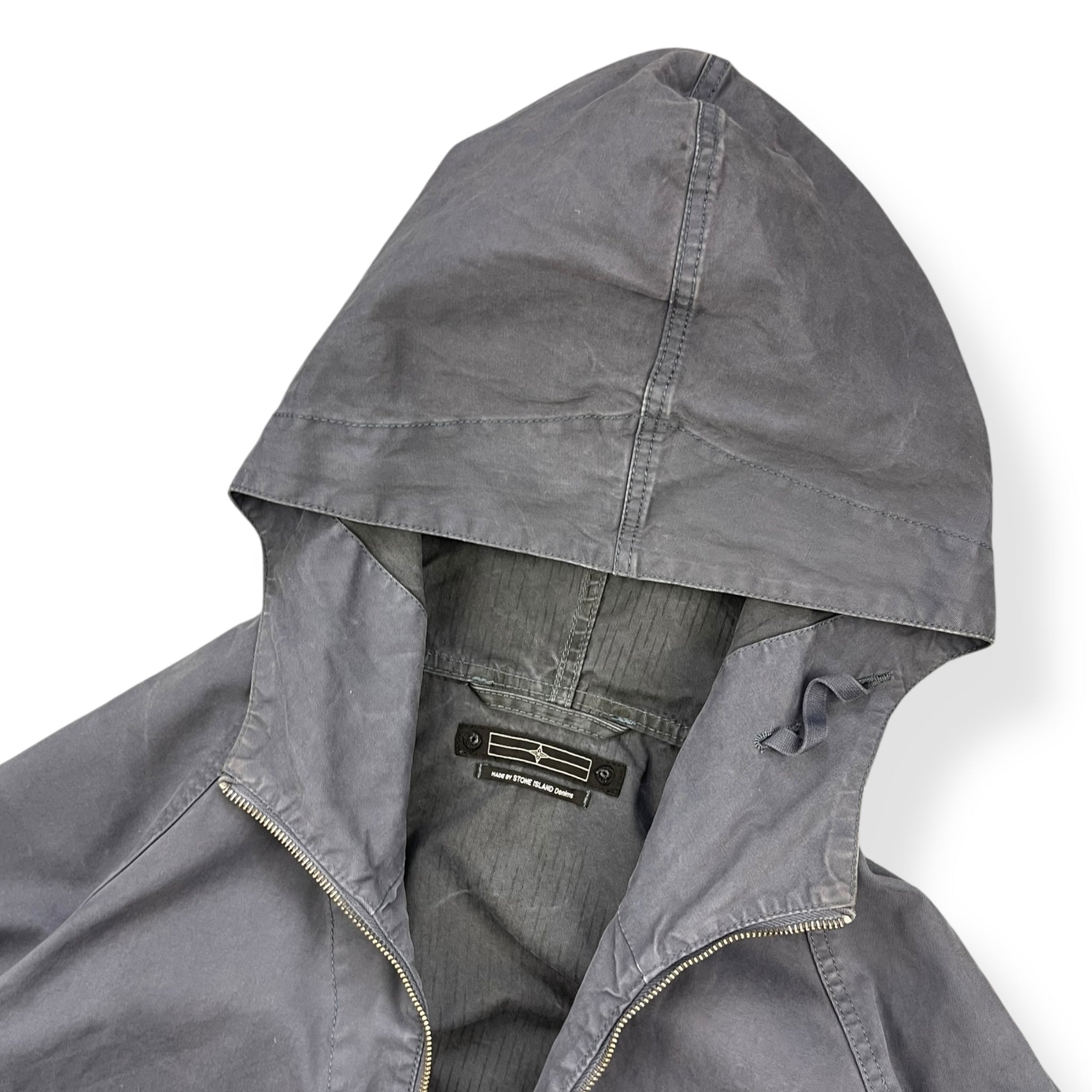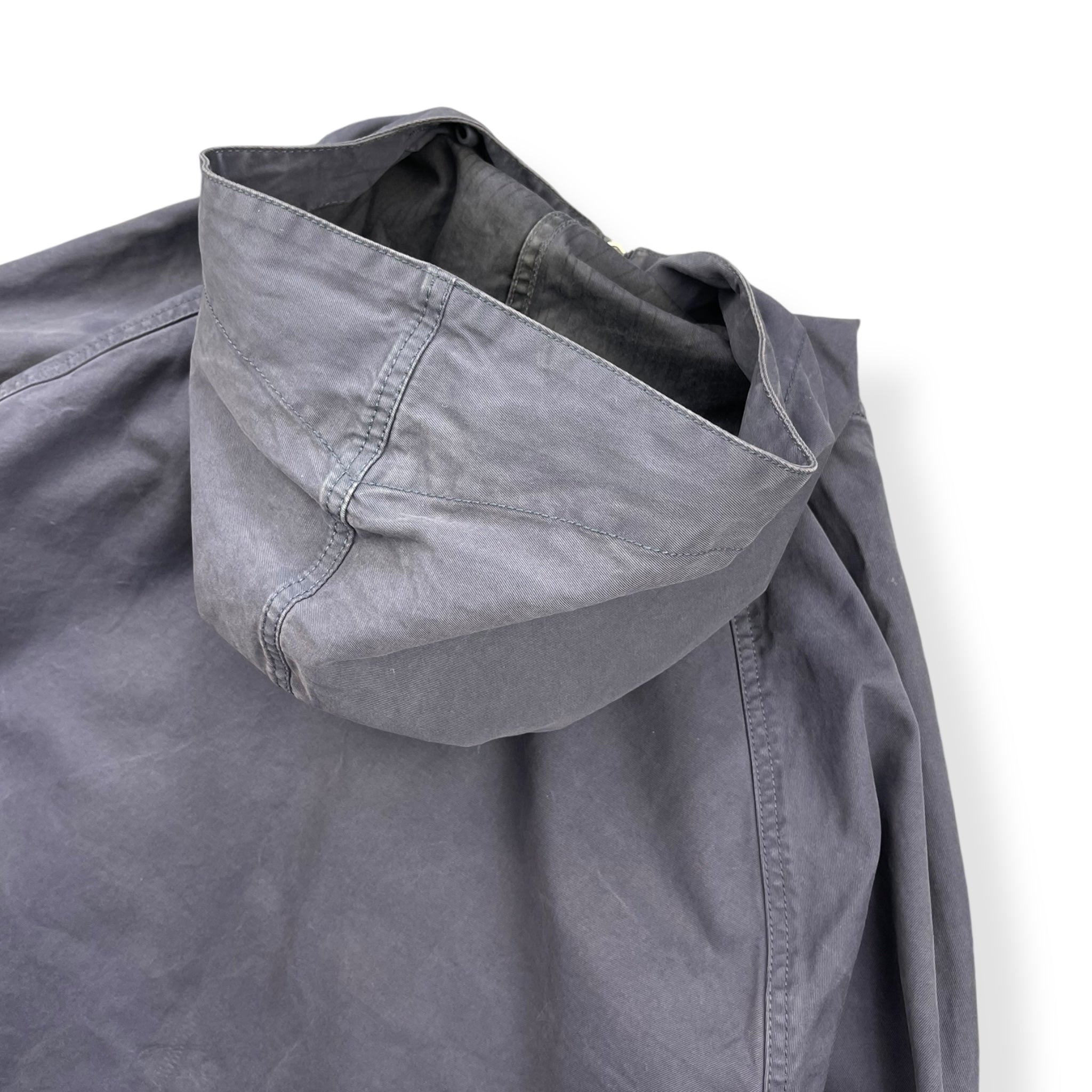 Faded navy exterior with a lovely rain strait camouflage interior lining. Really nice shape & construction with visible stitching details throughout, denims patch on the left sleeve with stash buttoned pocket & large spacious hood.