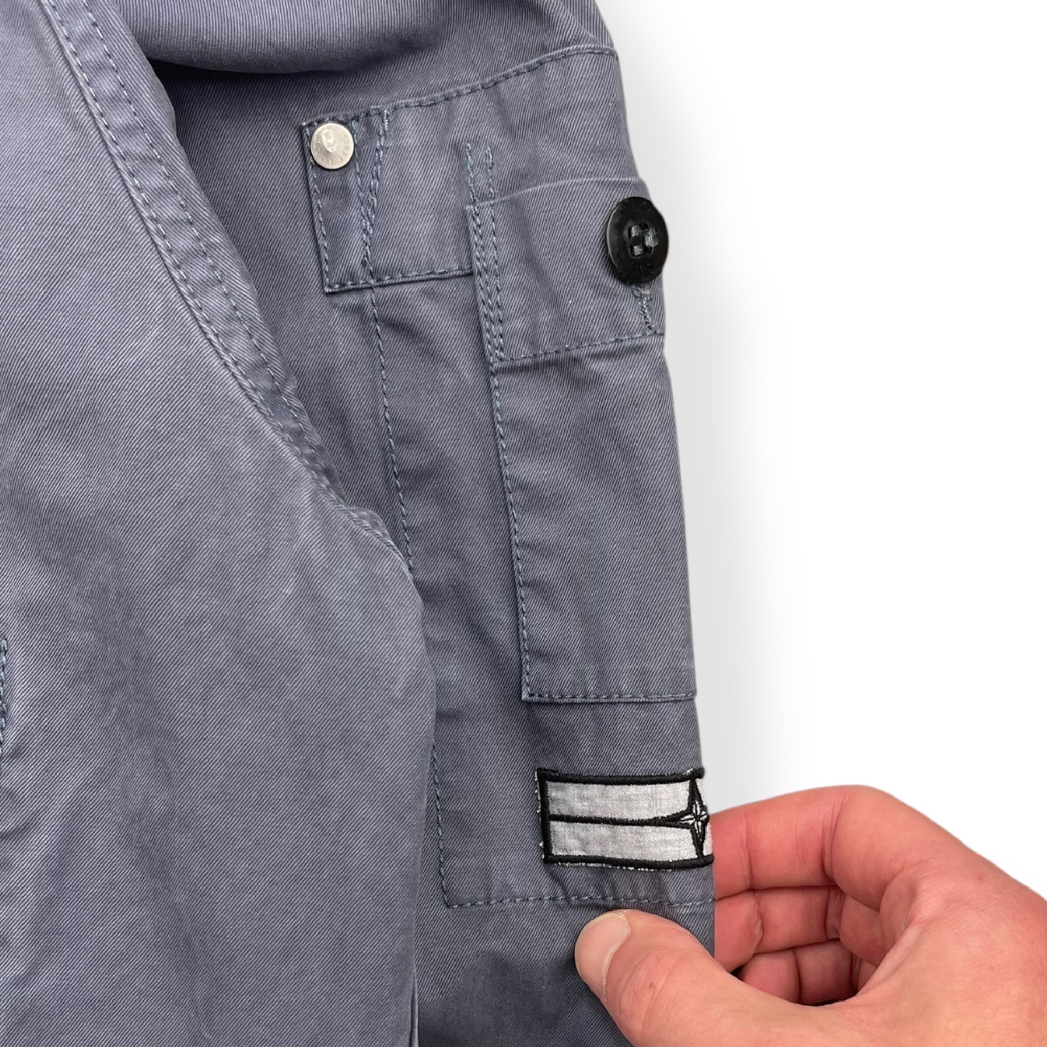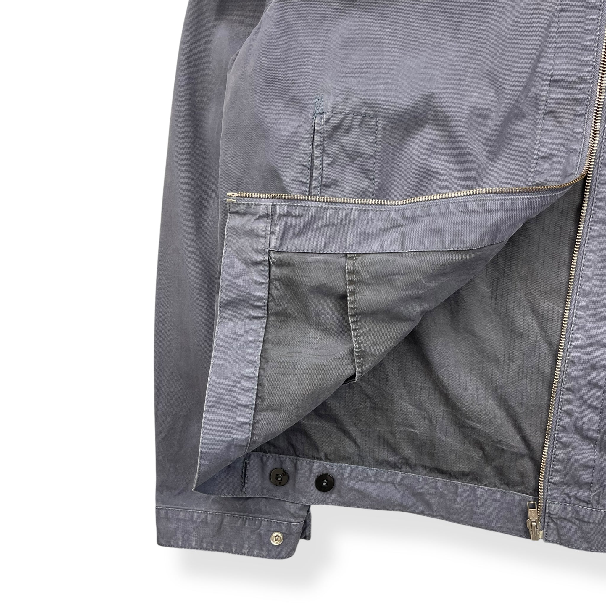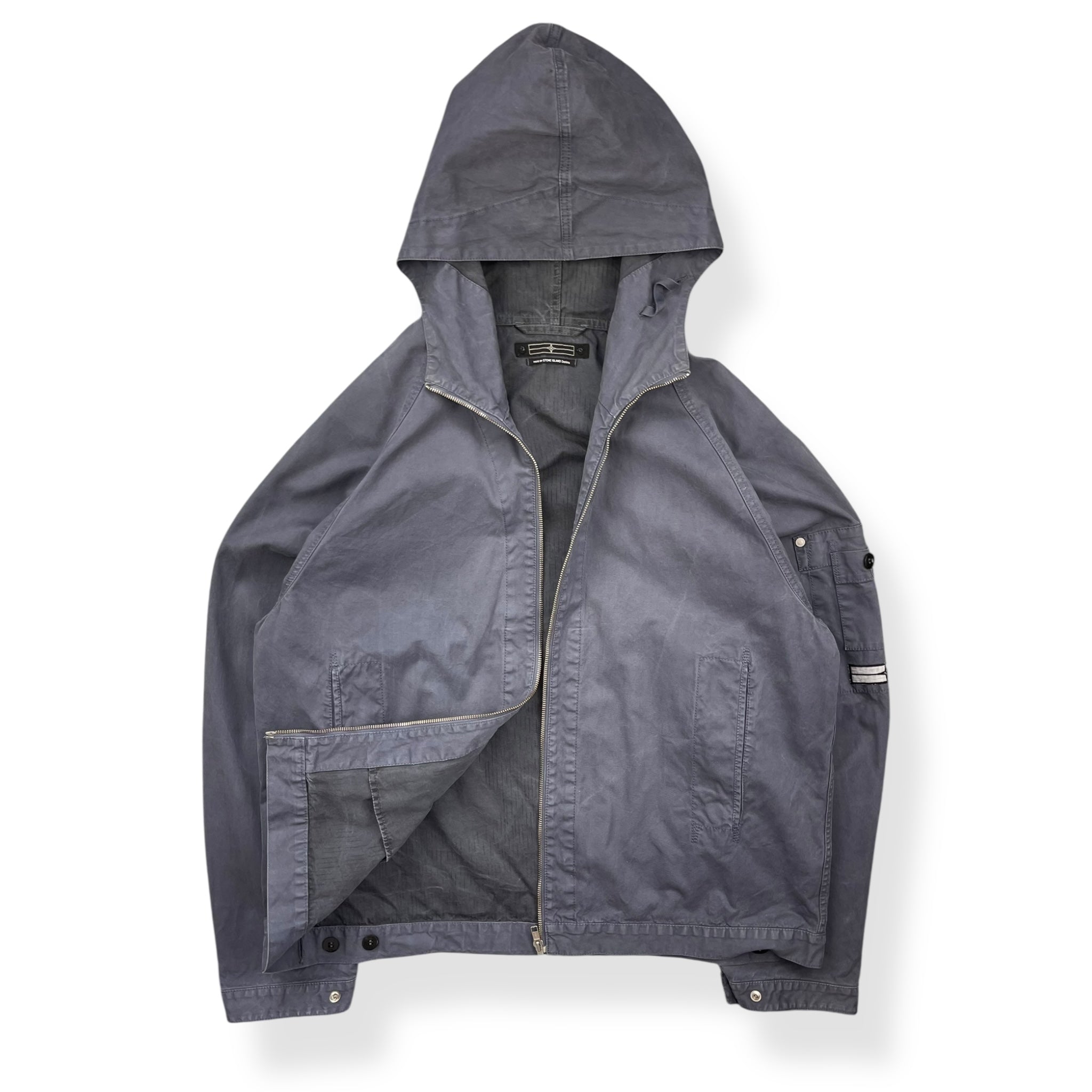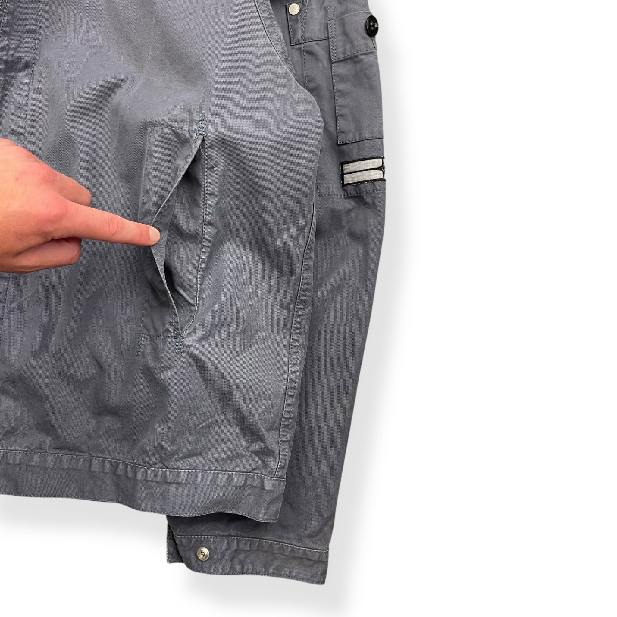 Faded navy exterior with a lovely rain strait camouflage interior lining. Really nice shape & construction with visible stitching details throughout, denims patch on the left sleeve with stash buttoned pocket & large spacious hood.