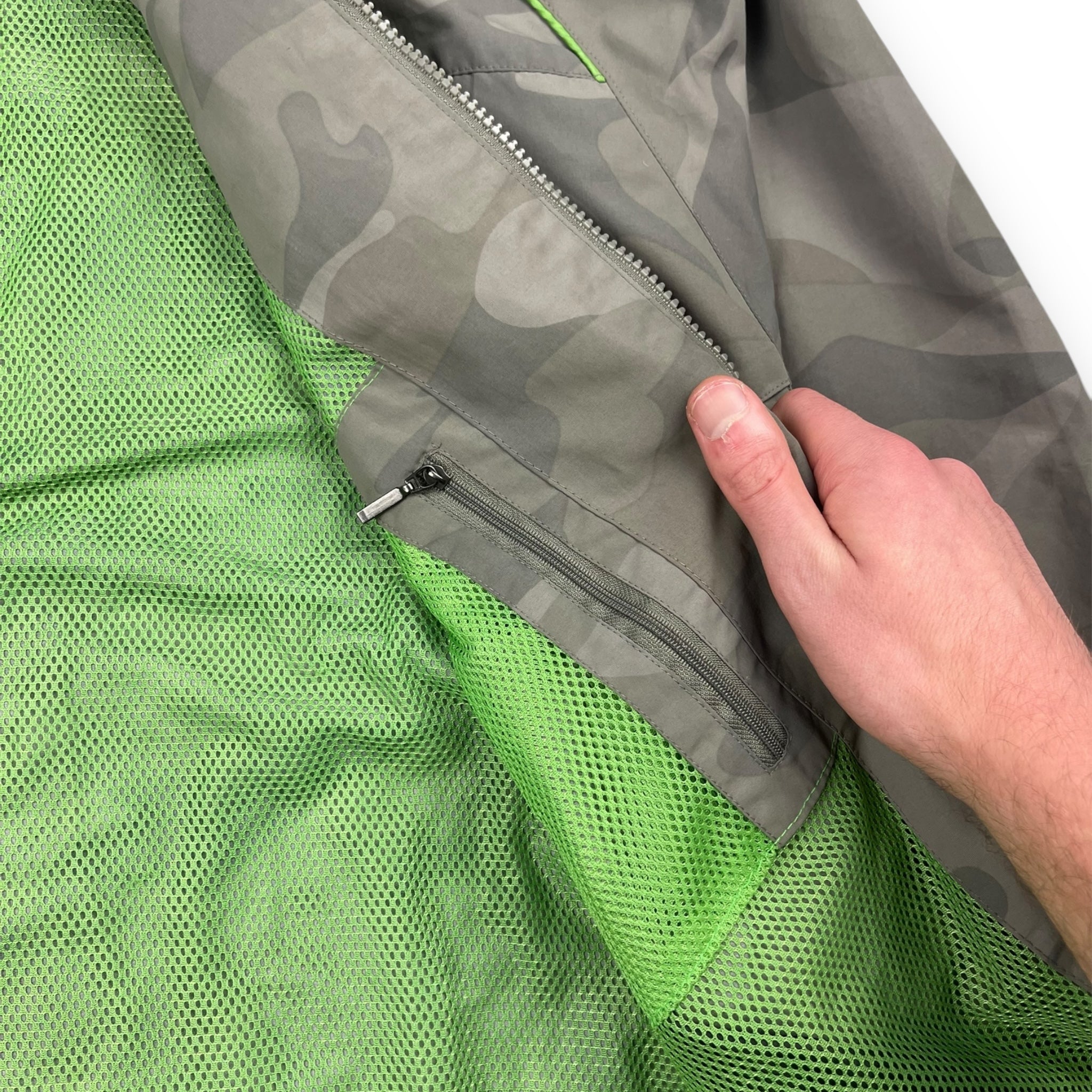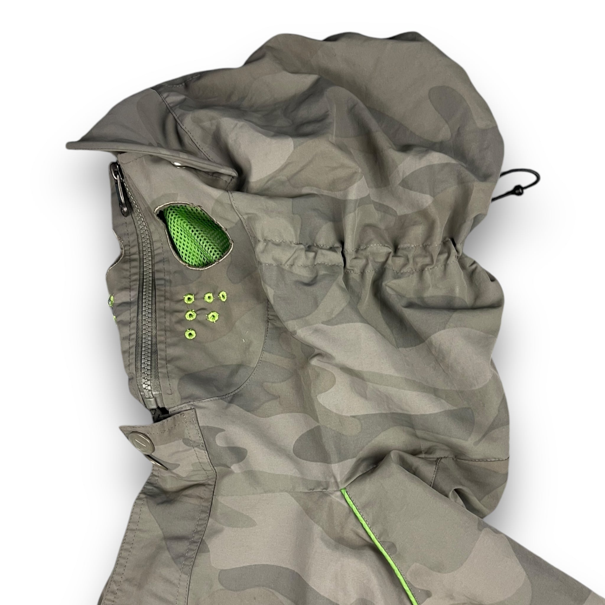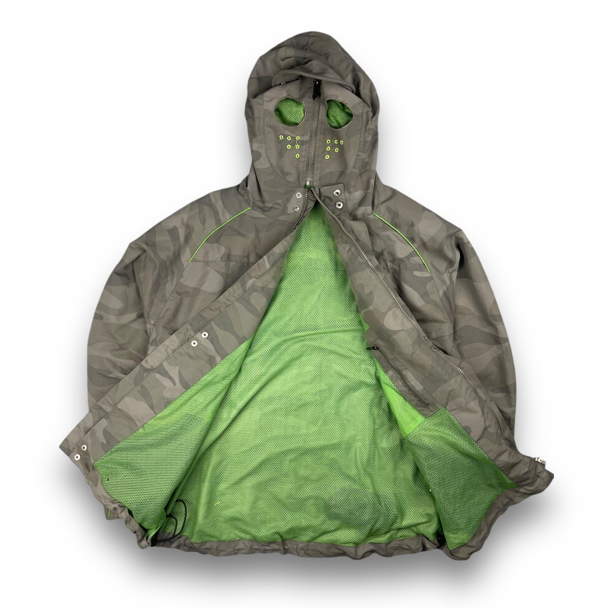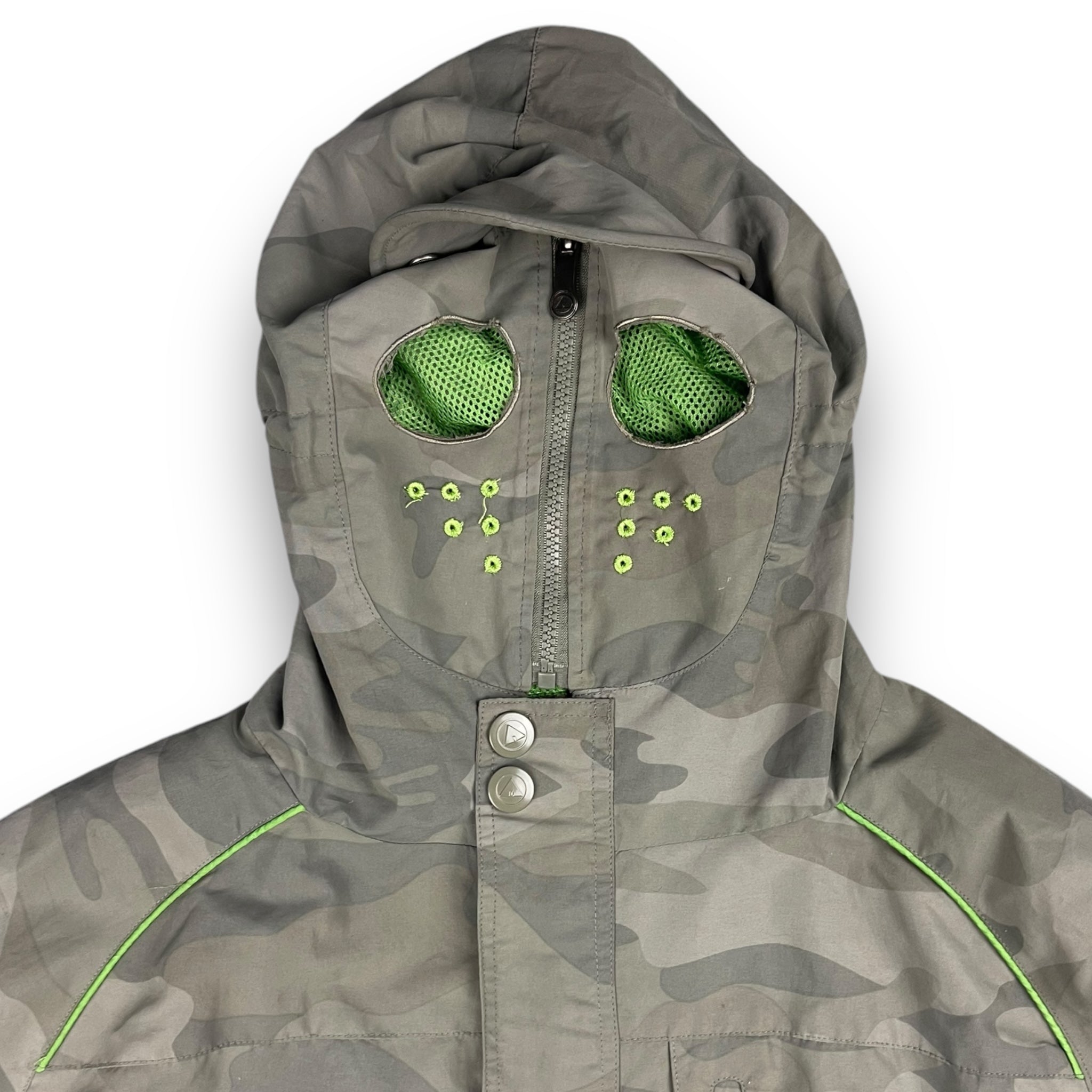 Full face mask zip with eye holes. Elasticated waist hem, snow skirt & mesh interior stash pocket.